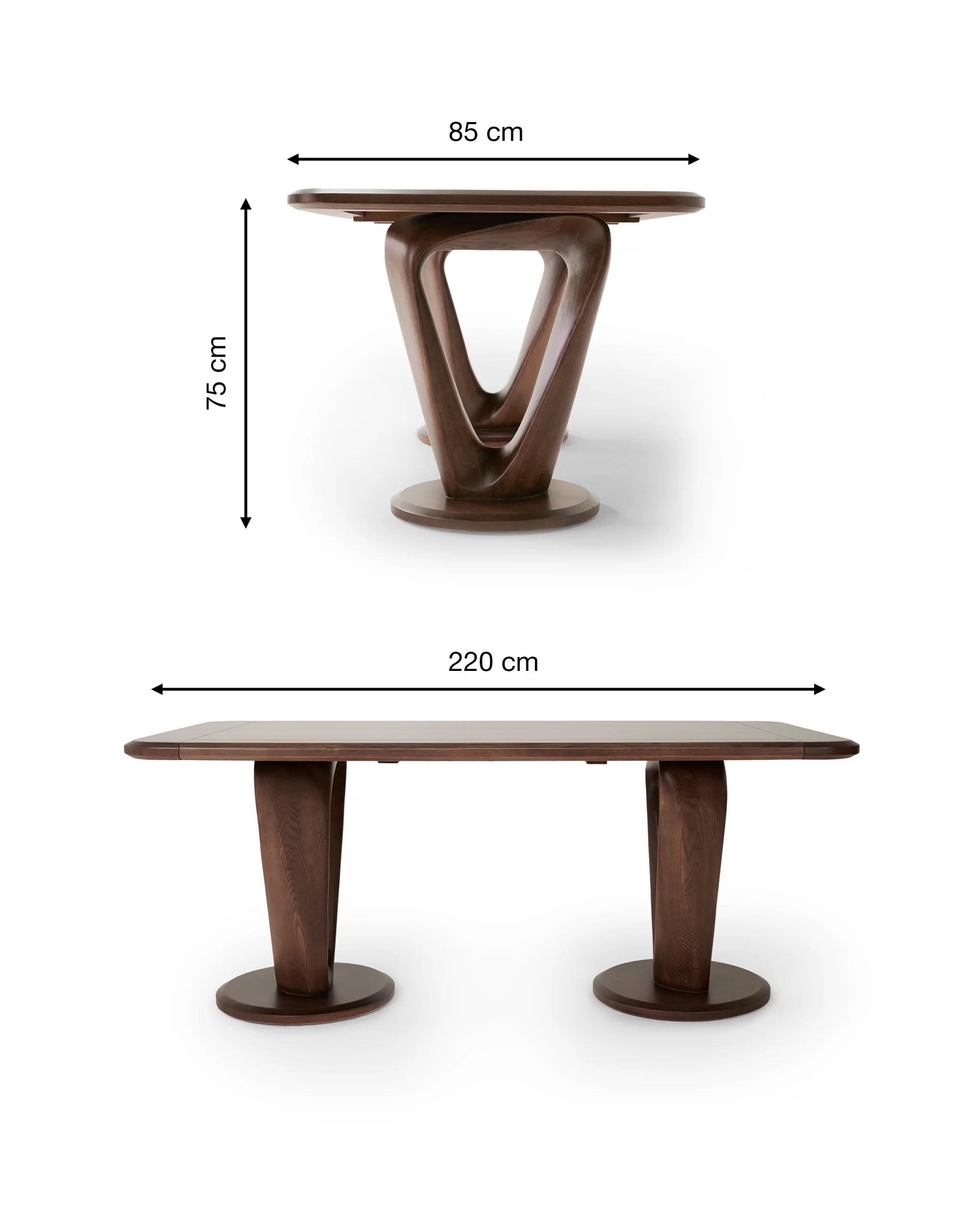 - Bàn ăn gỗ Sồi trắng MBM-DT01 có mặt bàn chữ nhật bo tròn bốn góc, mép vát nhẹ giúp giảm cảm giác nặng khối và dễ chịu khi tì tay. Dưới mặt bàn là hai chân đôi tạo hình chữ V rỗng, liên kết với đế tròn đặc, vừa tạo thế đứng vững chãi vừa giữ không gian để chân thoáng và dễ kê ghế. Tông nâu trầm trên nền vân Sồi trắng rõ nét mang lại cảm giác ấm áp, phù hợp cho cả phòng ăn gia đình lẫn không gian tiếp khách bán trang trọng (homestay, biệt thự mini, nhà phố…). Thiết kế chú trọng sự tròn trịa, liền mạch nên dễ phối với nhiều kiểu ghế khác nhau: từ ghế gỗ bọc nệm đến ghế vải hiện đại.