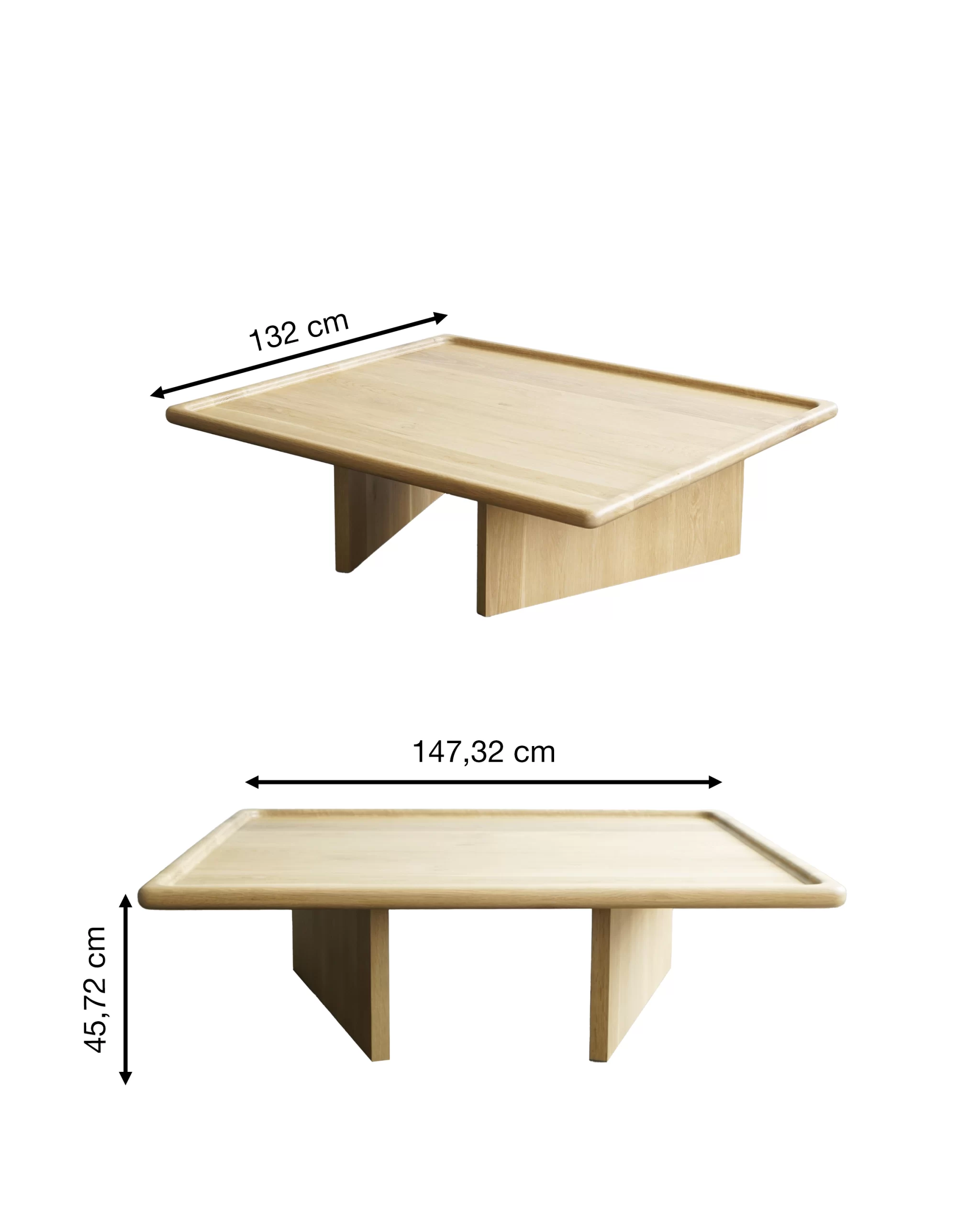 Bàn cà phê SANDOWN là một “sàn gỗ” ngoại cỡ giữa phòng khách. Mặt bàn vuông lớn được vát bo tròn toàn bộ viền, lõm nhẹ vào trong như một chiếc khay, giúp đồ đặt lên có cảm giác được ôm trọn. Hai chân bản dày chạy vuông góc tạo khối vững như một bệ đỡ kiến trúc, giữ cho tổng thể vừa tối giản vừa có sức nặng thị giác.
