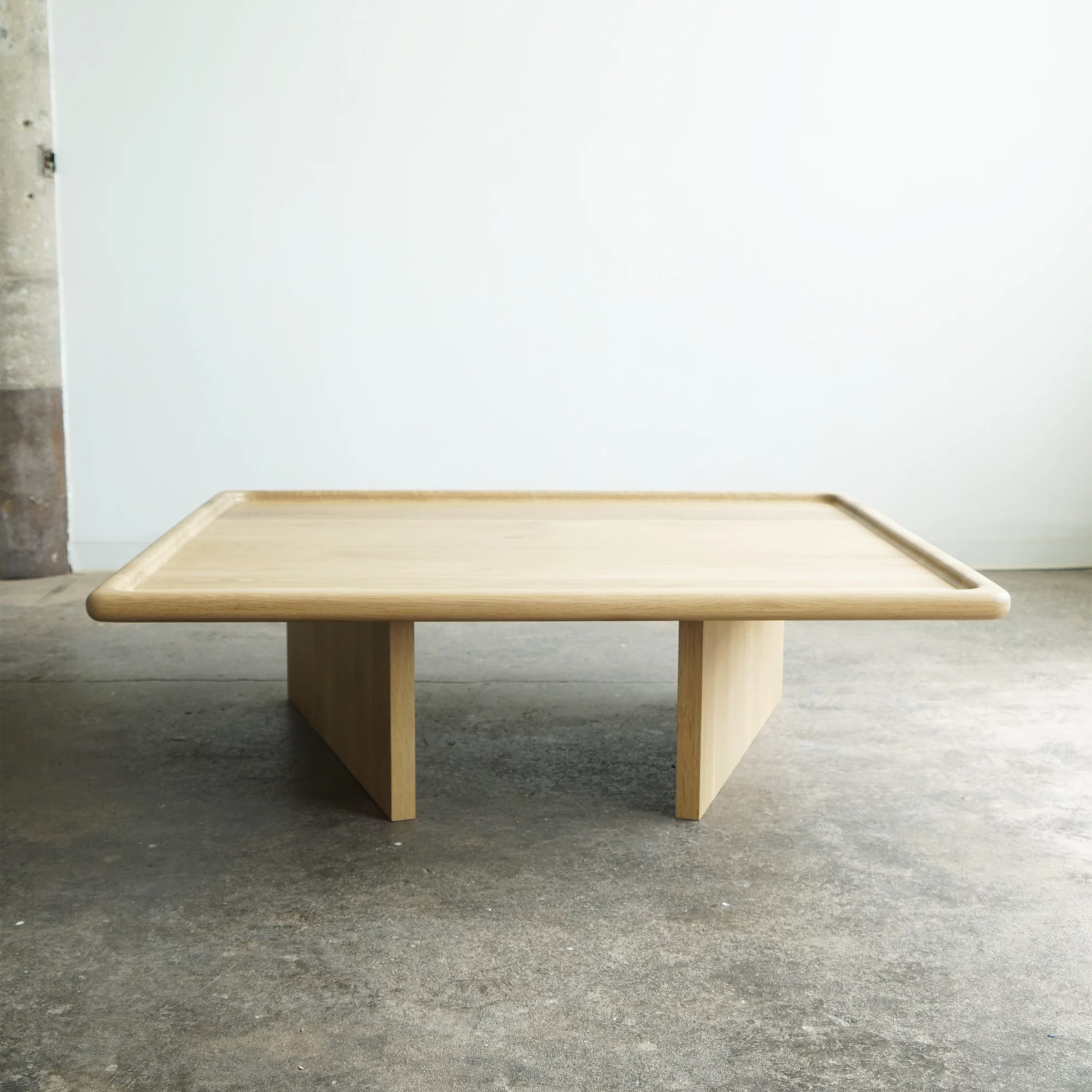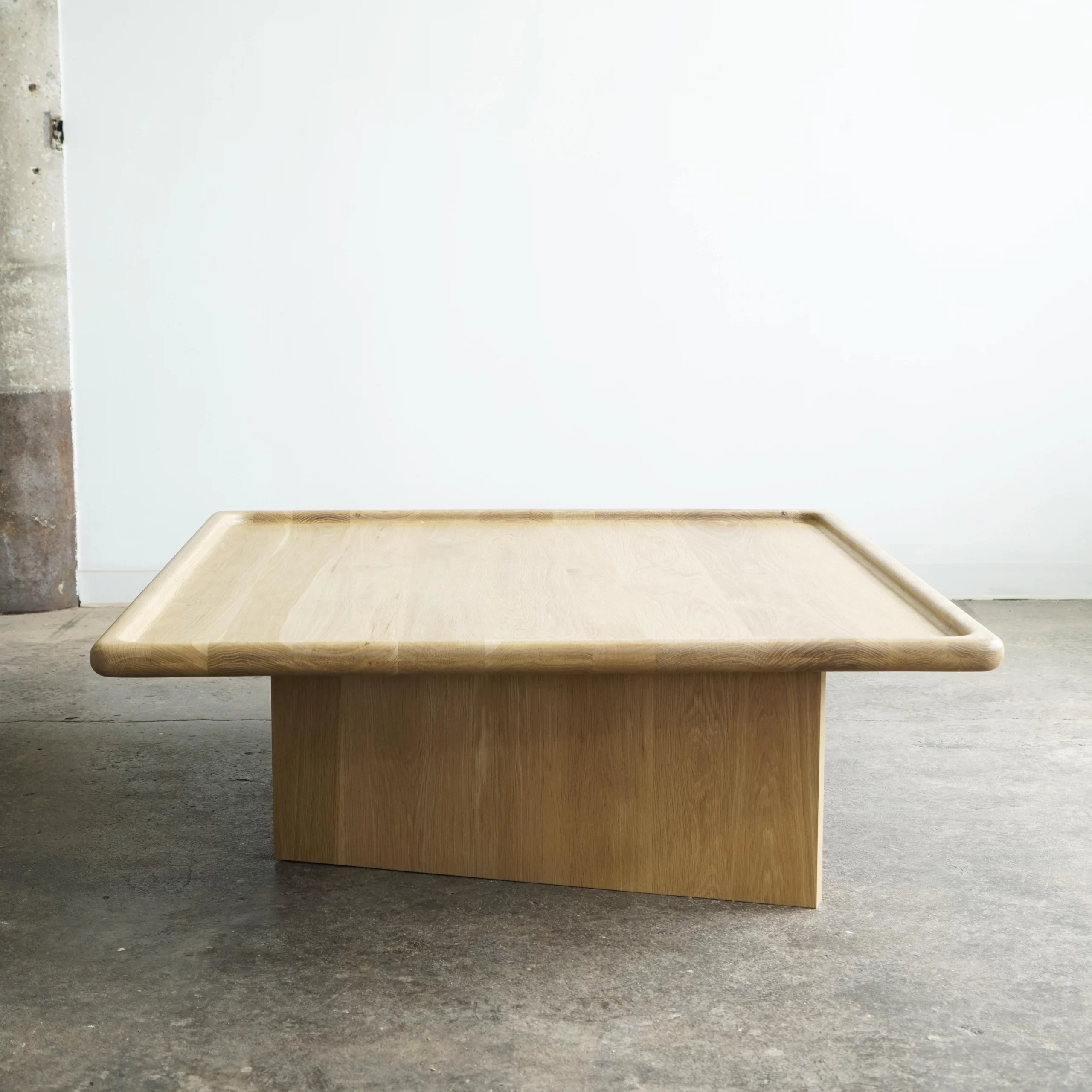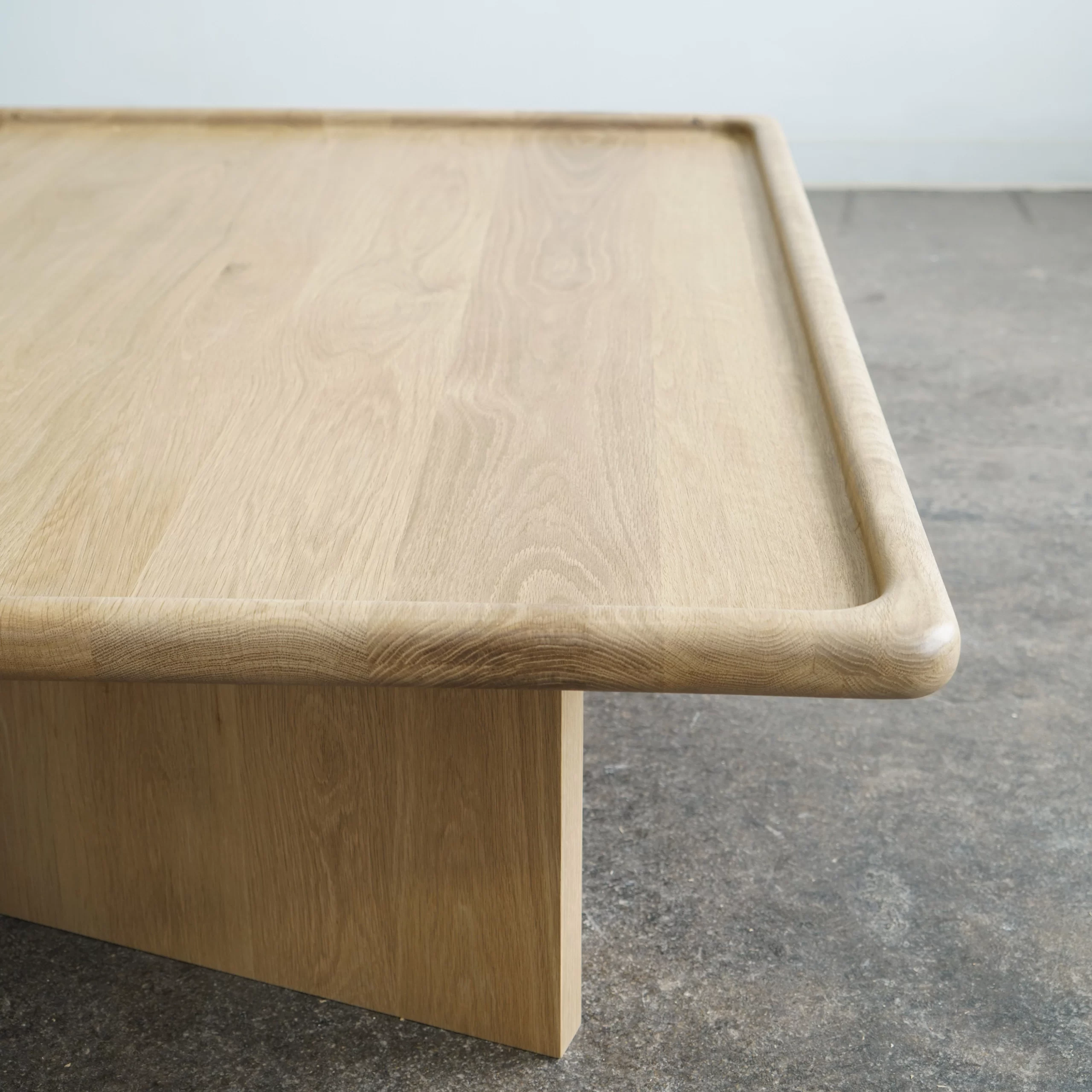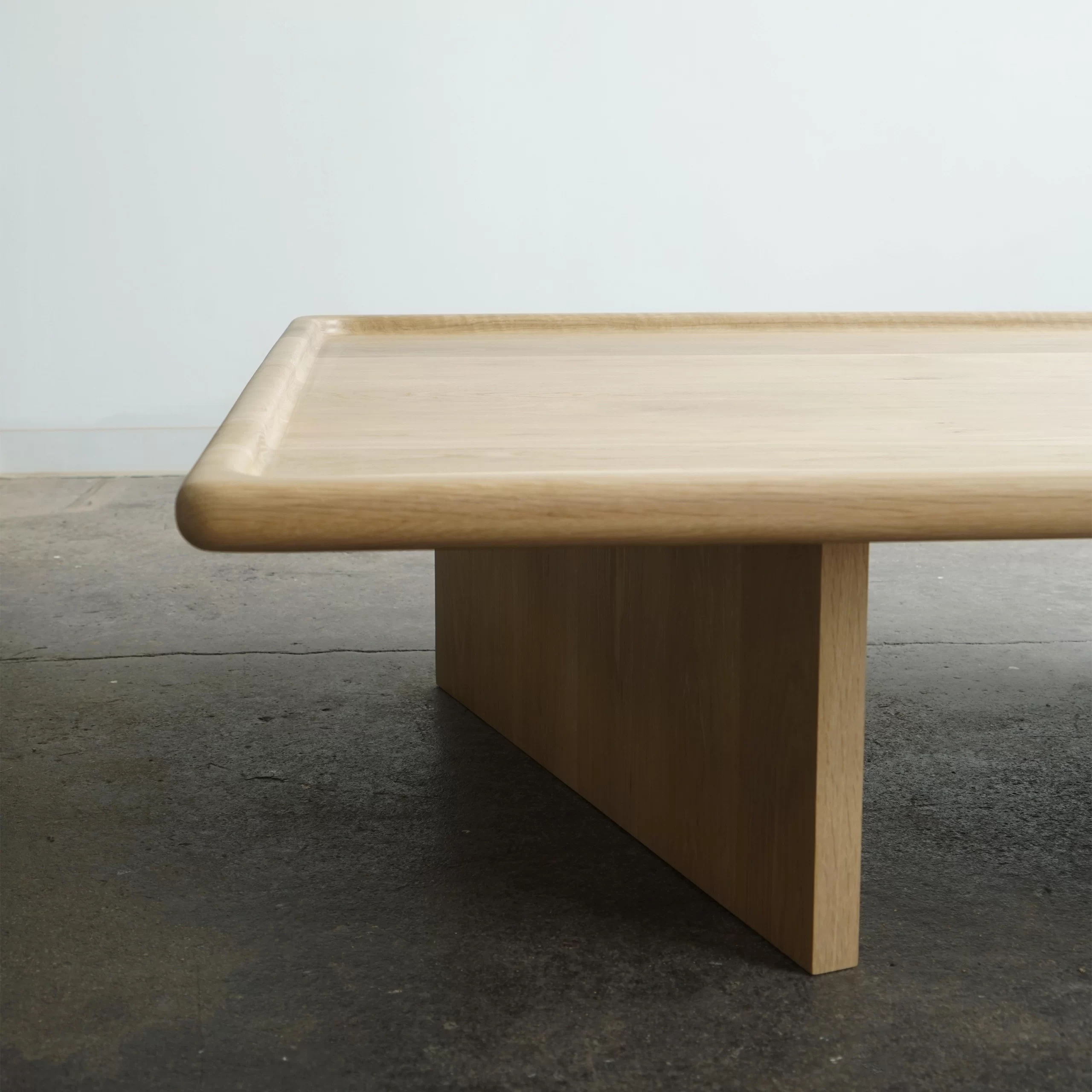 Bàn cà phê SANDOWN là một “sàn gỗ” ngoại cỡ giữa phòng khách. Mặt bàn vuông lớn được vát bo tròn toàn bộ viền, lõm nhẹ vào trong như một chiếc khay, giúp đồ đặt lên có cảm giác được ôm trọn. Hai chân bản dày chạy vuông góc tạo khối vững như một bệ đỡ kiến trúc, giữ cho tổng thể vừa tối giản vừa có sức nặng thị giác.