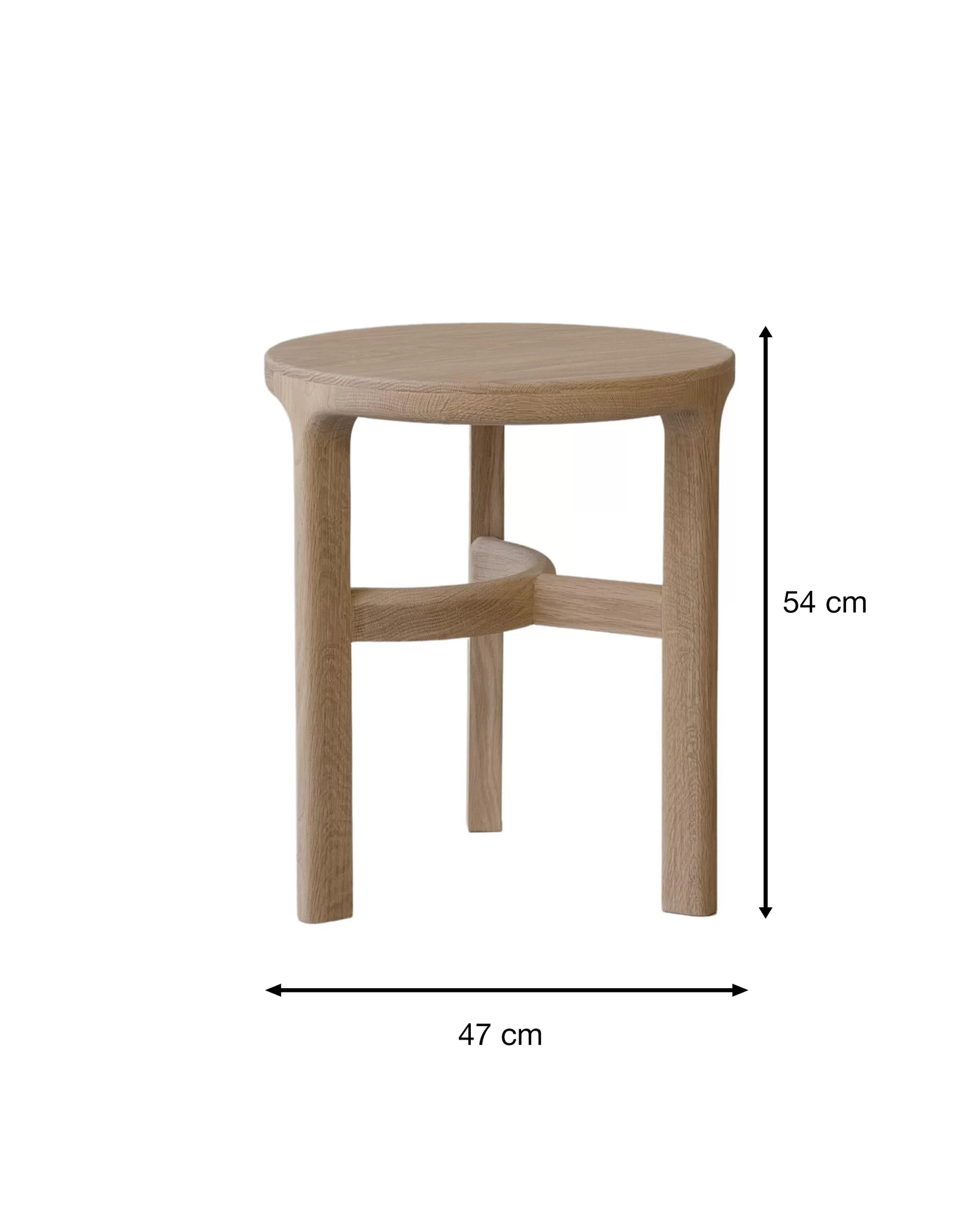 Bàn phụ TRASIEGO là một “chuyển động” nhỏ đặt giữa không gian. Mặt bàn tròn gỗ sồi bo mềm, ba chân đứng vững ôm lấy một thanh giằng cong ở giữa – chi tiết gợi cảm giác dòng nước lướt trên bề mặt rắn. Từ mọi góc nhìn, bàn đều có một đường cong thú vị, vừa tối giản vừa mang cảm giác điêu khắc.