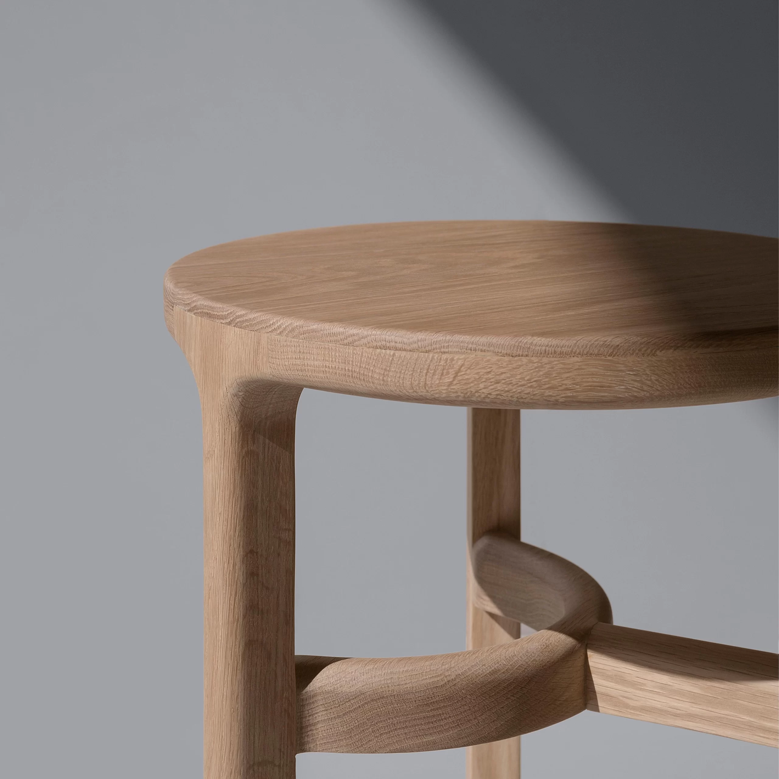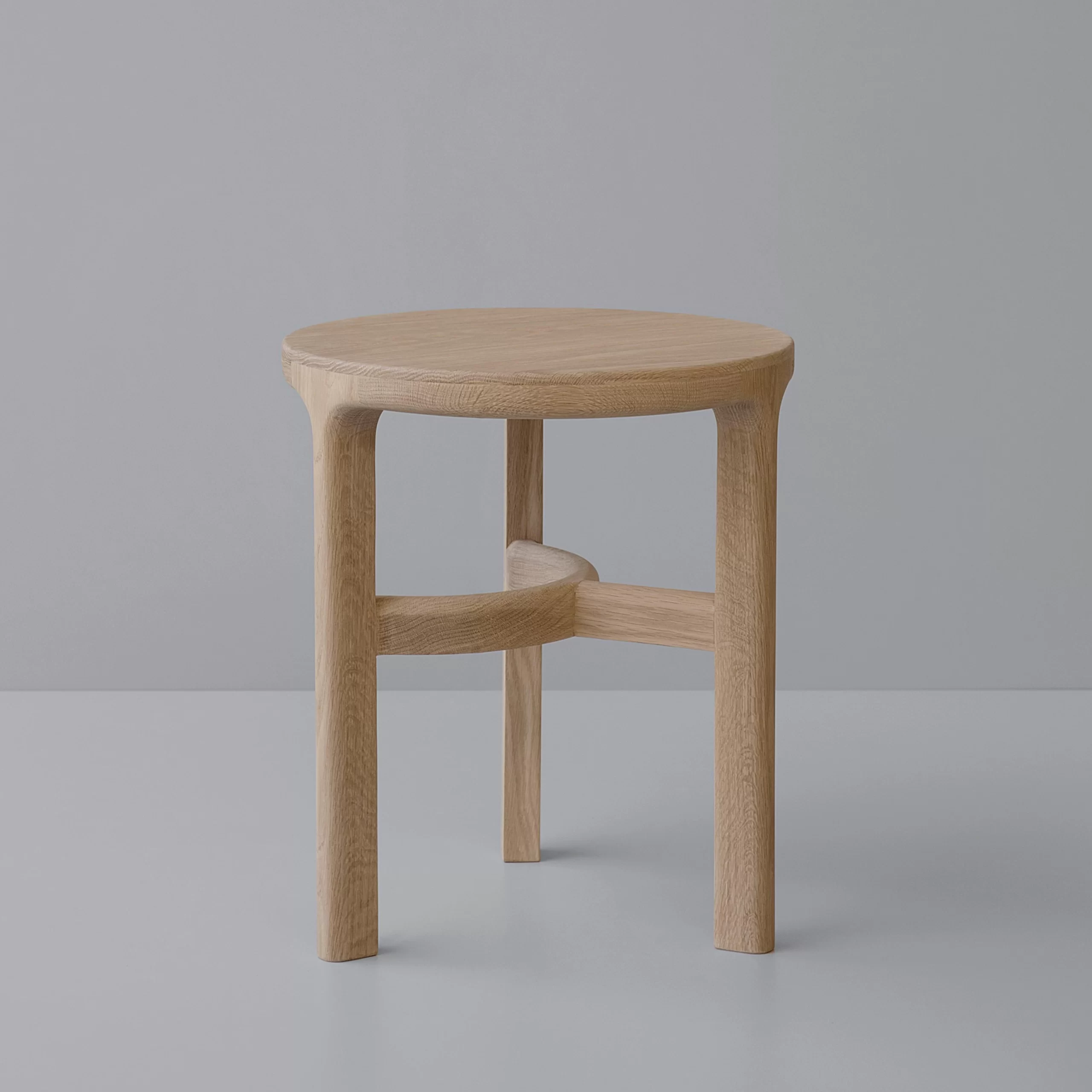 Bàn phụ TRASIEGO là một “chuyển động” nhỏ đặt giữa không gian. Mặt bàn tròn gỗ sồi bo mềm, ba chân đứng vững ôm lấy một thanh giằng cong ở giữa – chi tiết gợi cảm giác dòng nước lướt trên bề mặt rắn. Từ mọi góc nhìn, bàn đều có một đường cong thú vị, vừa tối giản vừa mang cảm giác điêu khắc.