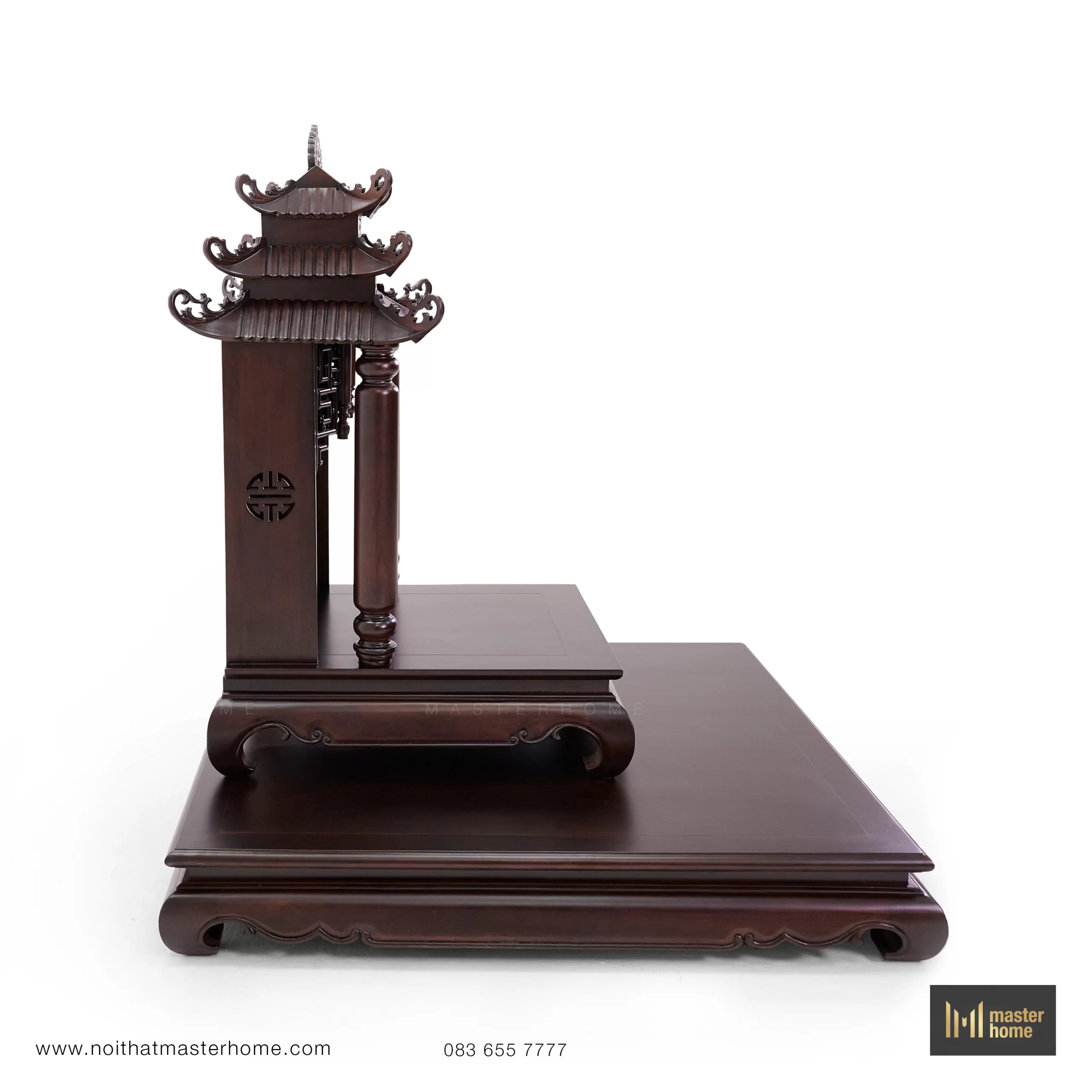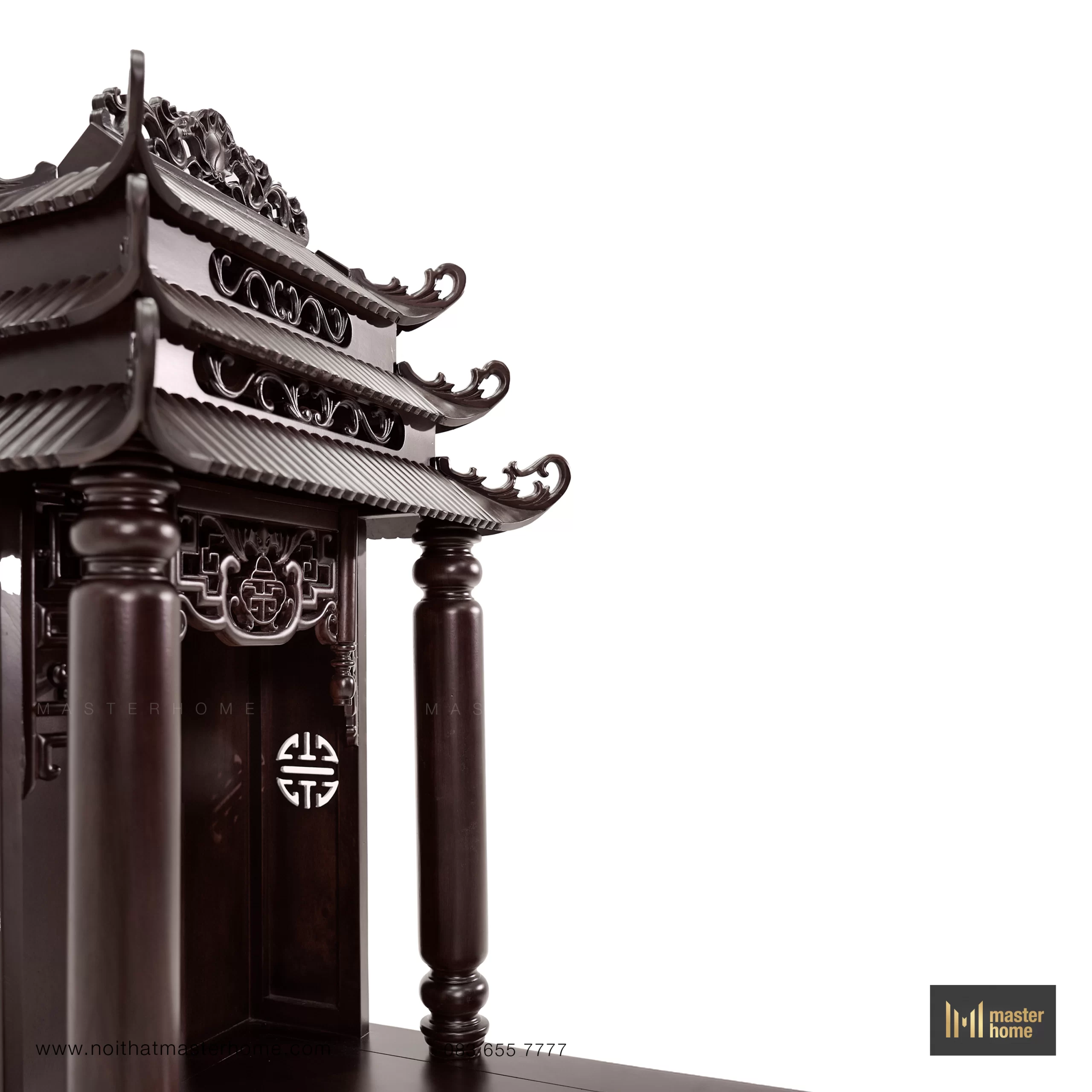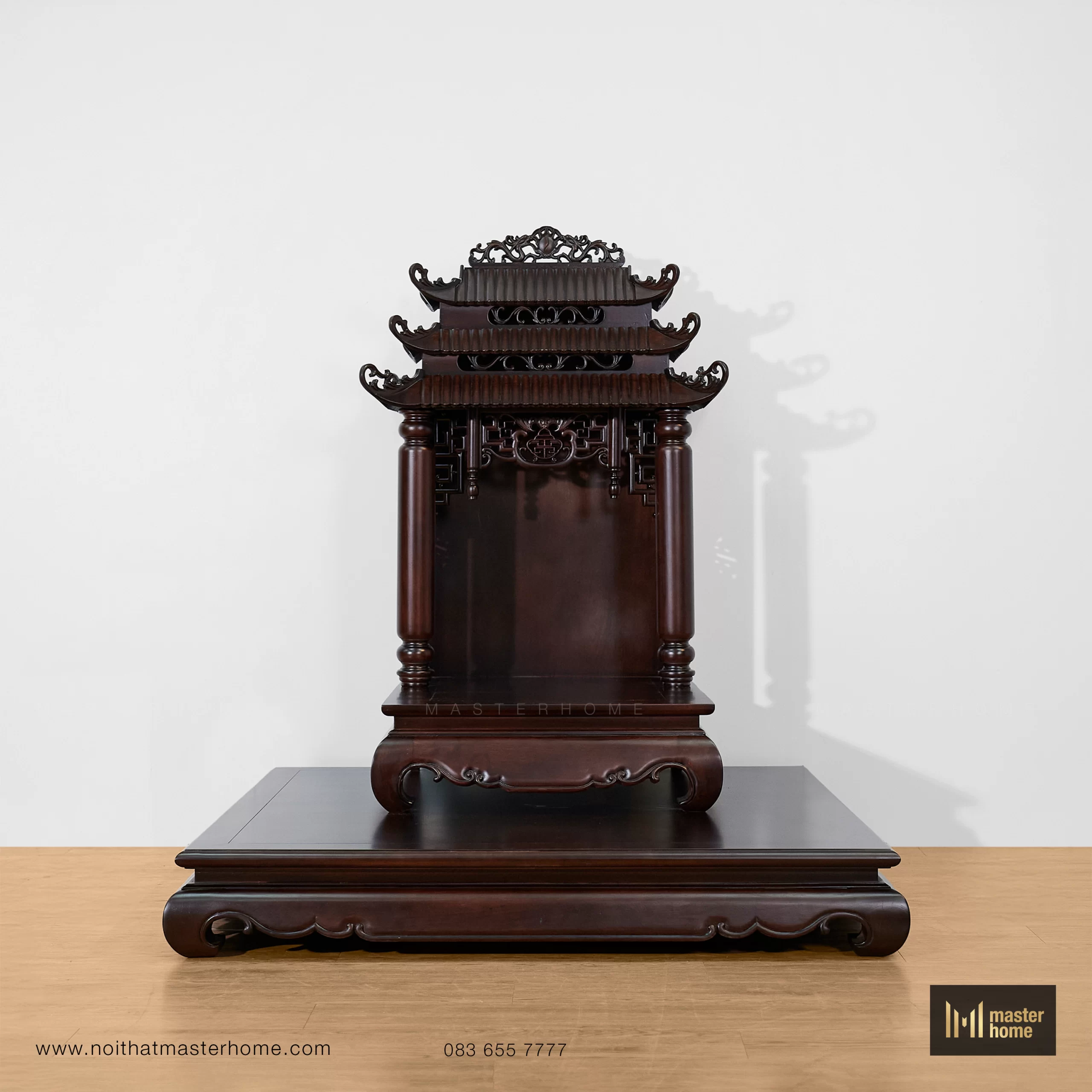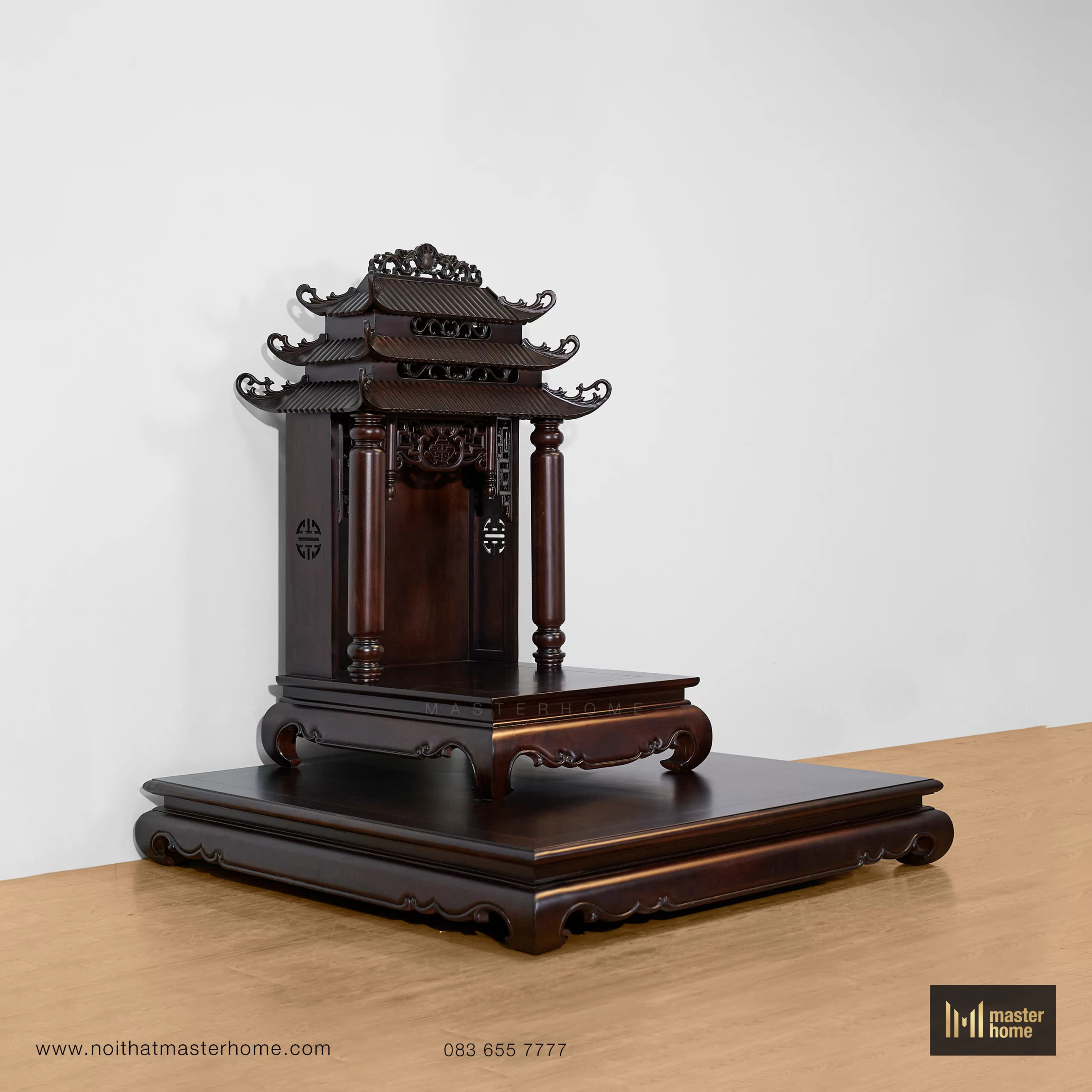 Bộ bàn thờ Thần Tài dáng tam cấp: bệ lớn đặt sàn, bệ trung tôn cao tượng – bát hương, và am thờ mái chồng diêm (mái đao cong, chạm triện) tạo tỷ lệ tôn nghiêm. Cột tròn, yếm uốn và kẻ chỉ mềm tạo chiều sâu; bề mặt nâu trầm, bóng mờ vừa phải, trang trọng mà dễ chăm. Kiểu thức truyền thống nhưng tinh gọn chi tiết để phù hợp nhà hiện đại.