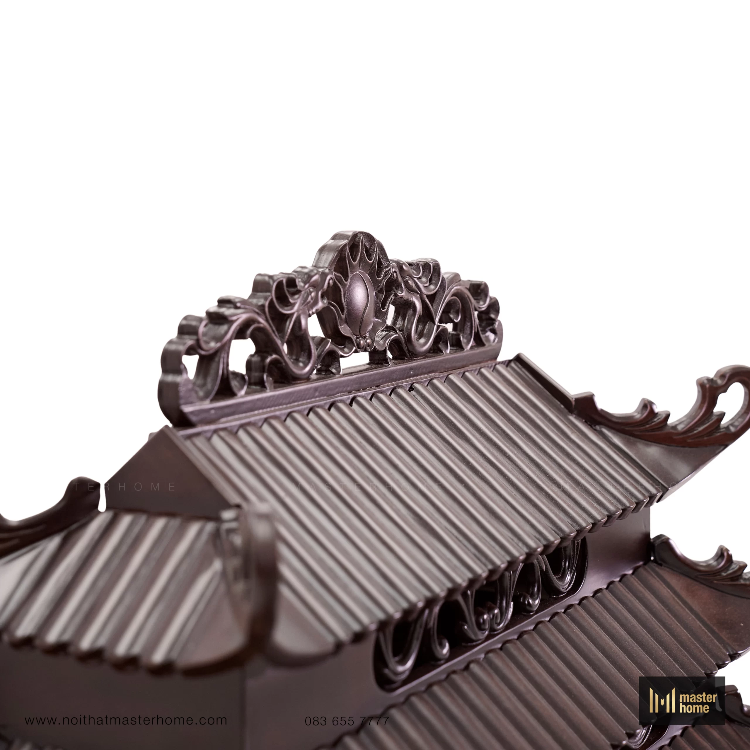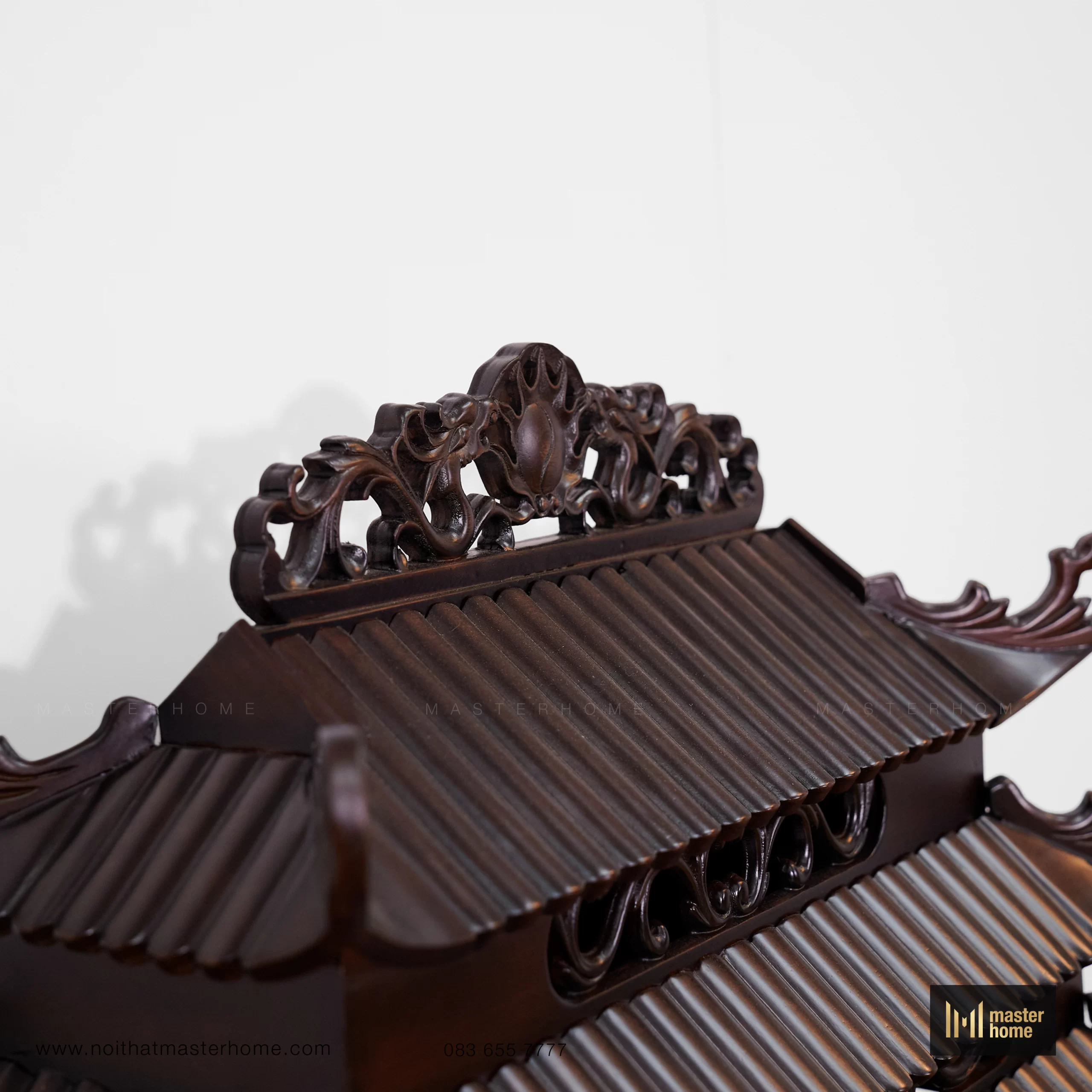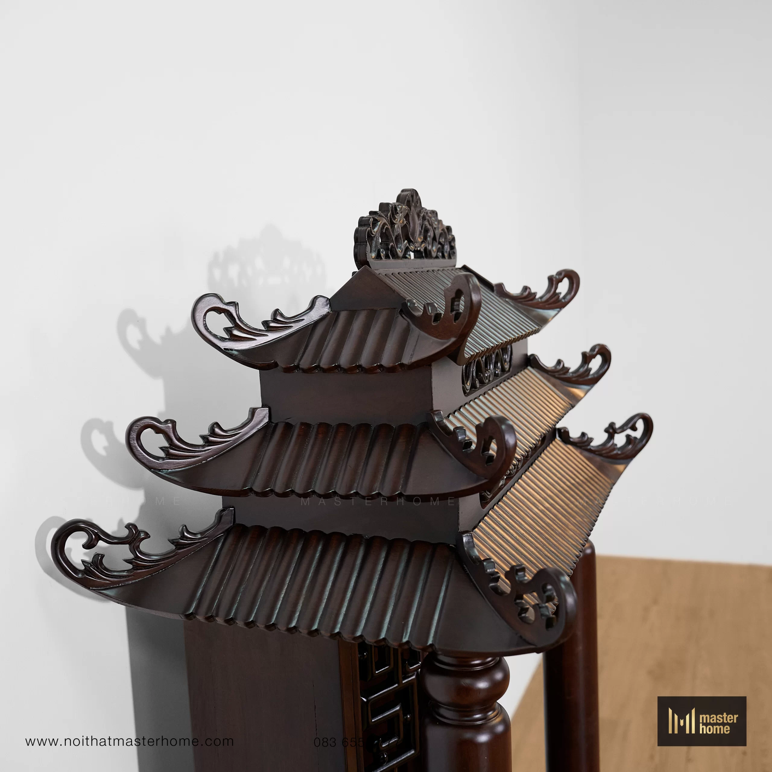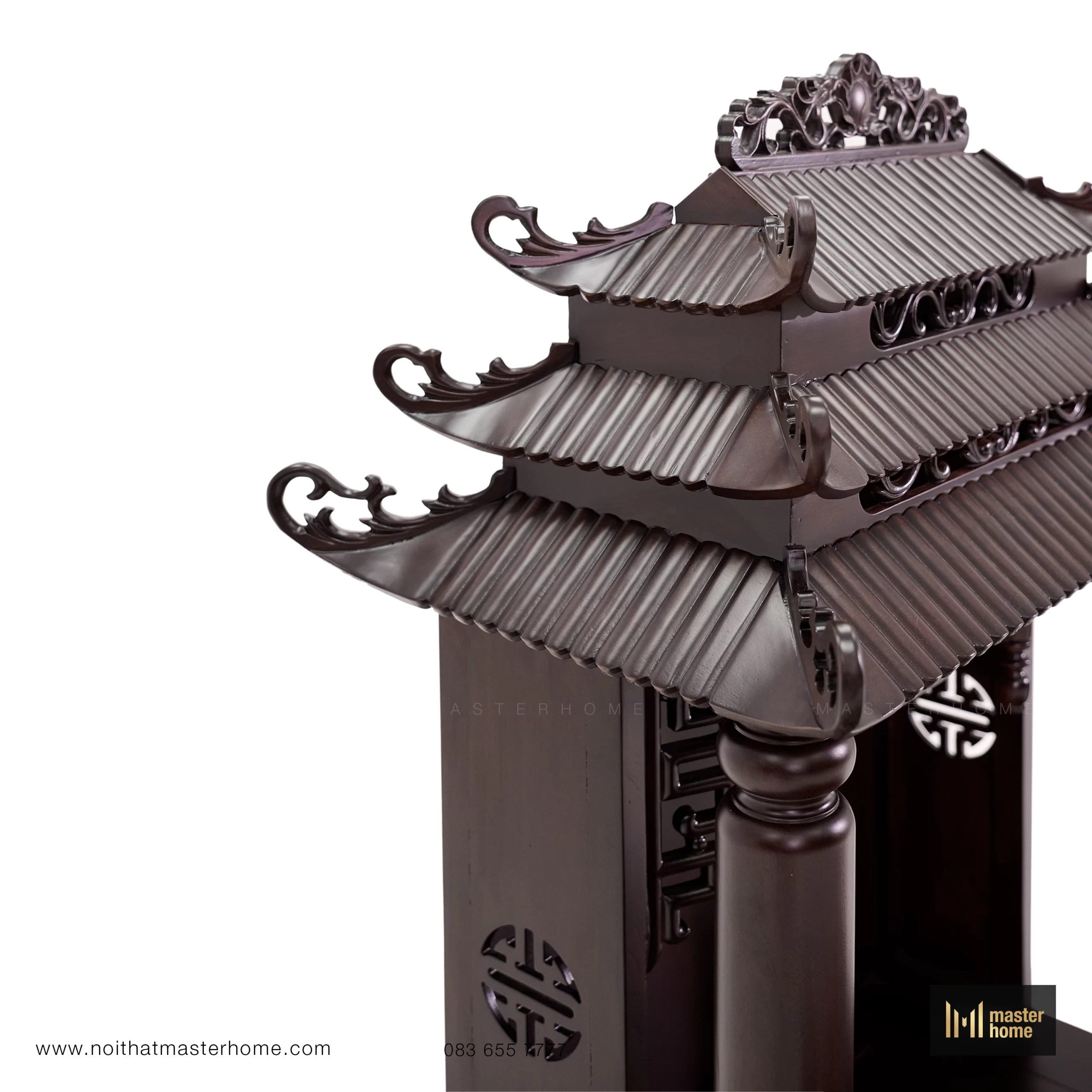 Bộ bàn thờ Thần Tài dáng tam cấp: bệ lớn đặt sàn, bệ trung tôn cao tượng – bát hương, và am thờ mái chồng diêm (mái đao cong, chạm triện) tạo tỷ lệ tôn nghiêm. Cột tròn, yếm uốn và kẻ chỉ mềm tạo chiều sâu; bề mặt nâu trầm, bóng mờ vừa phải, trang trọng mà dễ chăm. Kiểu thức truyền thống nhưng tinh gọn chi tiết để phù hợp nhà hiện đại.