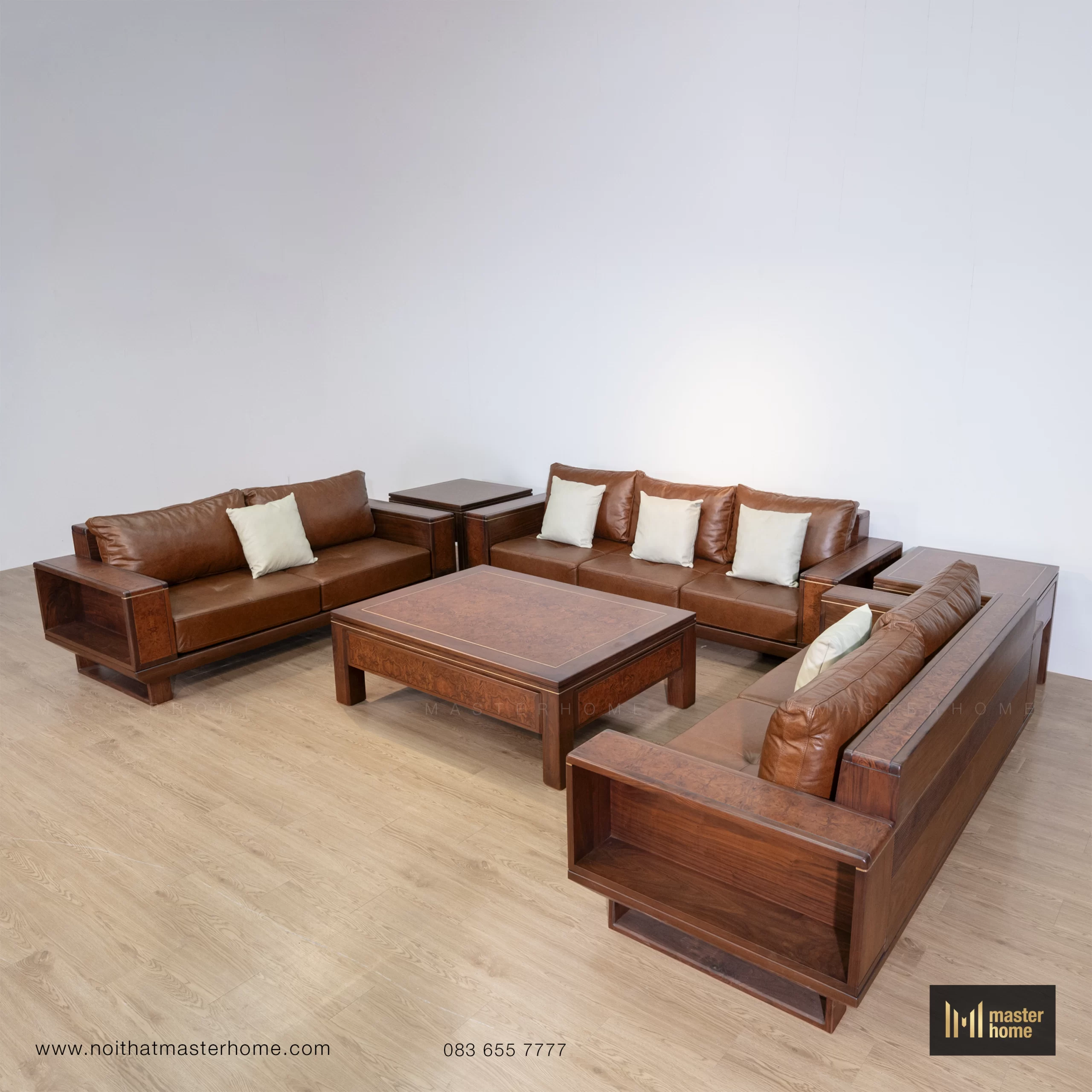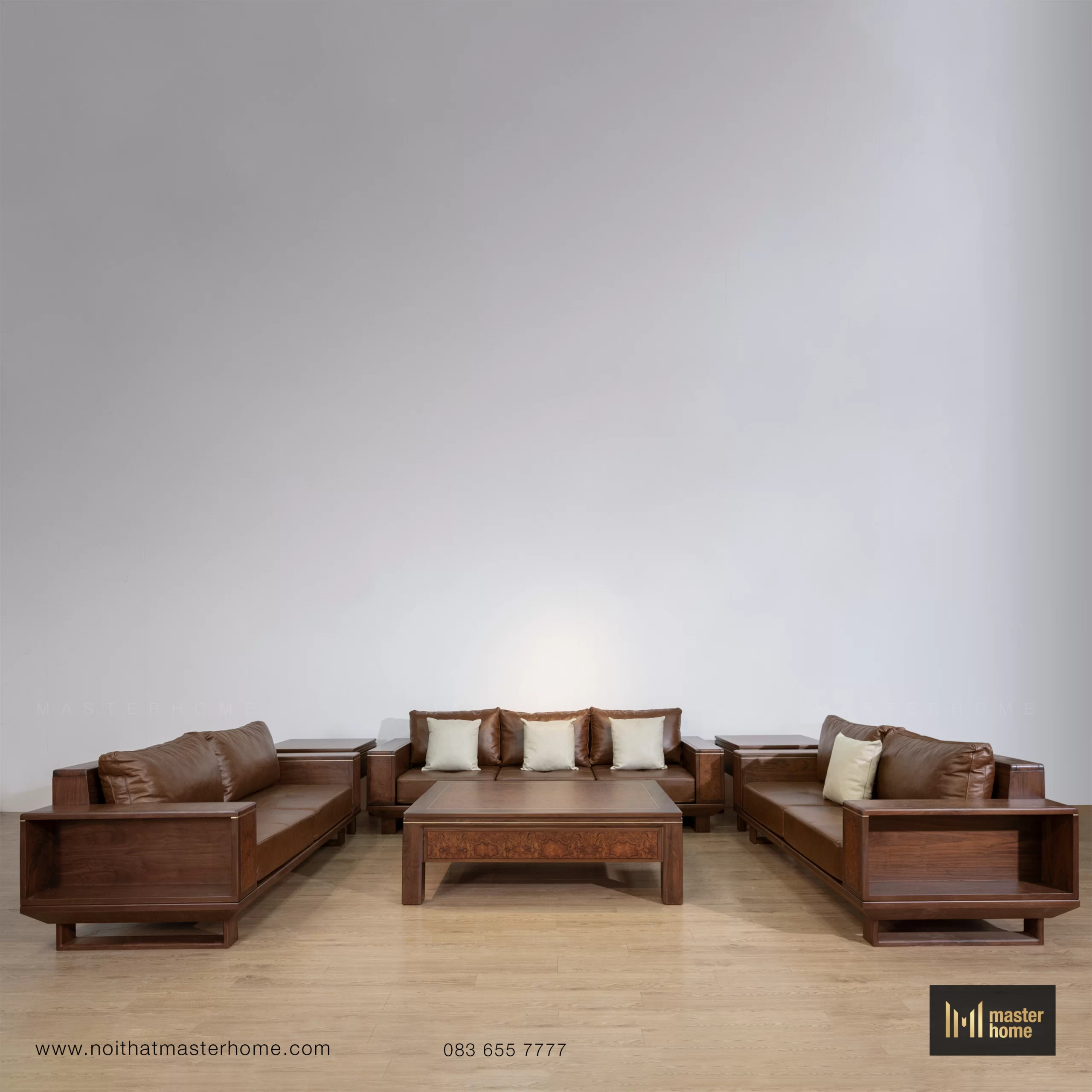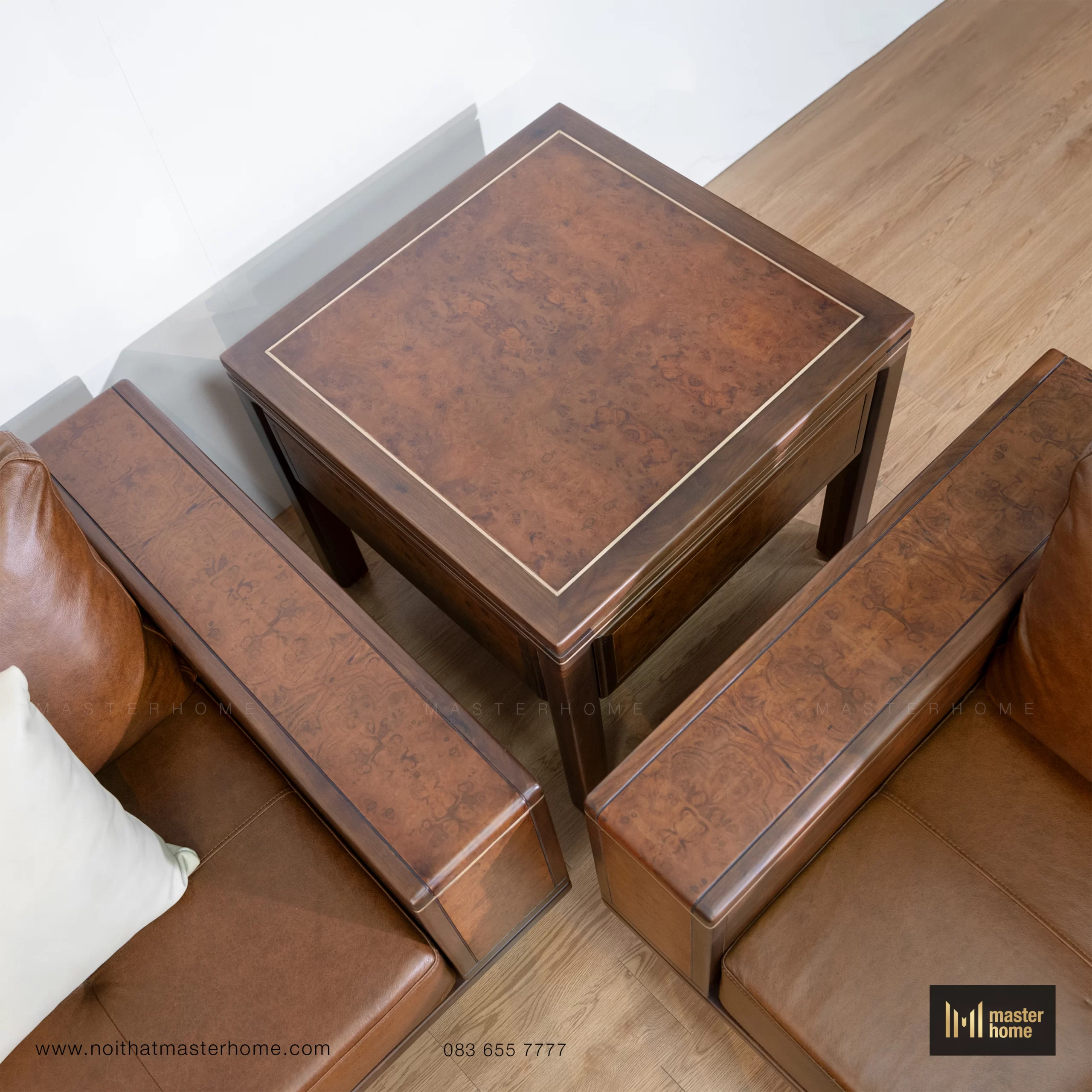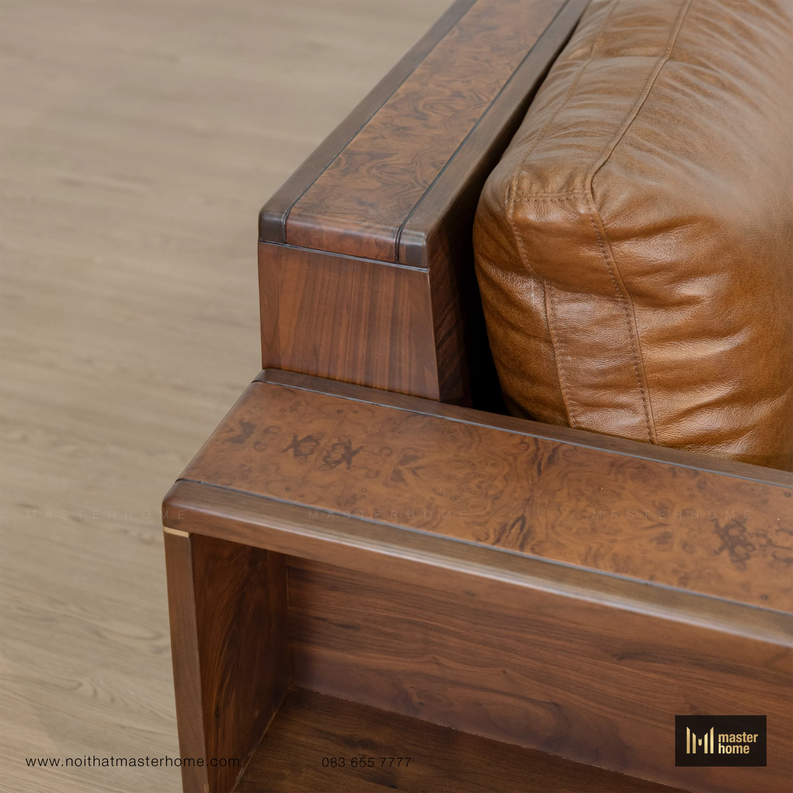 - Bộ sofa gỗ Óc chó da bò Ý MBM-S03 là một tổ hợp hoàn chỉnh cho phòng khách: ghế băng, ghế đơn, bàn trà và bàn tab nhỏ đồng bộ. Form sofa vuông vức, tay và lưng gỗ cao vừa đủ, đường thẳng mạnh mẽ nhưng được bo mềm ở các cạnh, tạo cảm giác chắc chắn mà không bị nặng. Bề mặt gỗ nổi bật với các mảng ốp veneer Nu (Nu: vùng gỗ có mắt – vân xoáy đặc biệt) chạy dọc tay, lưng và mặt bàn, khiến tổng thể vừa hiện đại vừa phảng phất vẻ cổ điển. Đệm ngồi và tựa bọc da bò Ý màu nâu cognac (tông nâu da bò ấm), càng sử dụng càng “lên nước”, mềm và bóng nhẹ theo thời gian. Bộ sofa phù hợp với các không gian phòng khách rộng, biệt thự, nhà phố cao trần hoặc văn phòng lãnh đạo.