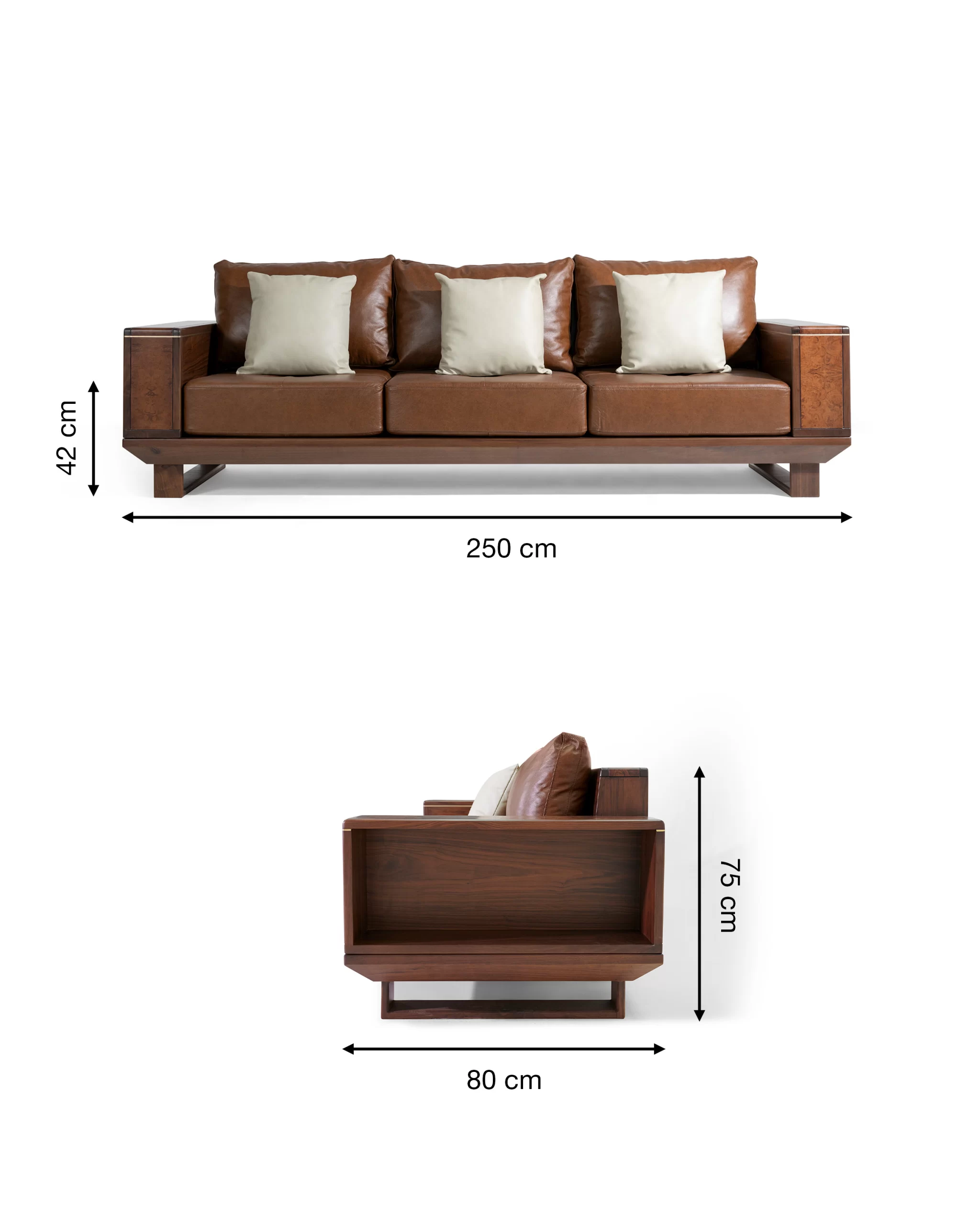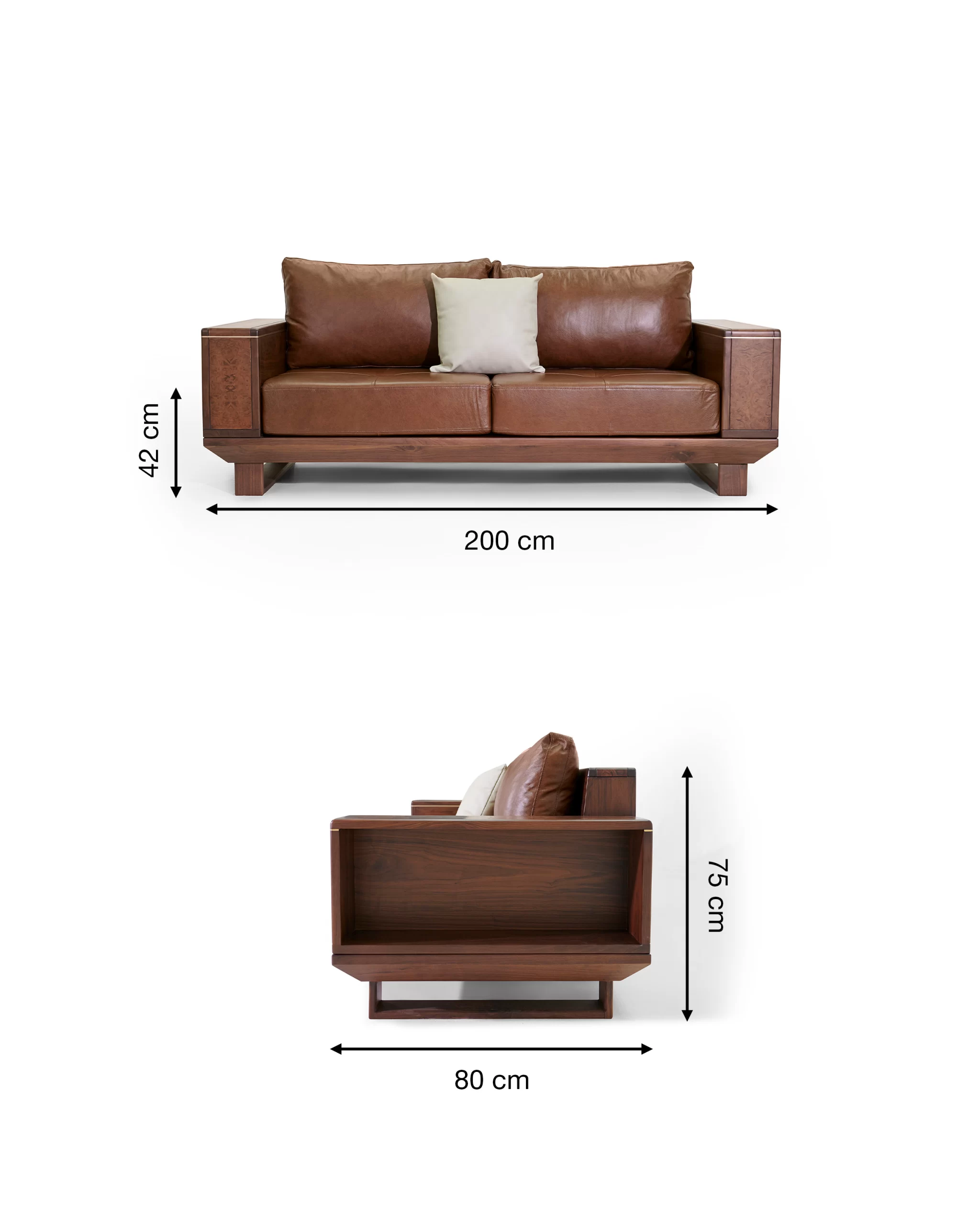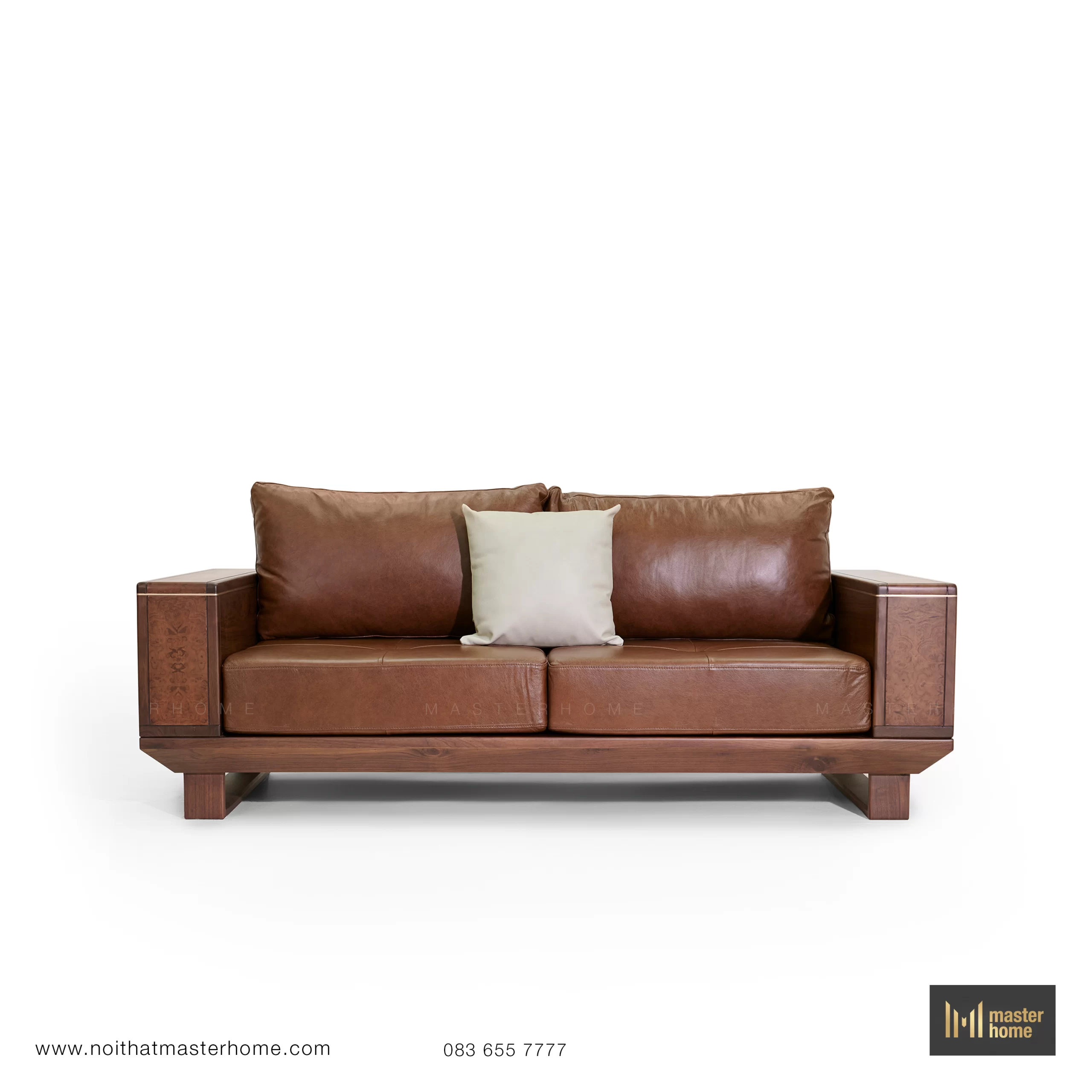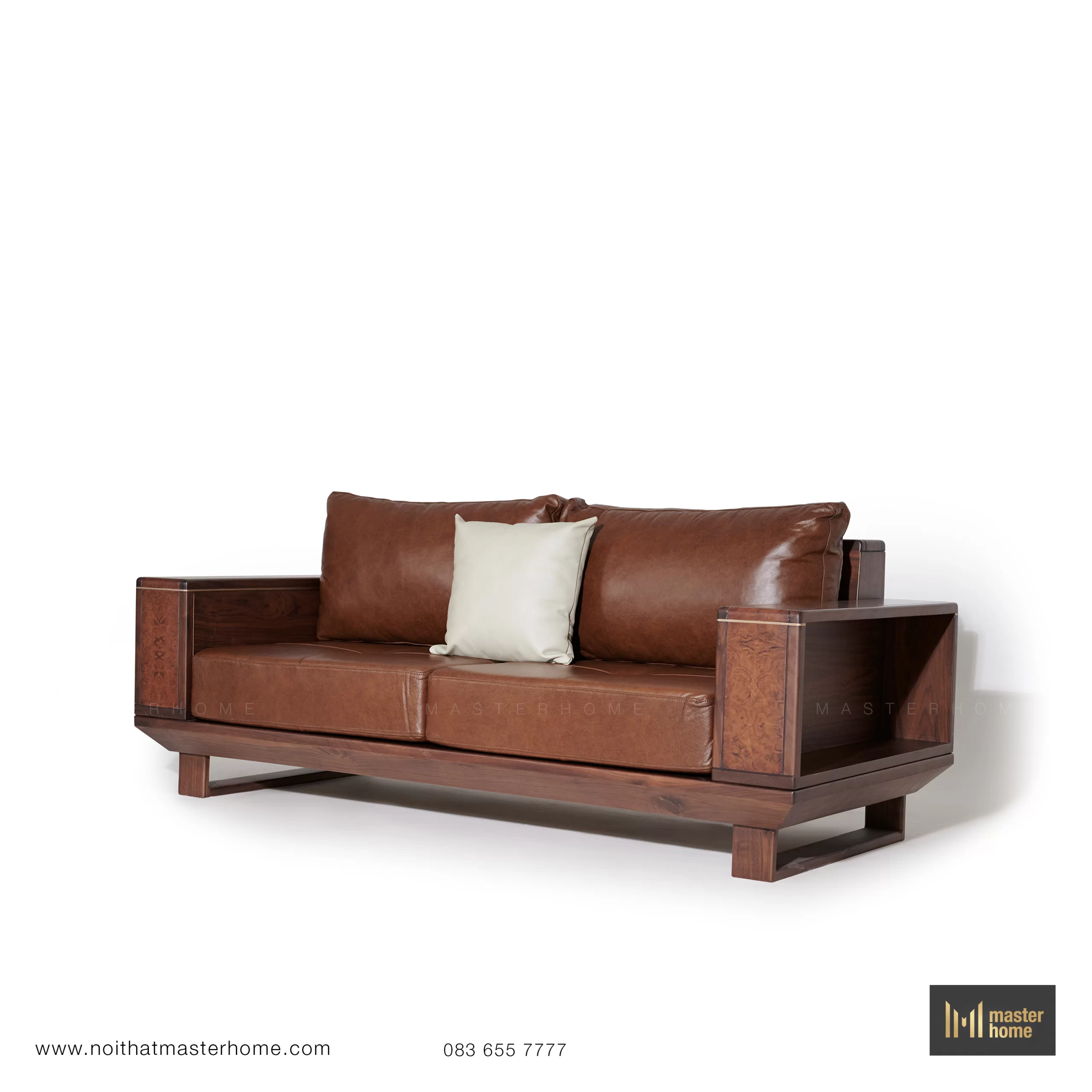 - Bộ sofa gỗ Óc chó da bò Ý MBM-S03 là một tổ hợp hoàn chỉnh cho phòng khách: ghế băng, ghế đơn, bàn trà và bàn tab nhỏ đồng bộ. Form sofa vuông vức, tay và lưng gỗ cao vừa đủ, đường thẳng mạnh mẽ nhưng được bo mềm ở các cạnh, tạo cảm giác chắc chắn mà không bị nặng. Bề mặt gỗ nổi bật với các mảng ốp veneer Nu (Nu: vùng gỗ có mắt – vân xoáy đặc biệt) chạy dọc tay, lưng và mặt bàn, khiến tổng thể vừa hiện đại vừa phảng phất vẻ cổ điển. Đệm ngồi và tựa bọc da bò Ý màu nâu cognac (tông nâu da bò ấm), càng sử dụng càng “lên nước”, mềm và bóng nhẹ theo thời gian. Bộ sofa phù hợp với các không gian phòng khách rộng, biệt thự, nhà phố cao trần hoặc văn phòng lãnh đạo.