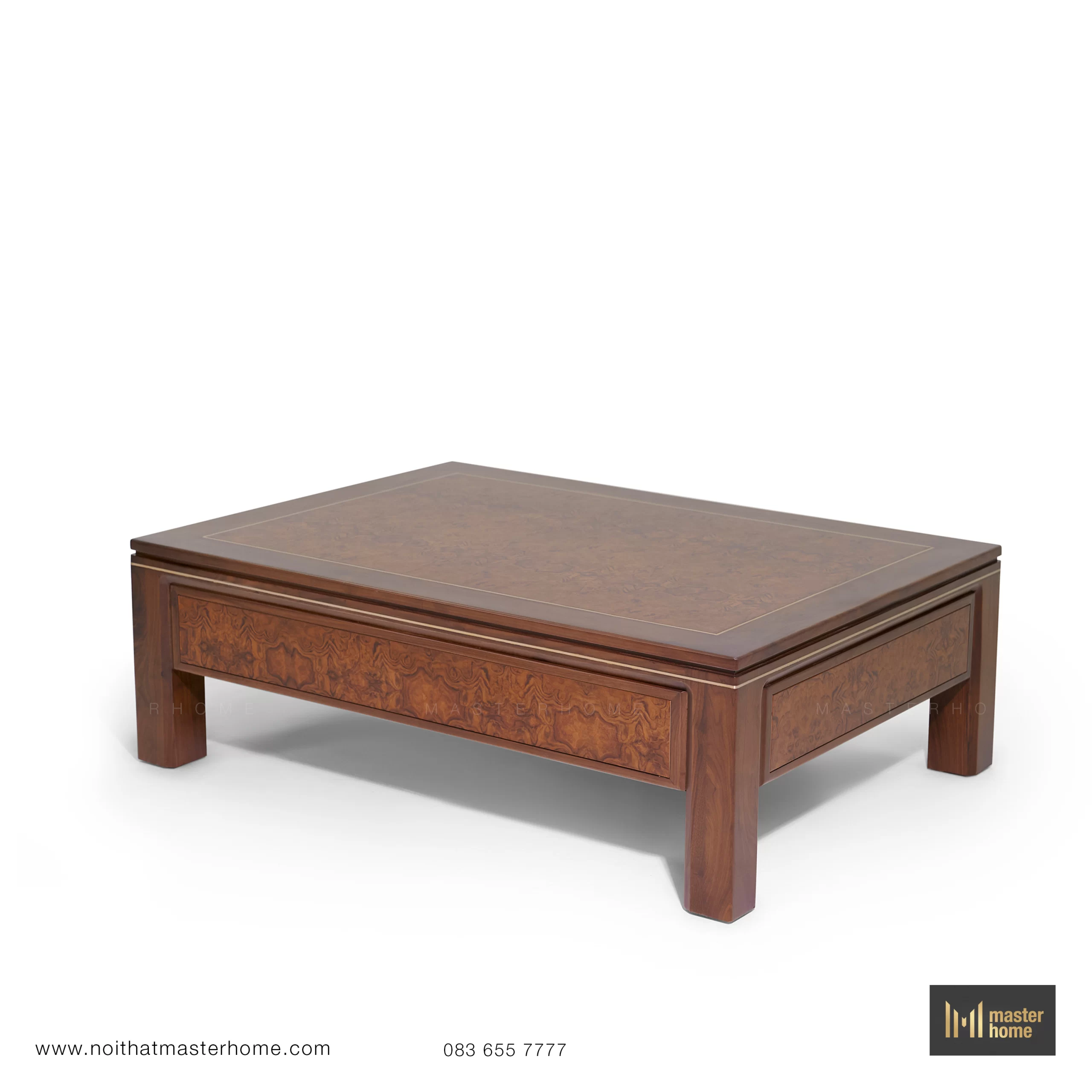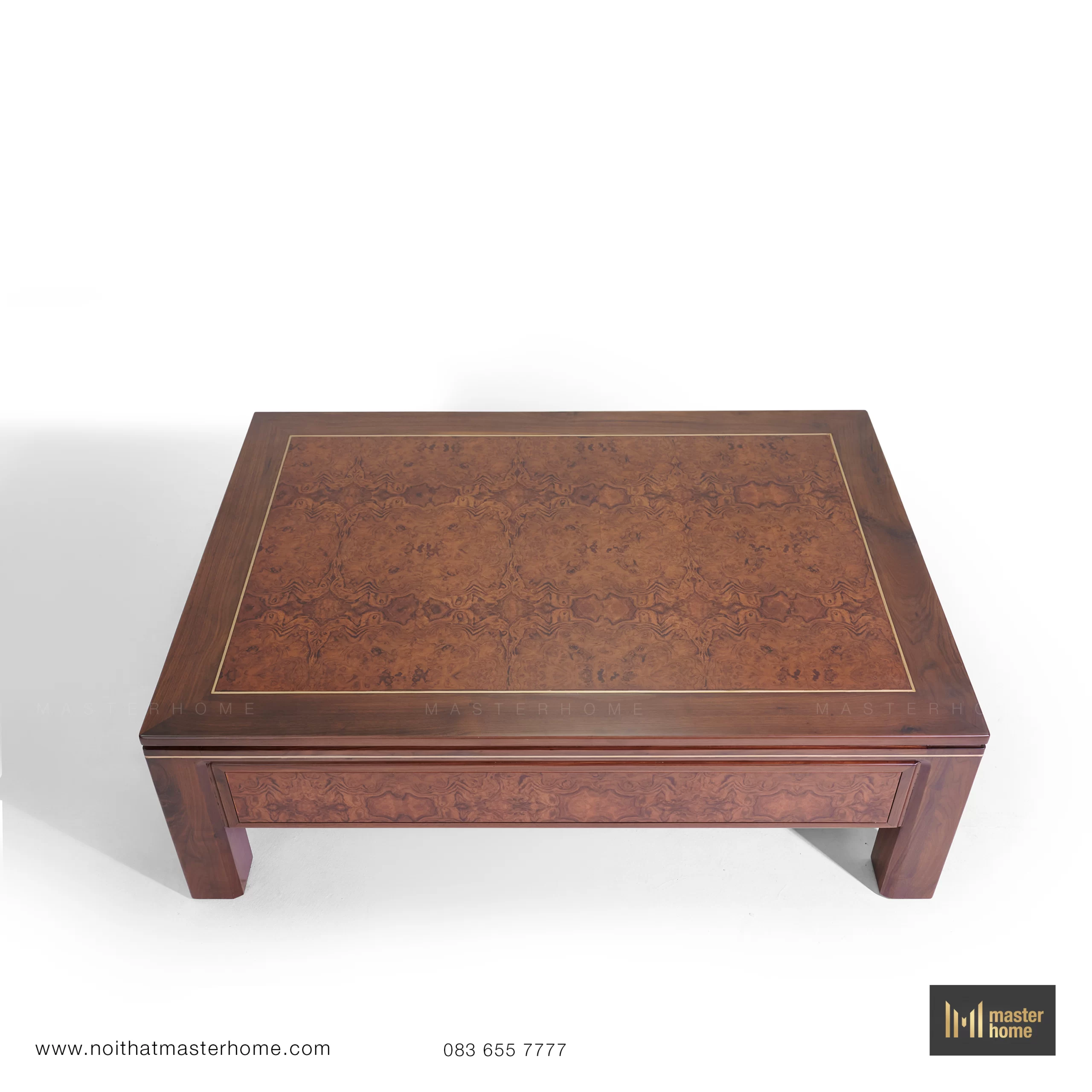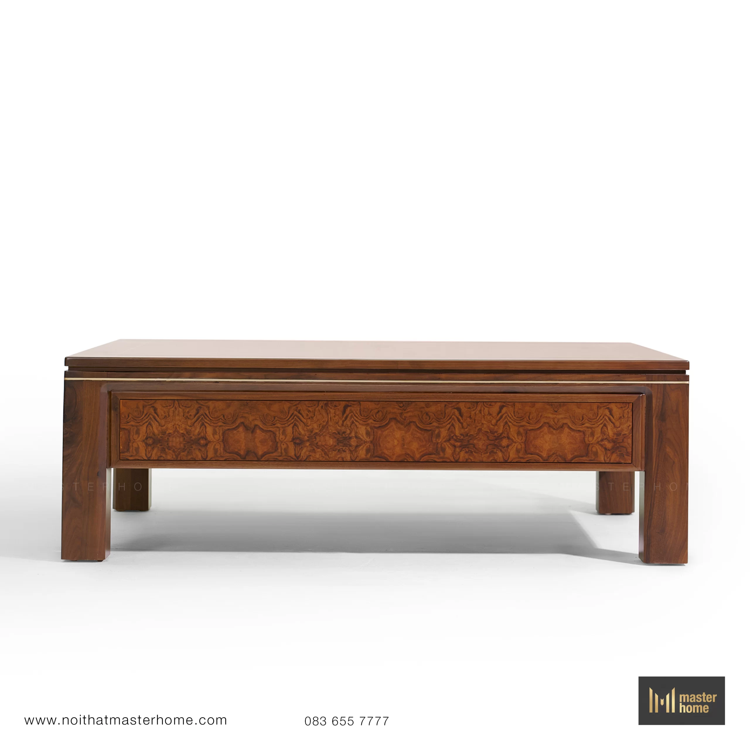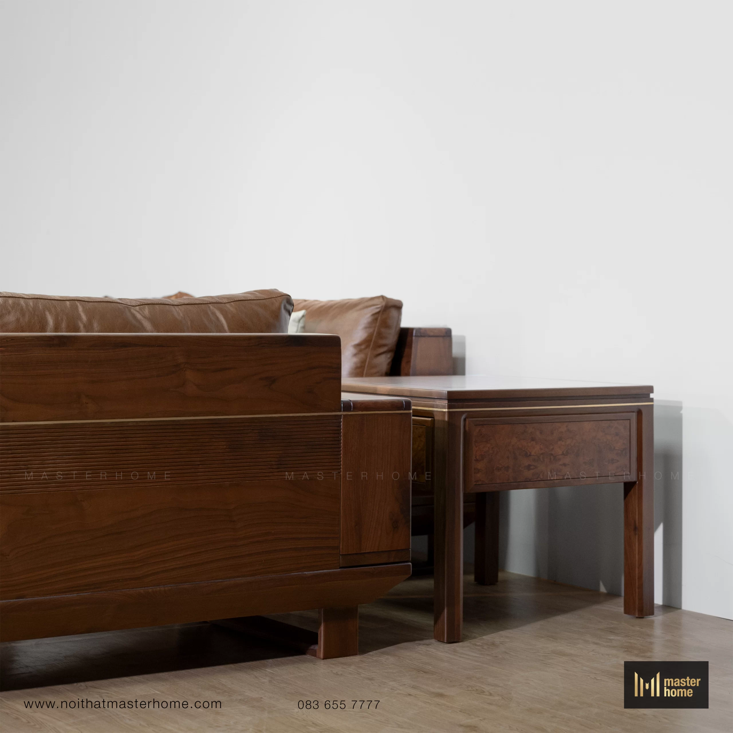 - Bàn trà – bàn tab: khung gỗ Óc chó, mặt ốp veneer Nu và nẹp đồng chạy viền; chiều cao được tính đồng bộ với chiều cao đệm sofa để thao tác đặt ly, sách thoải mái.