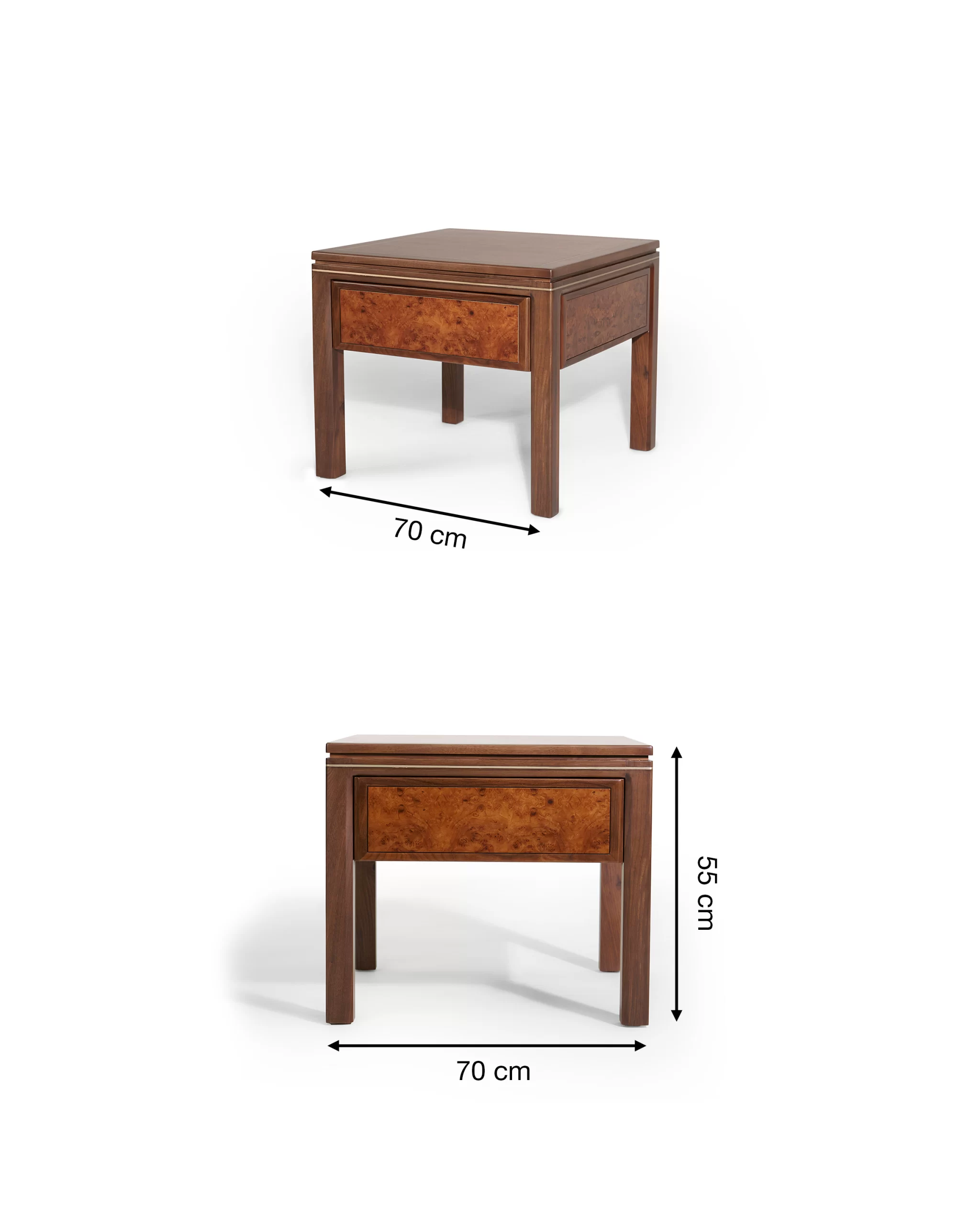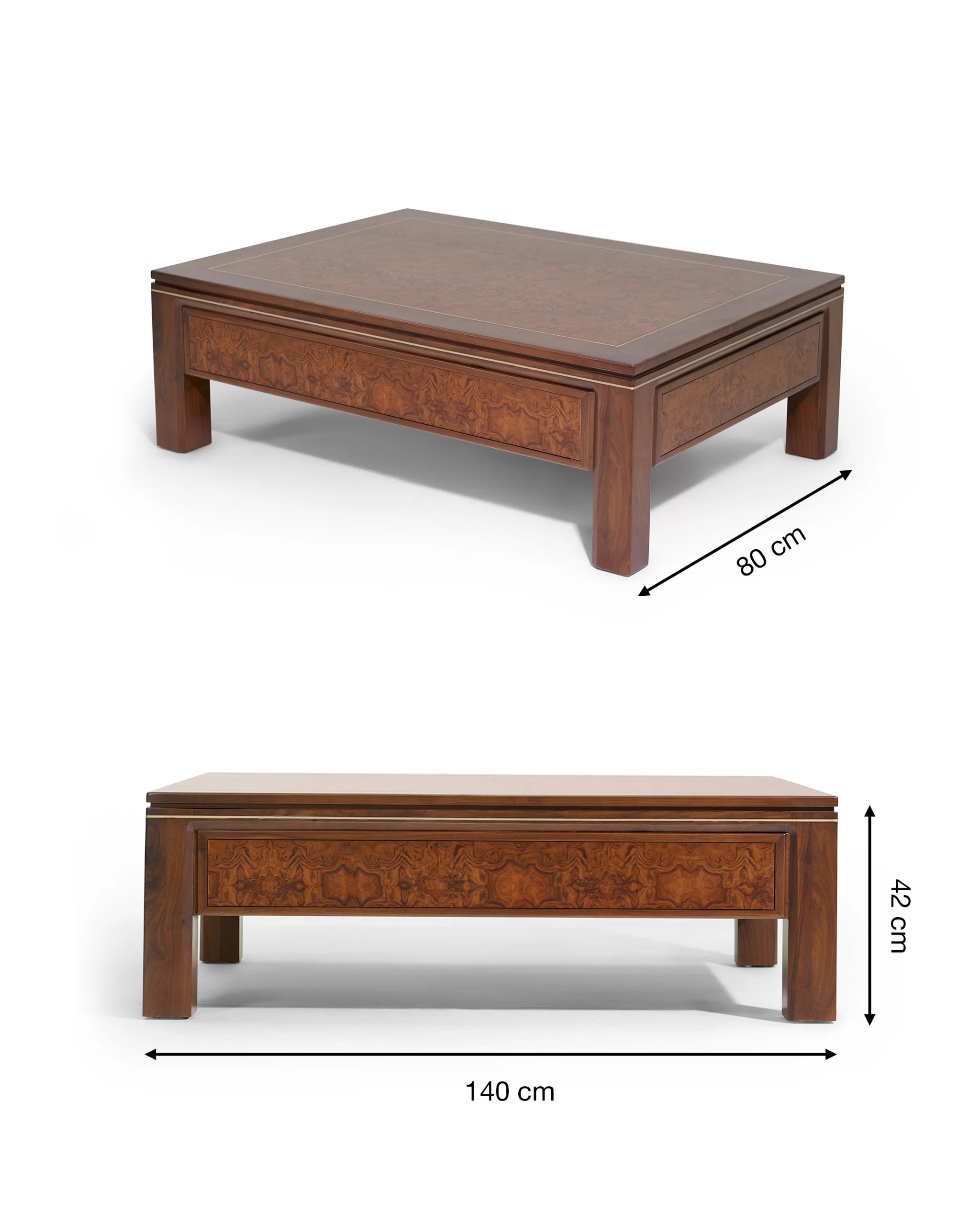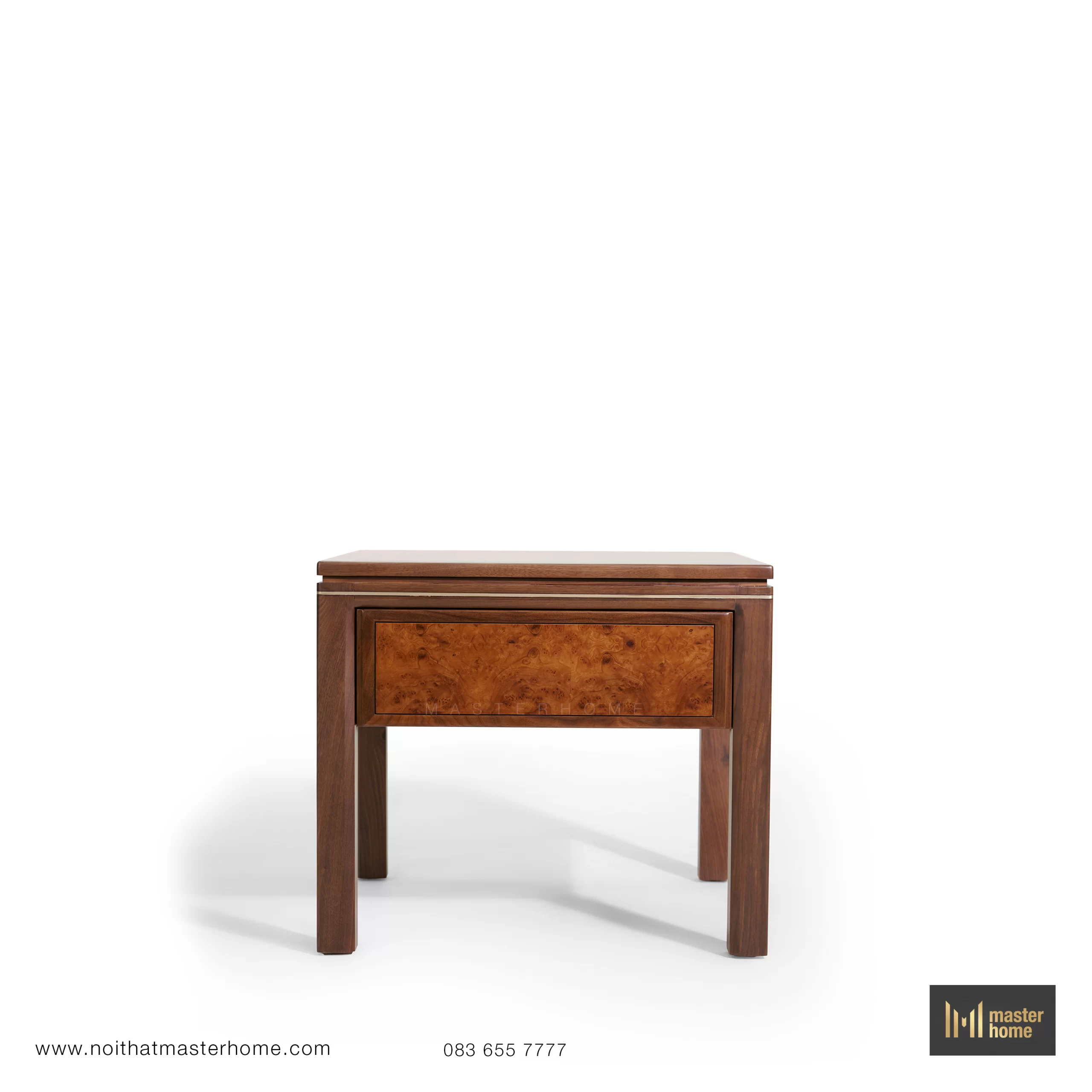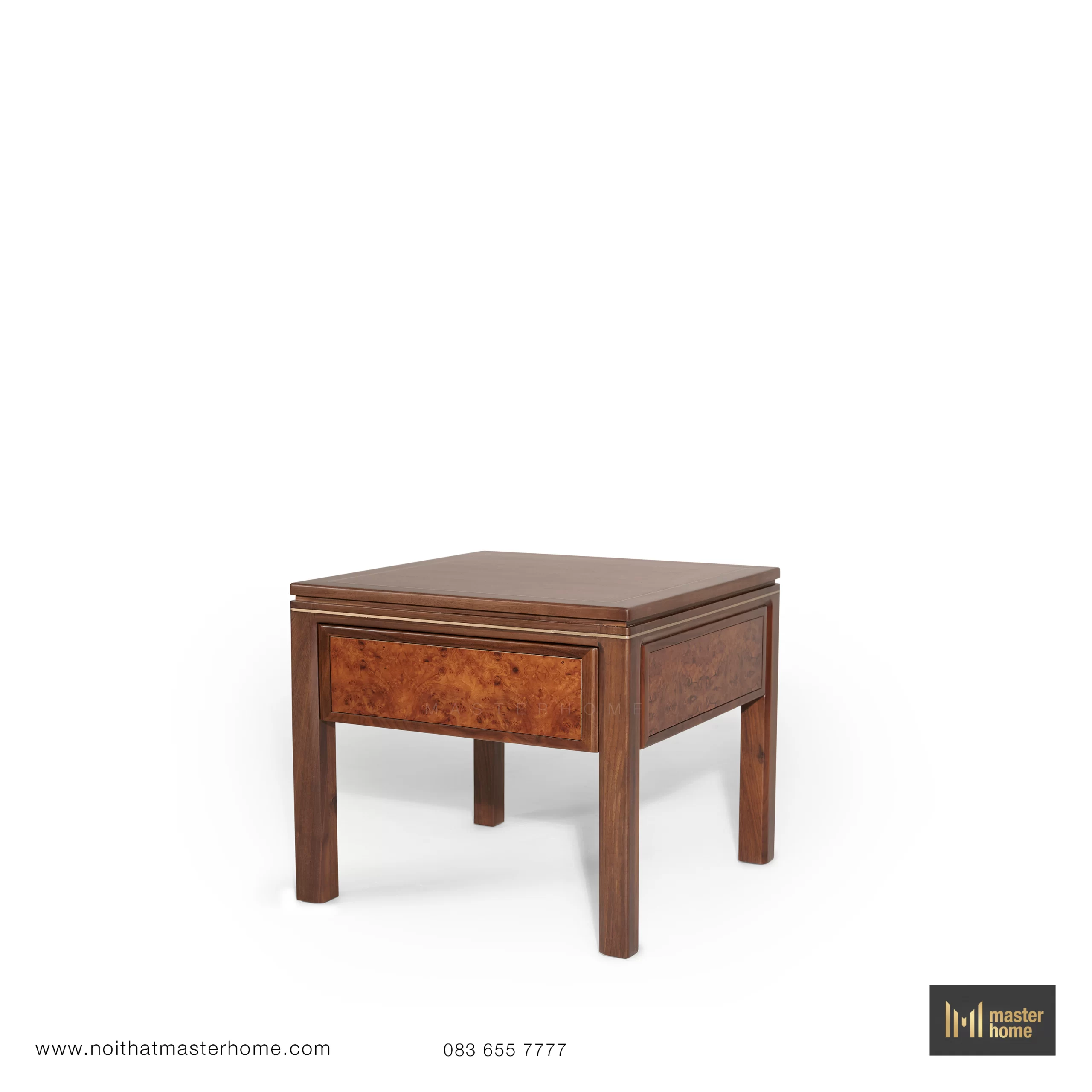- Bàn trà – bàn tab: khung gỗ Óc chó, mặt ốp veneer Nu và nẹp đồng chạy viền; chiều cao được tính đồng bộ với chiều cao đệm sofa để thao tác đặt ly, sách thoải mái.