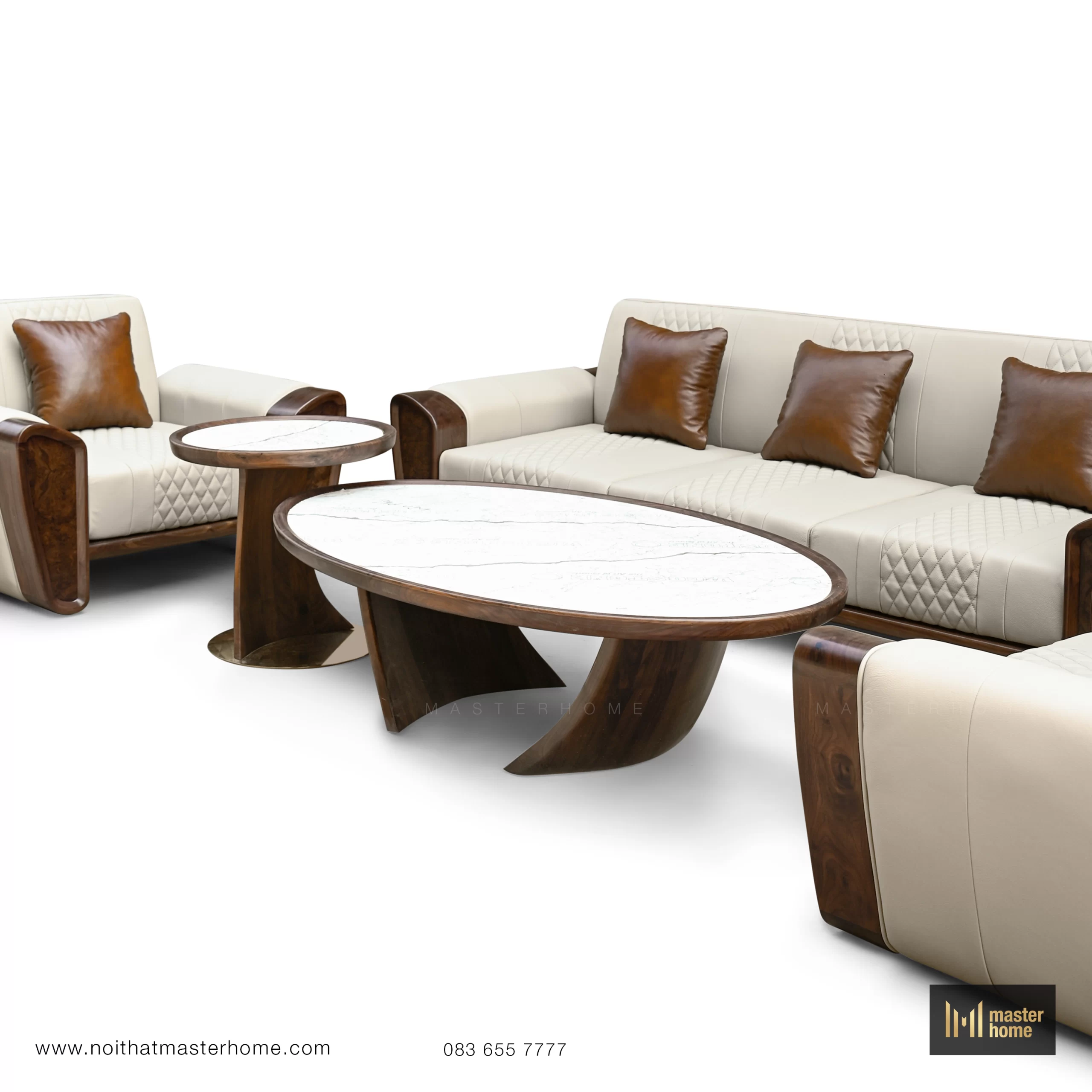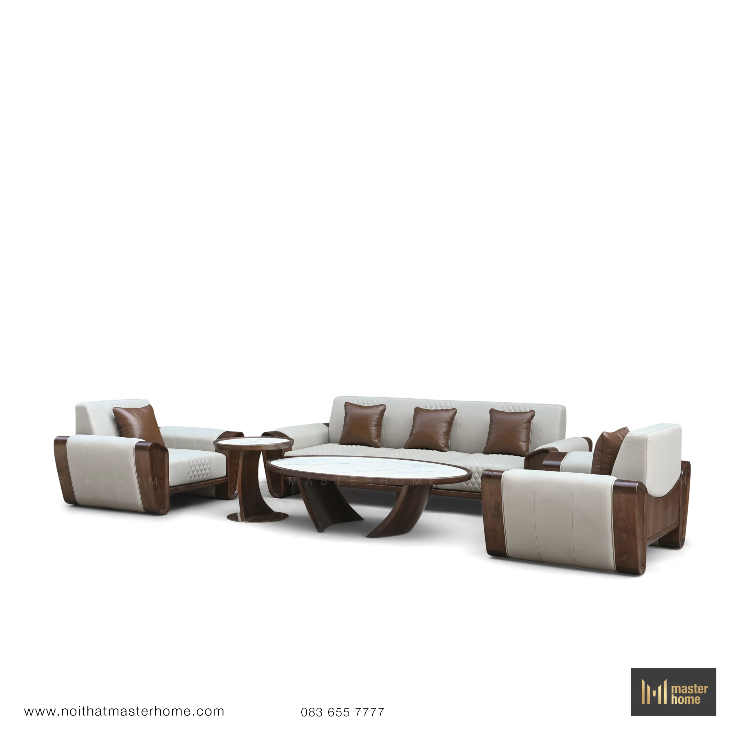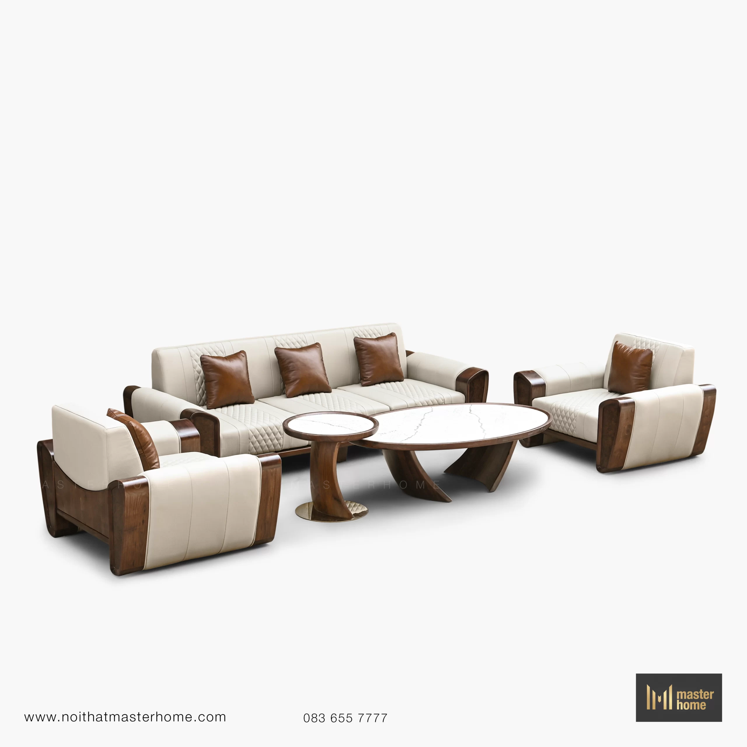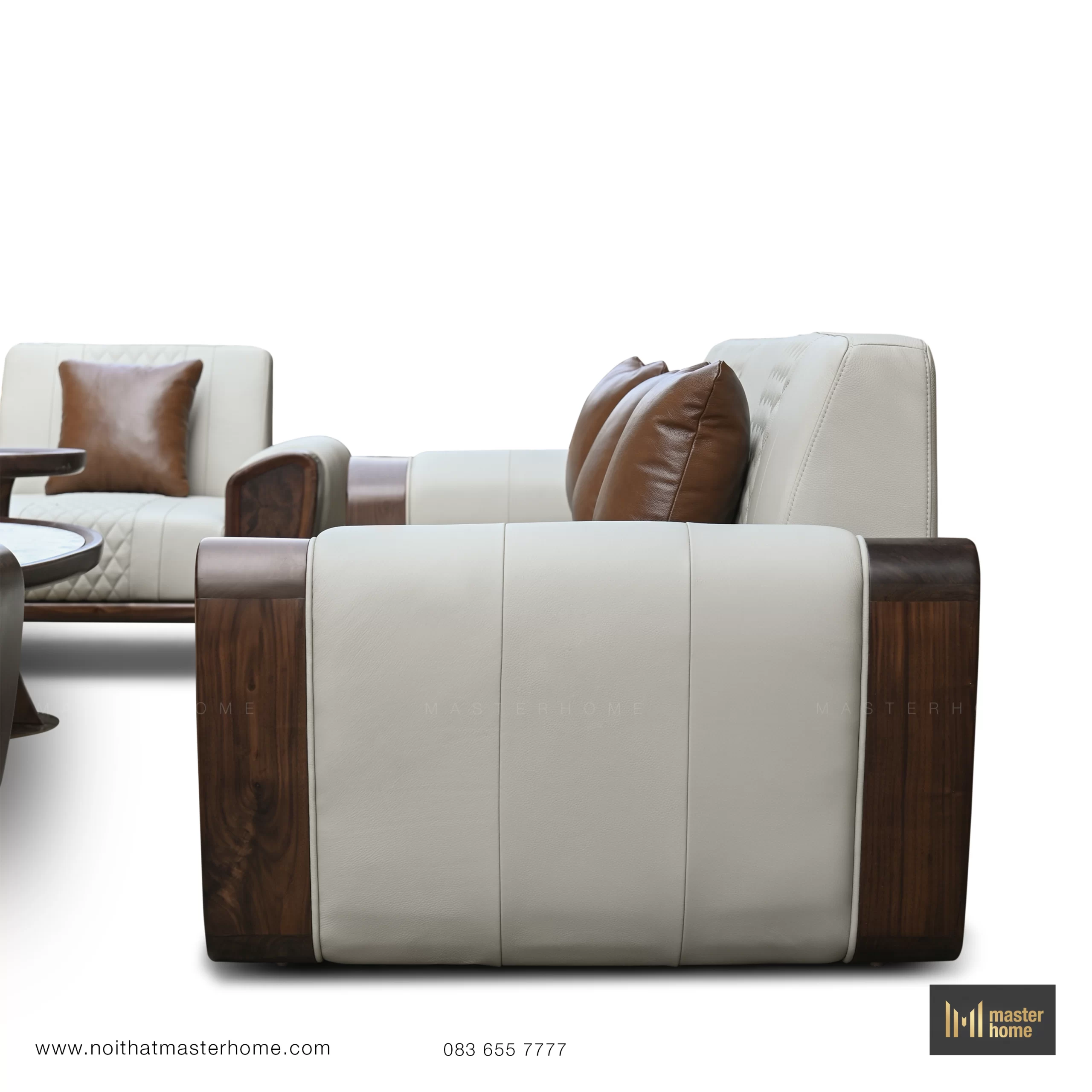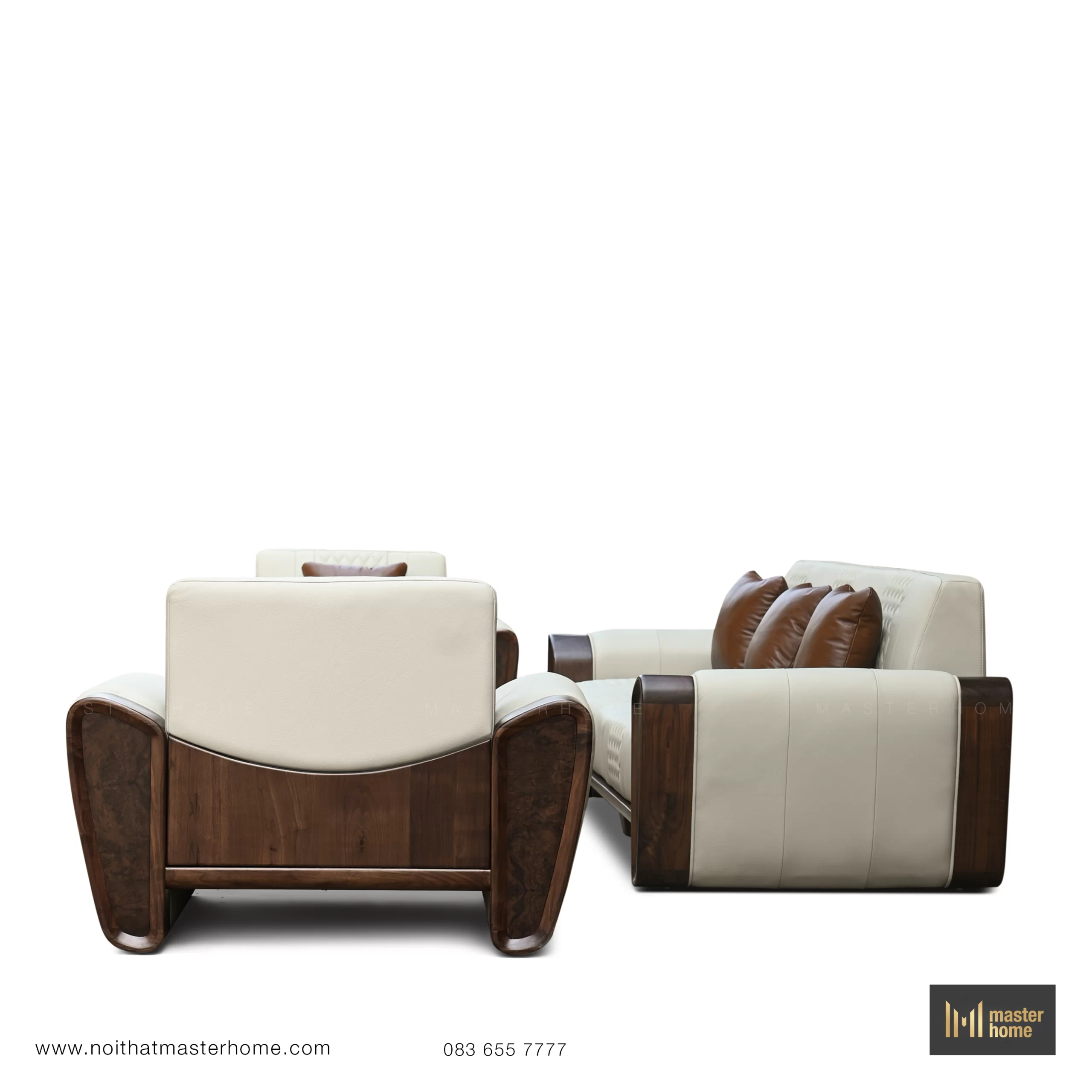 Bộ sofa gỗ Óc chó MBM-S02 (Da Bò Ý màu kem, ốp nu, mặt đá Viscostone) - MAS