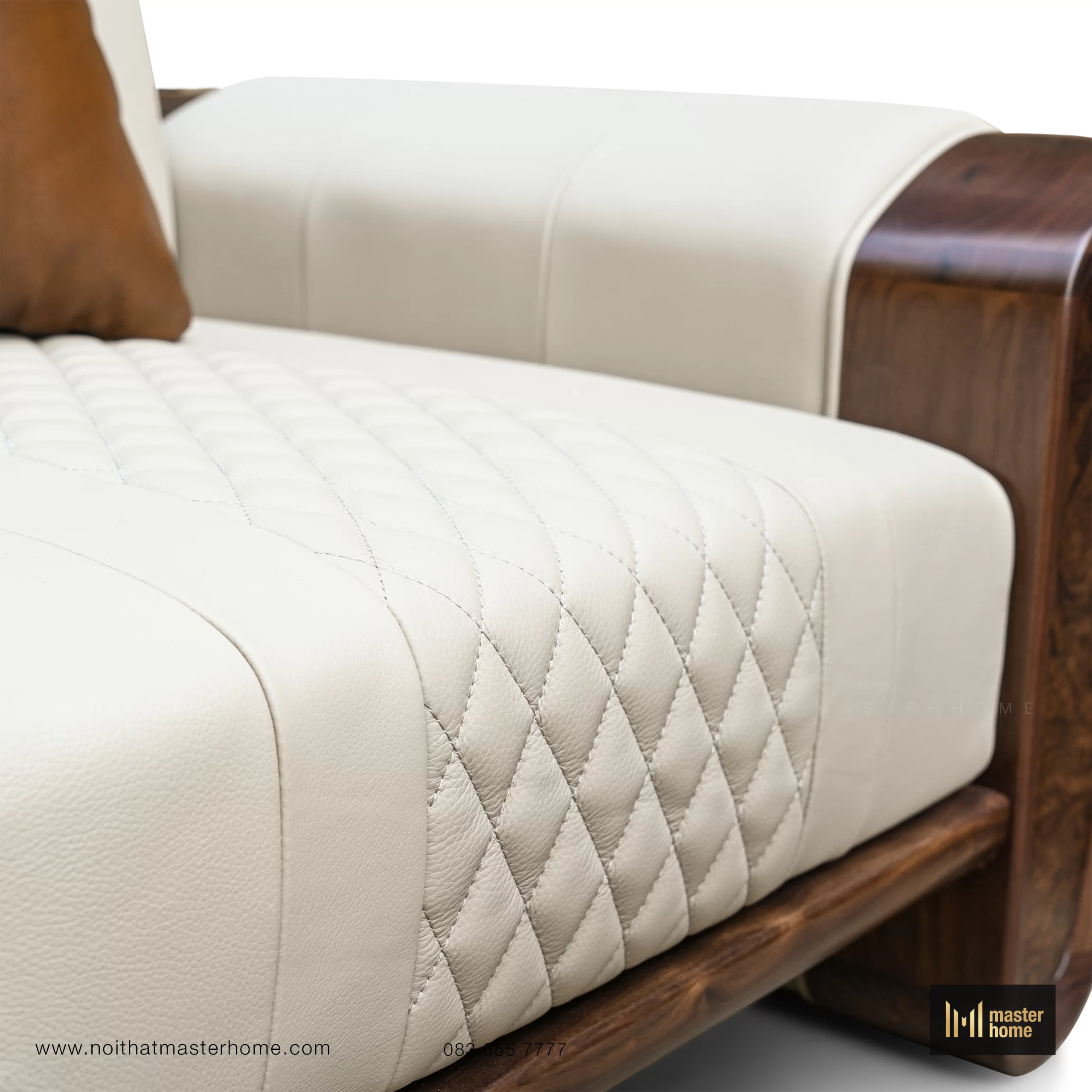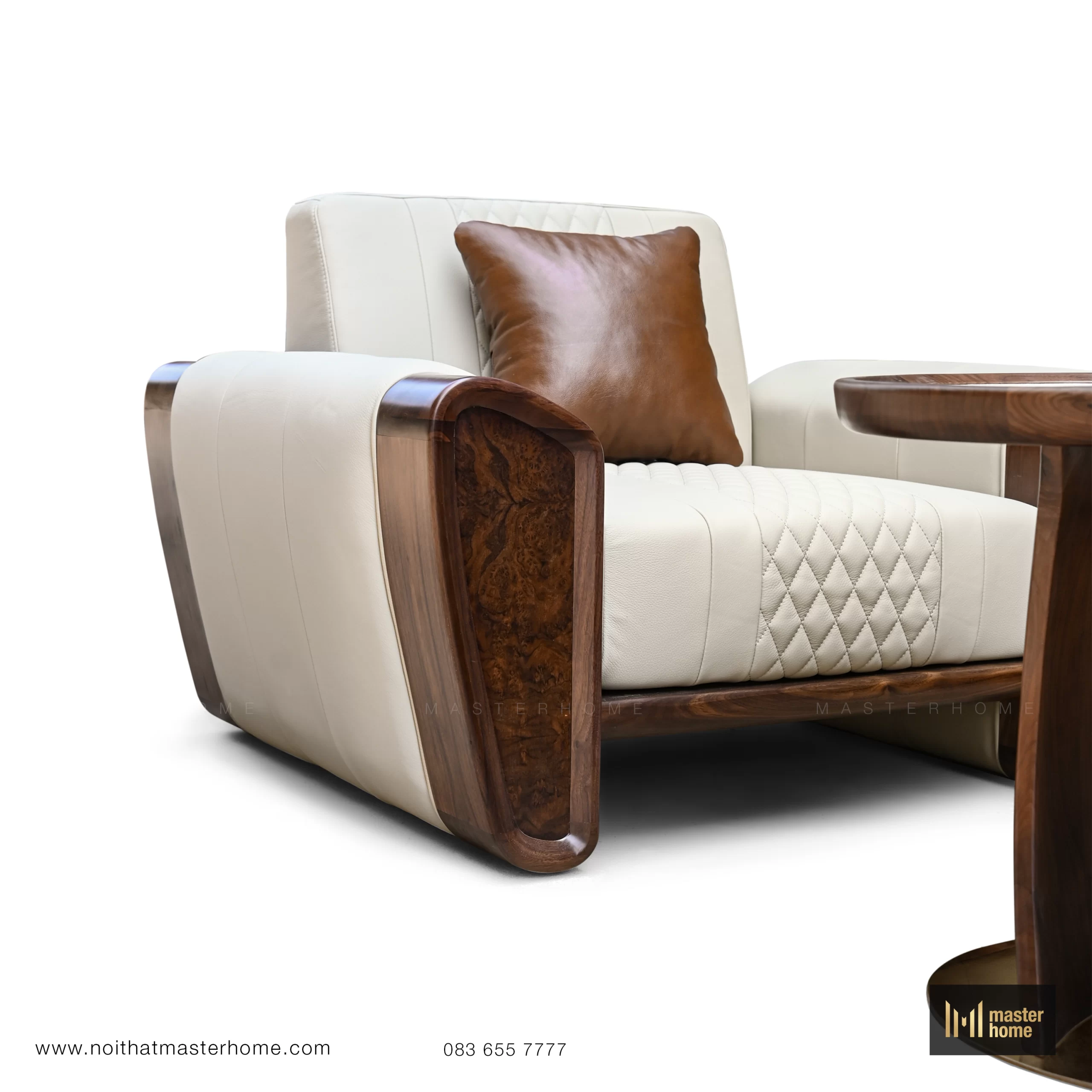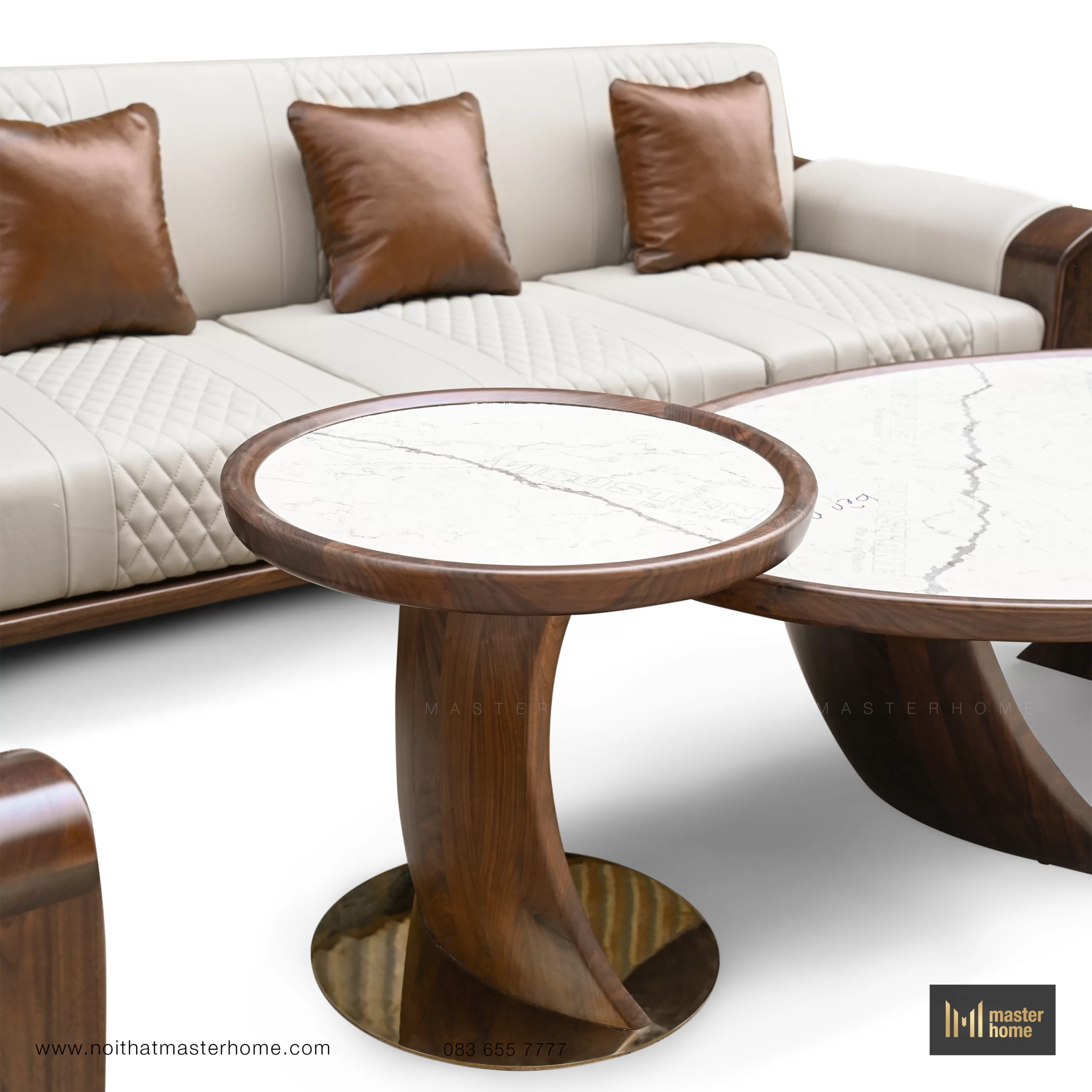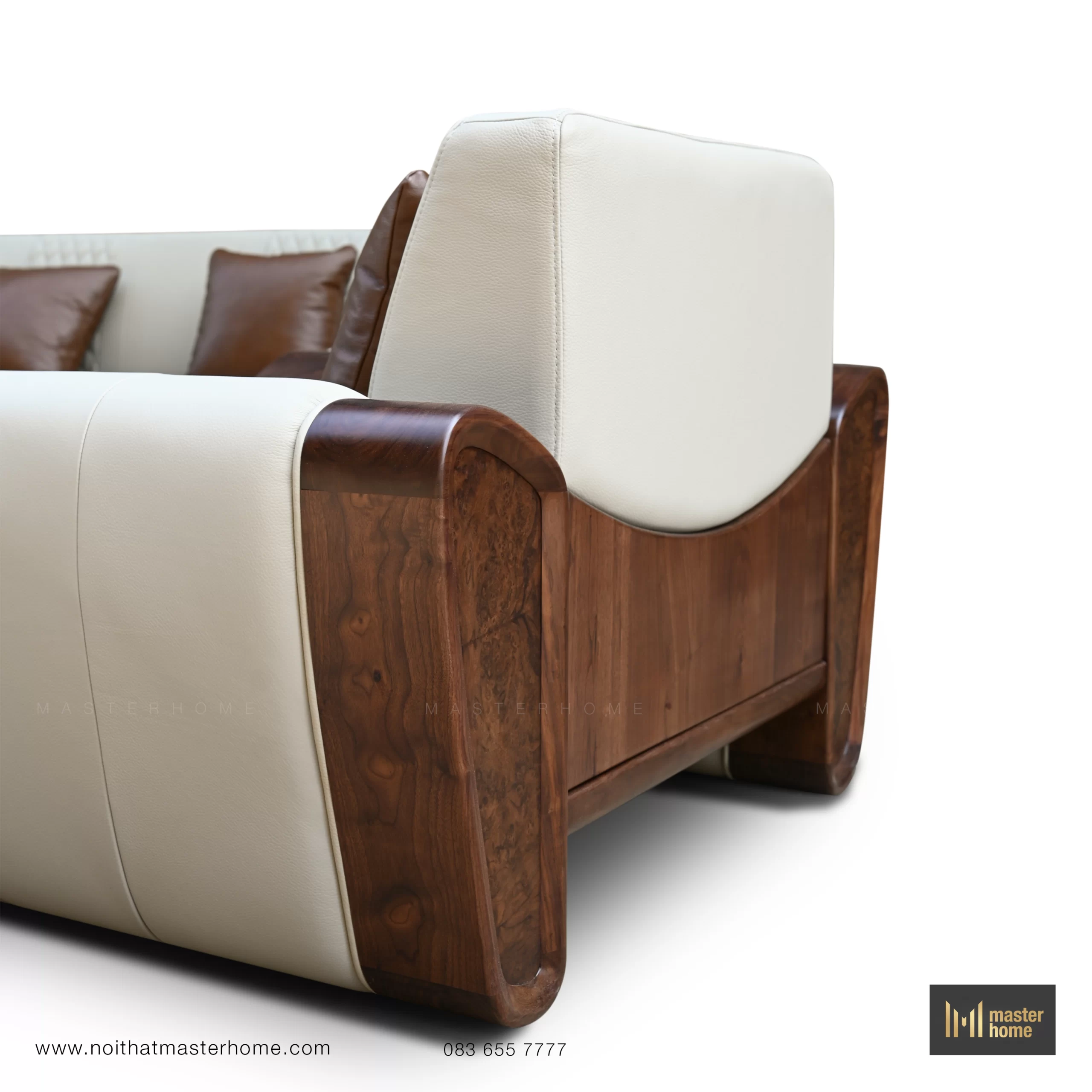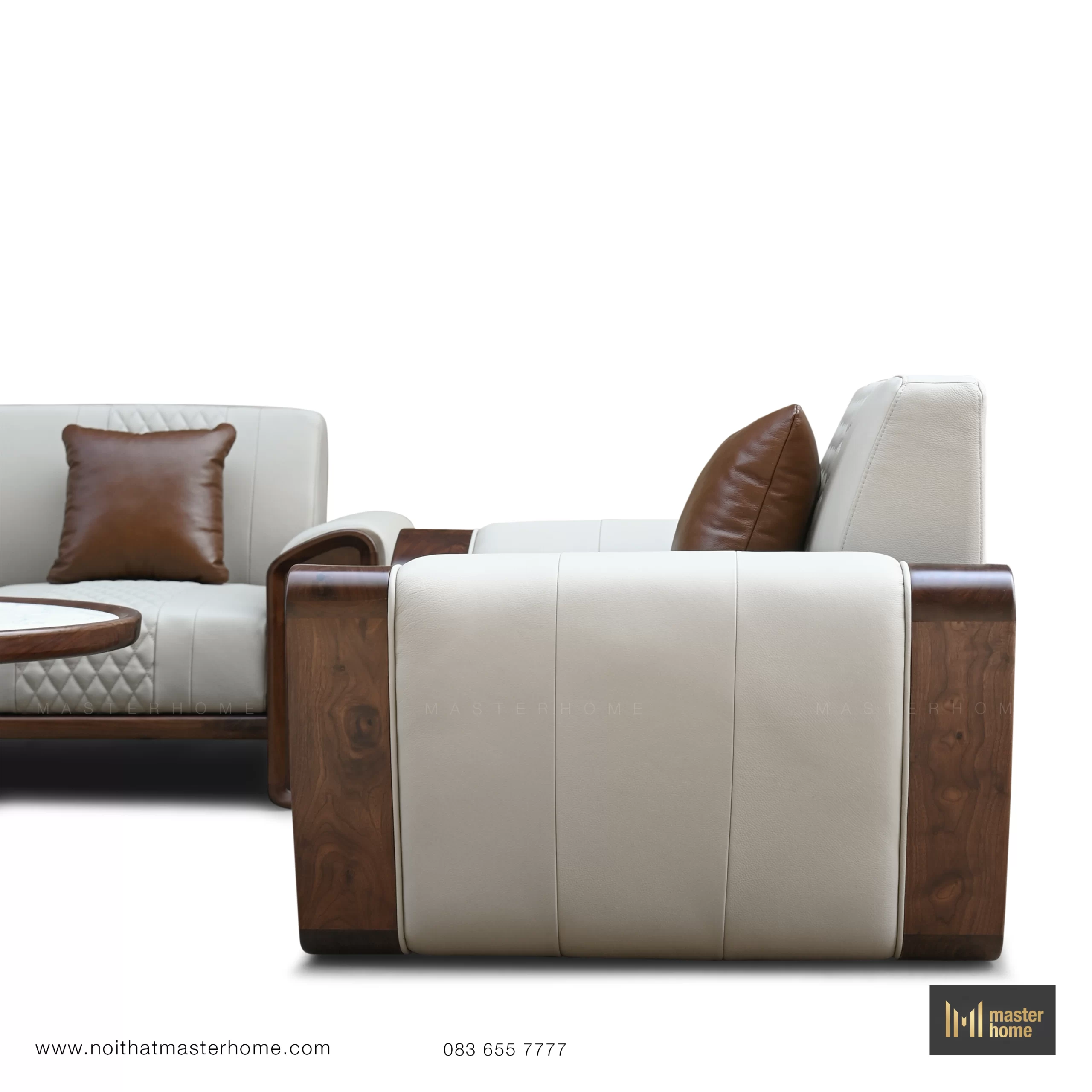 Bộ sofa gỗ Óc chó MBM-S02 (Da Bò Ý màu kem, ốp nu, mặt đá Viscostone) - MAS