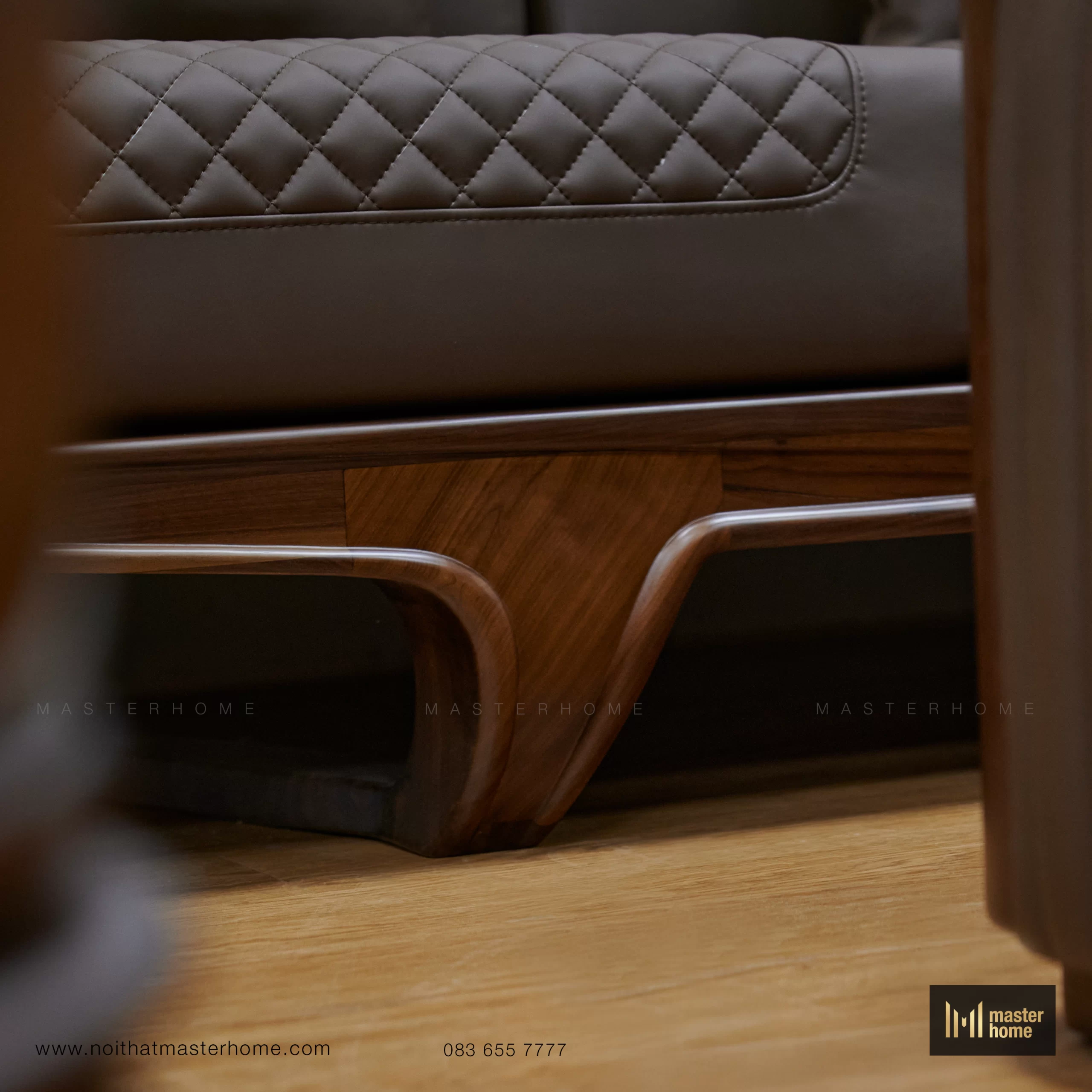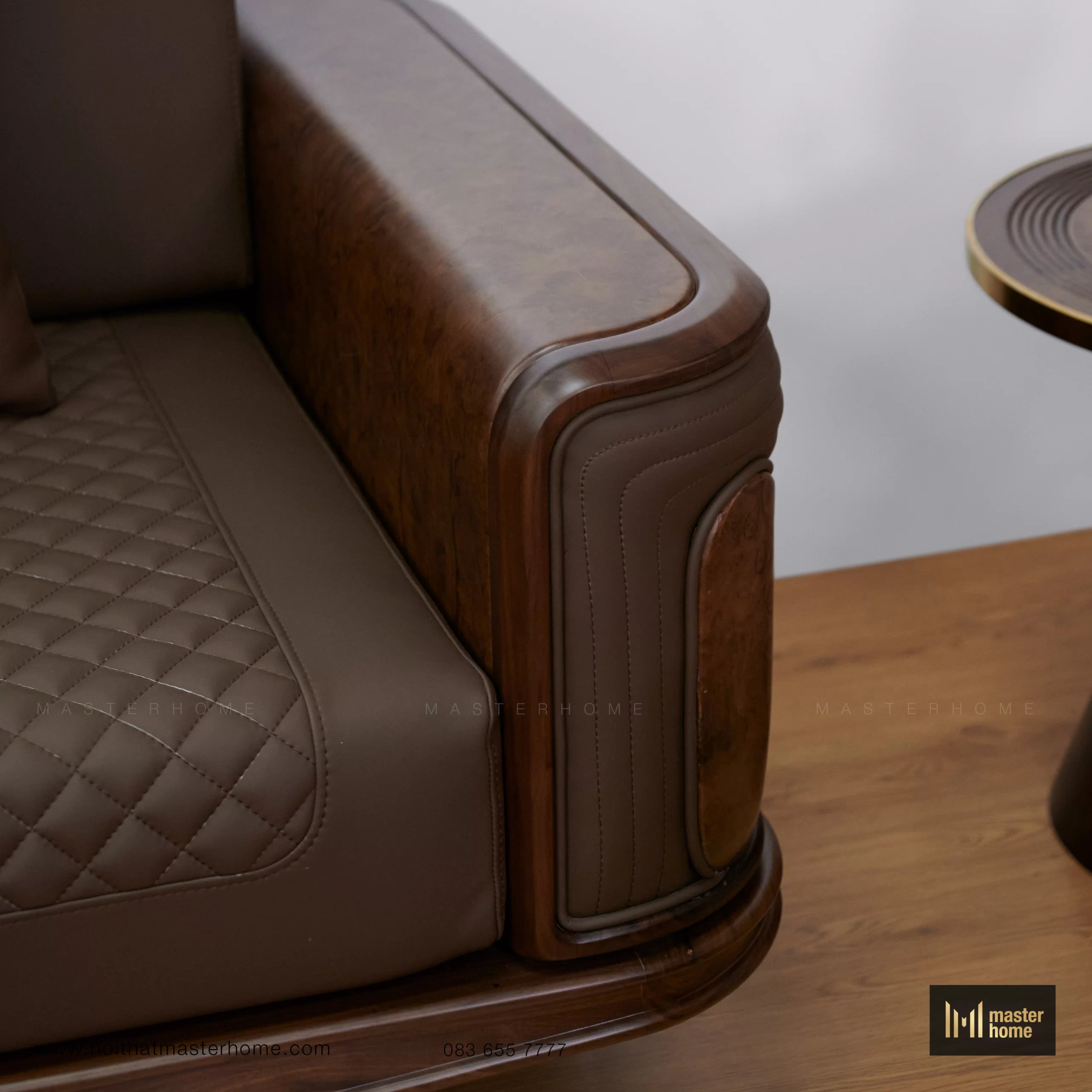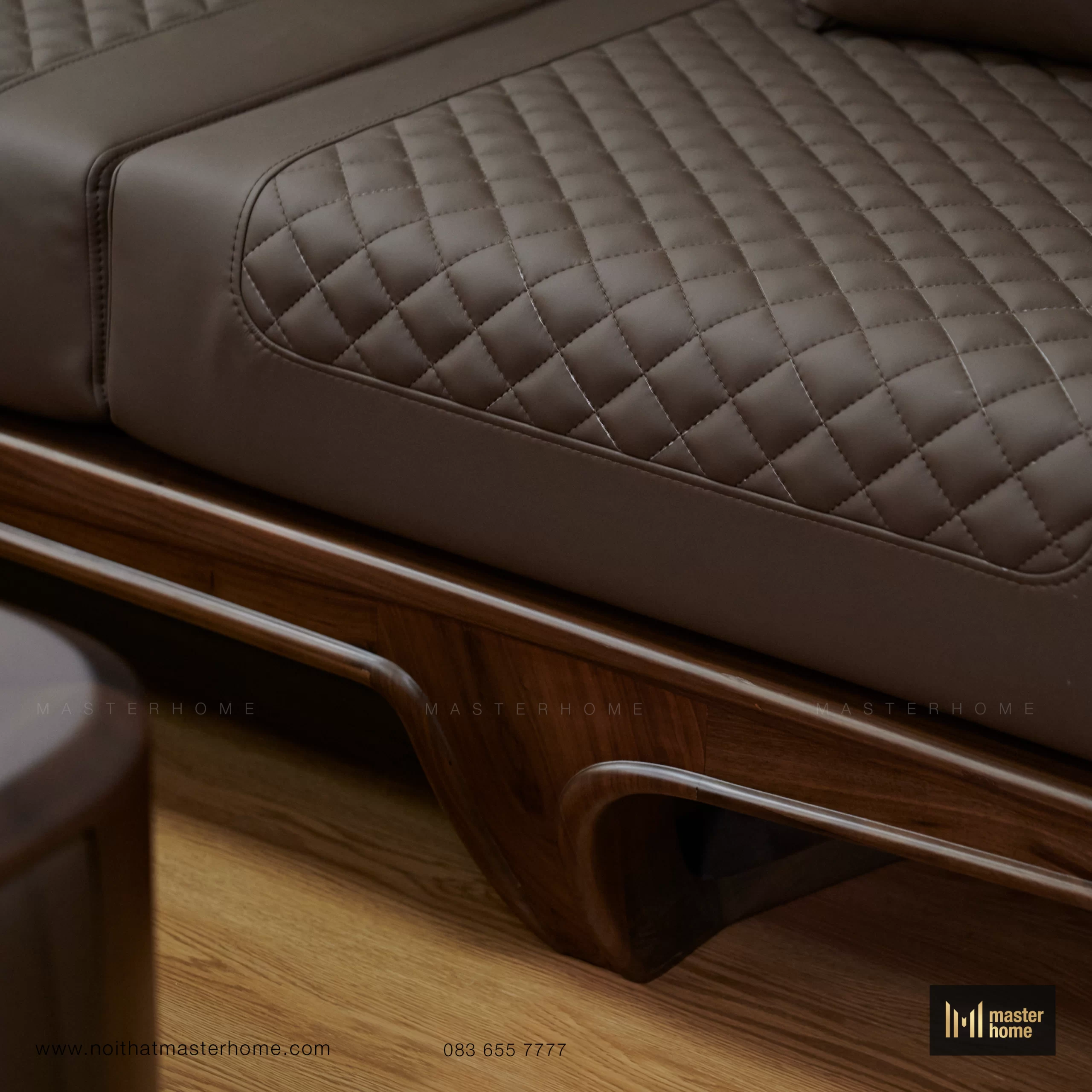- Bọc: Da cao cấp tông nâu đồng bộ với gỗ, bề mặt dập họa tiết nhỏ tạo độ bám khi ngồi và hạn chế nhăn.