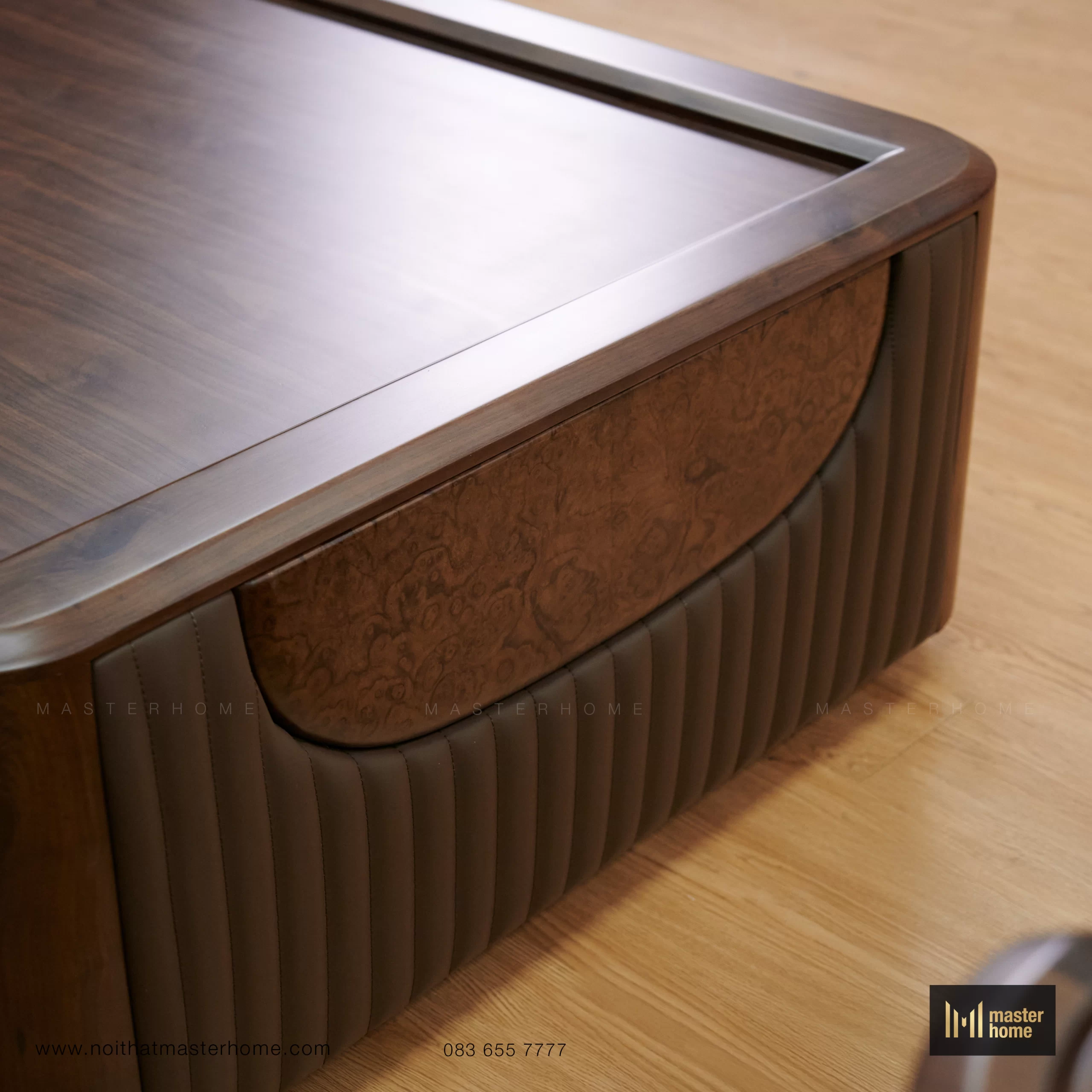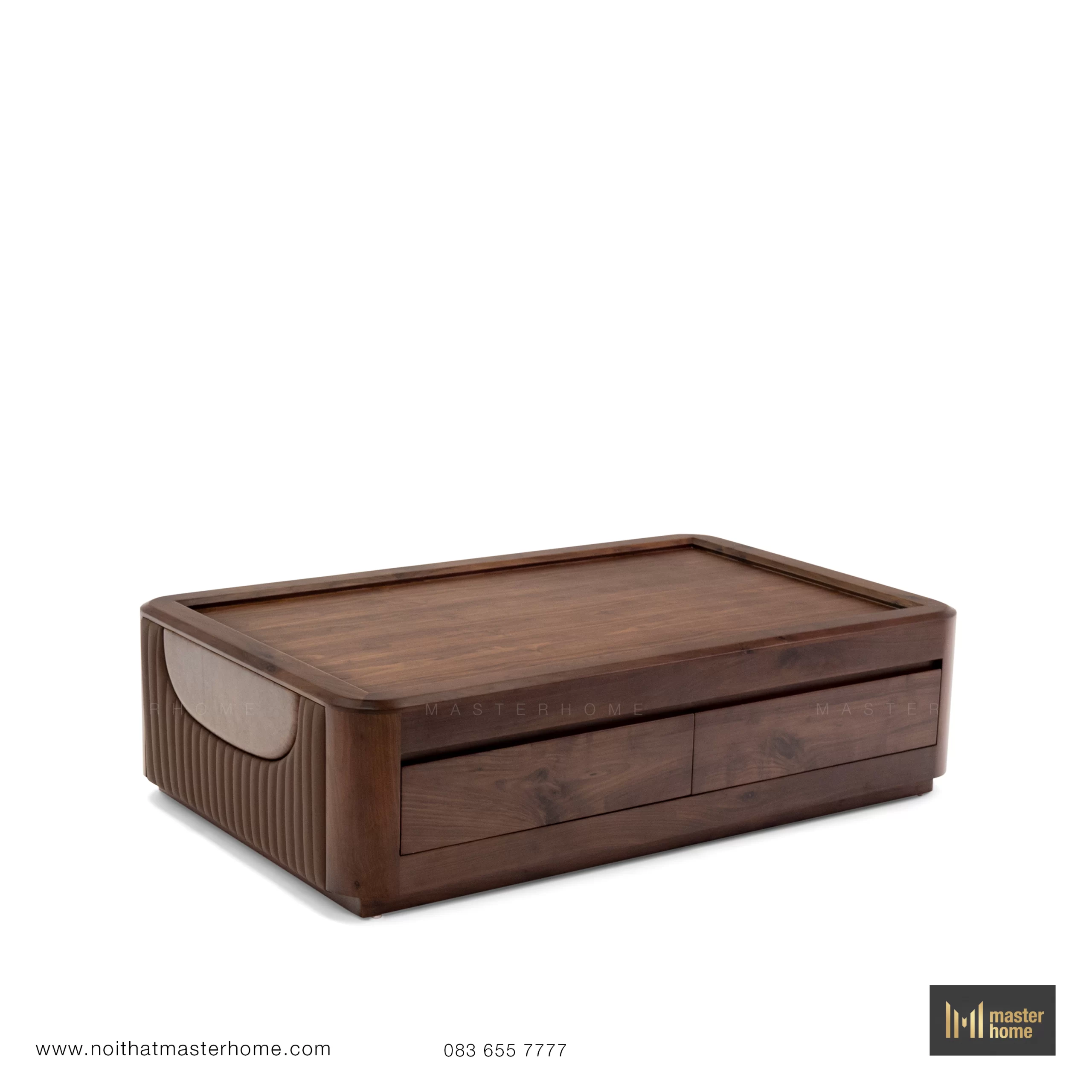 - Bàn trà và đôn: đồng bộ khung gỗ óc chó, mặt bàn rộng, cao độ tương thích với sofa cho trải nghiệm sử dụng thoải mái