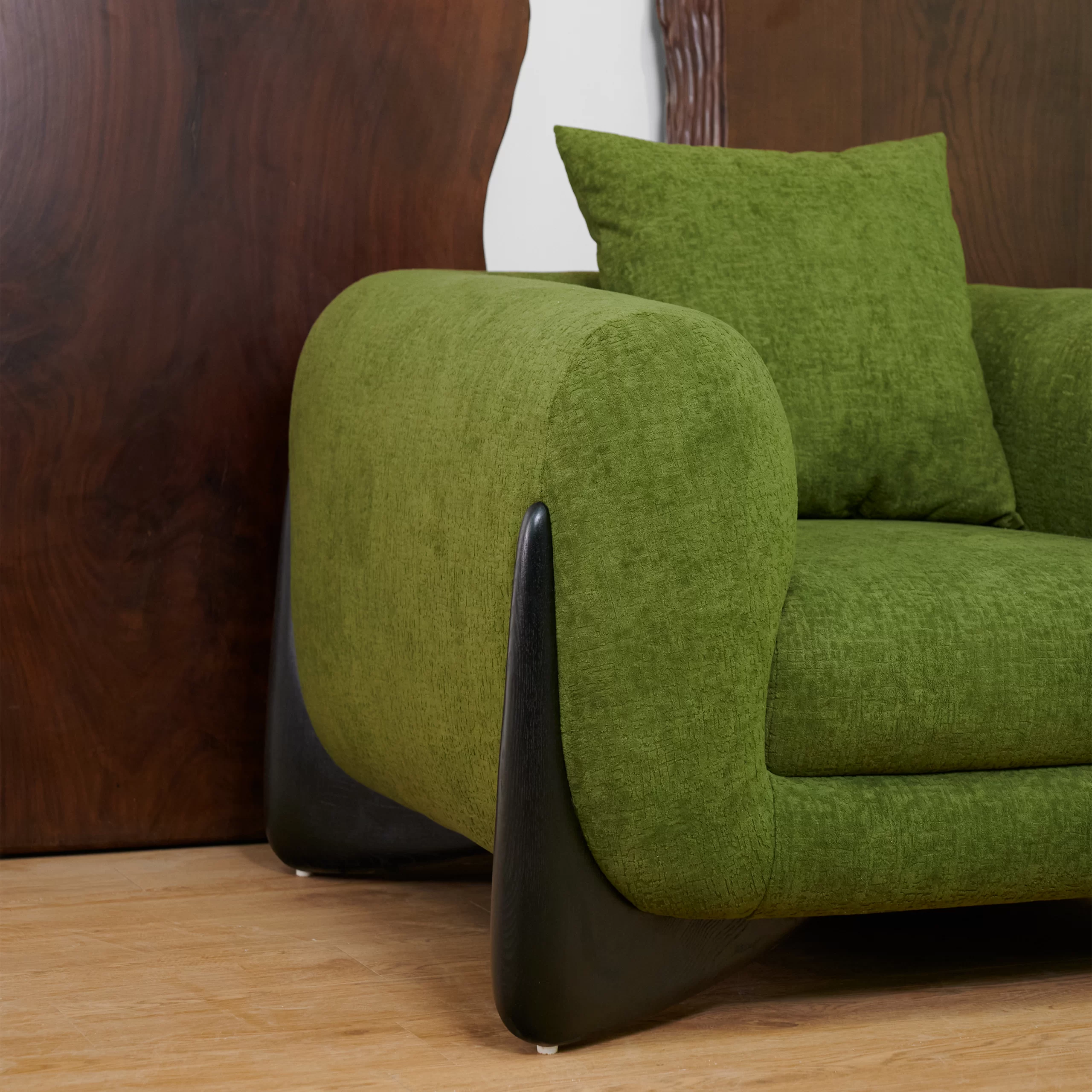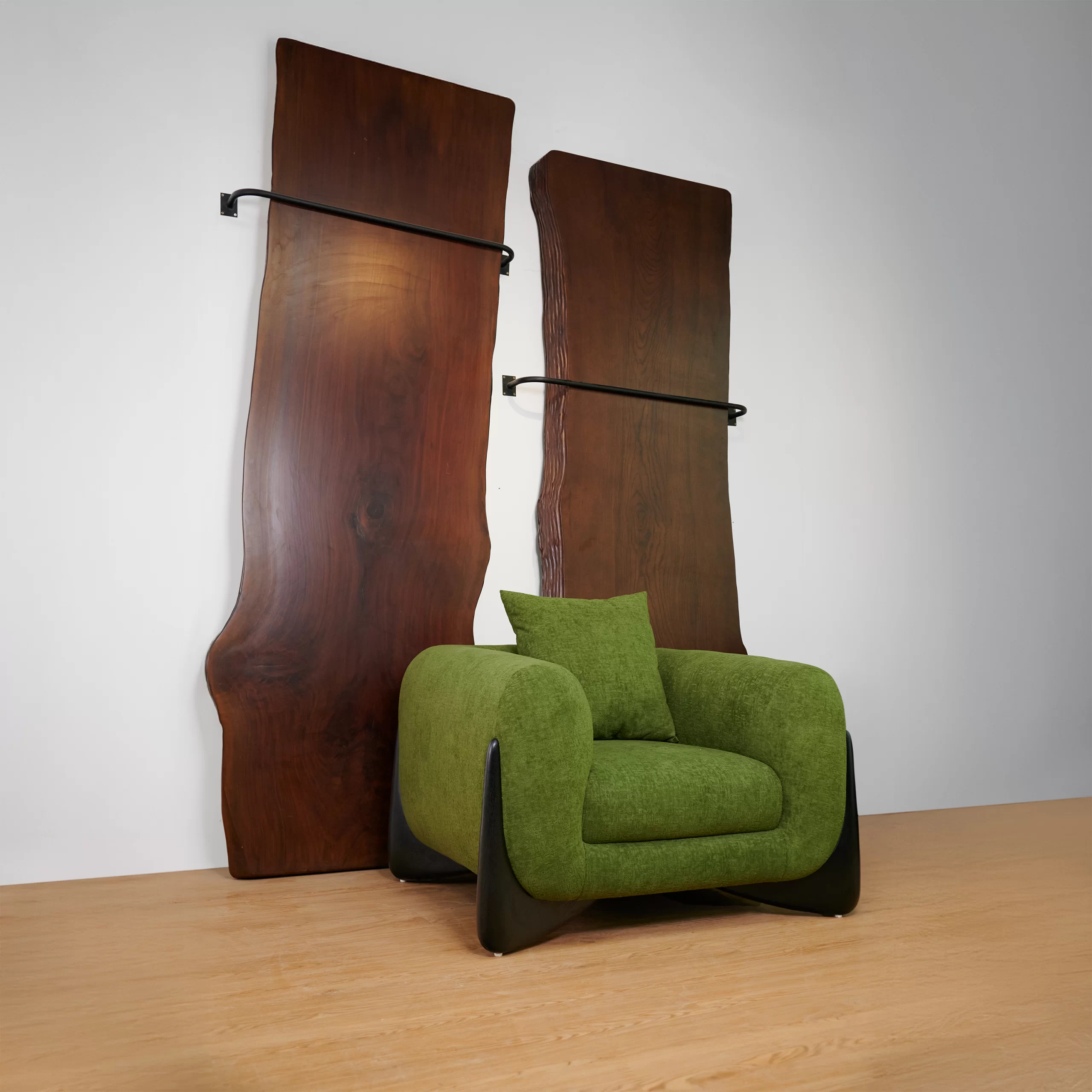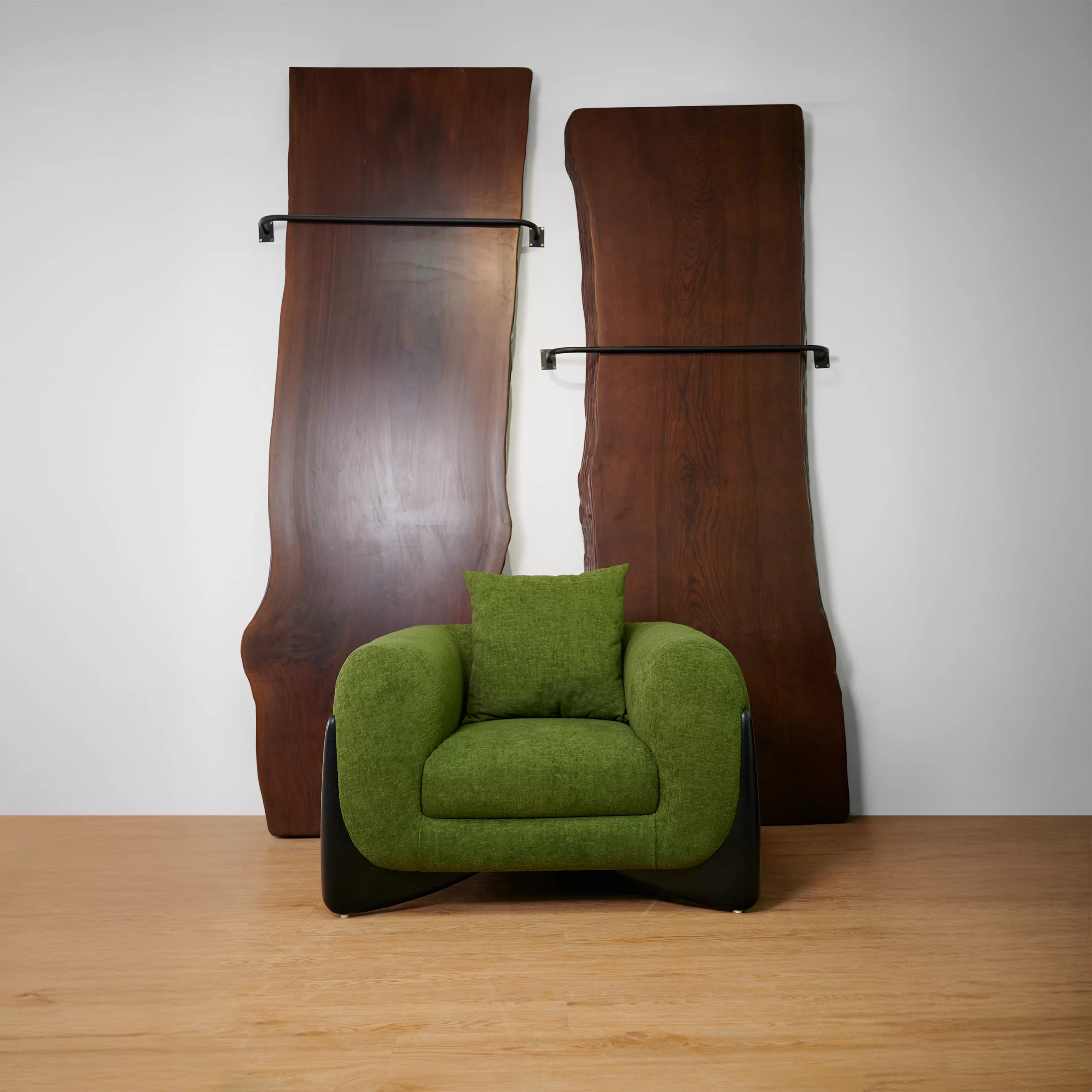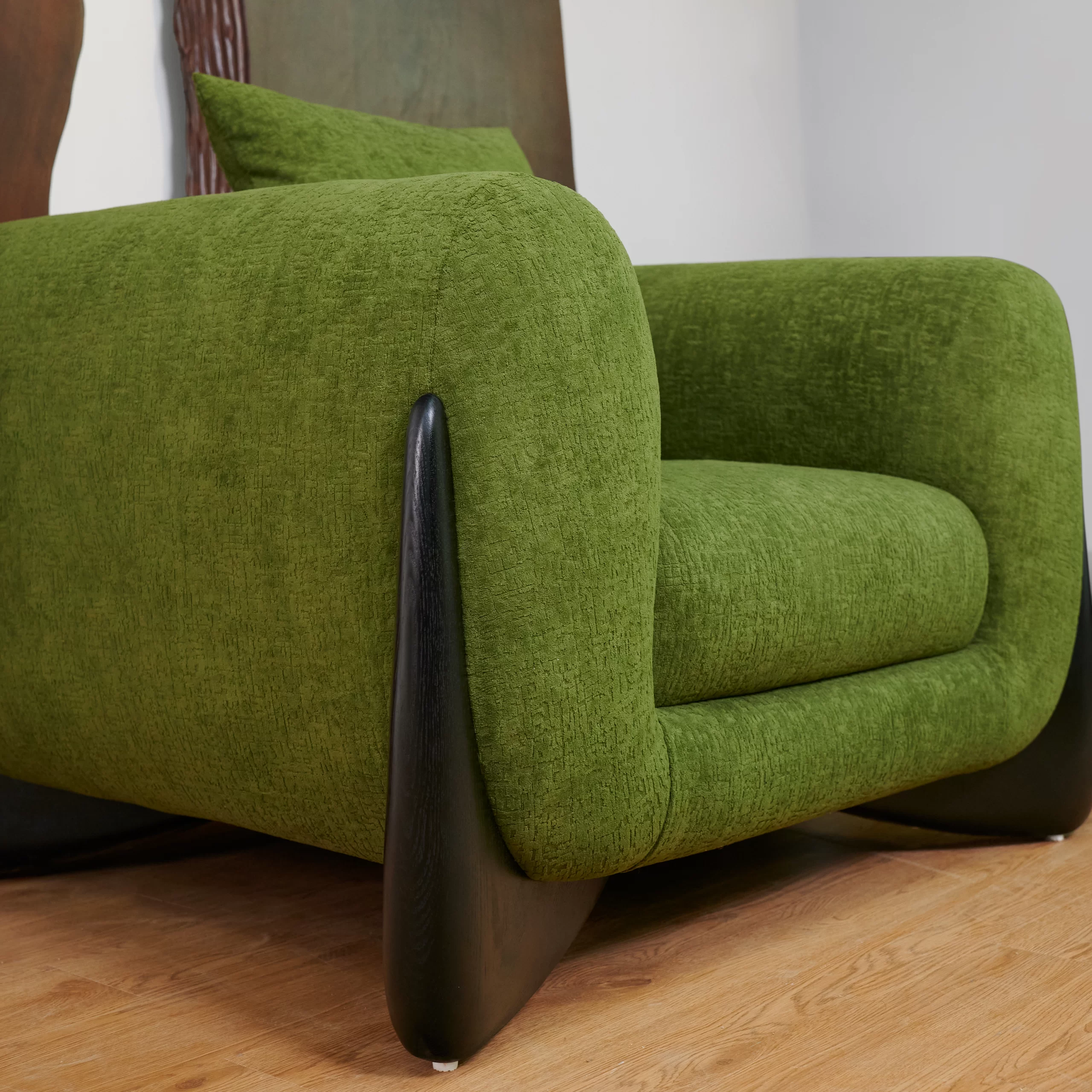 SOFTBAY là ghế bành ôm trọn cơ thể: thân ghế bo tròn, tay dày ấm áp, đệm ngồi sâu và gối lưng rời cho cảm giác “được ôm”. Phần chân gỗ khác biệt và nổi bật màu đen mờ nâng đỡ khối nệm như một cái kén — nhìn mềm, ngồi chắc. Hợp làm góc đọc sách, tiếp khách, lounge; đứng một mình vẫn nổi bật, đặt cặp cũng cân đối.
