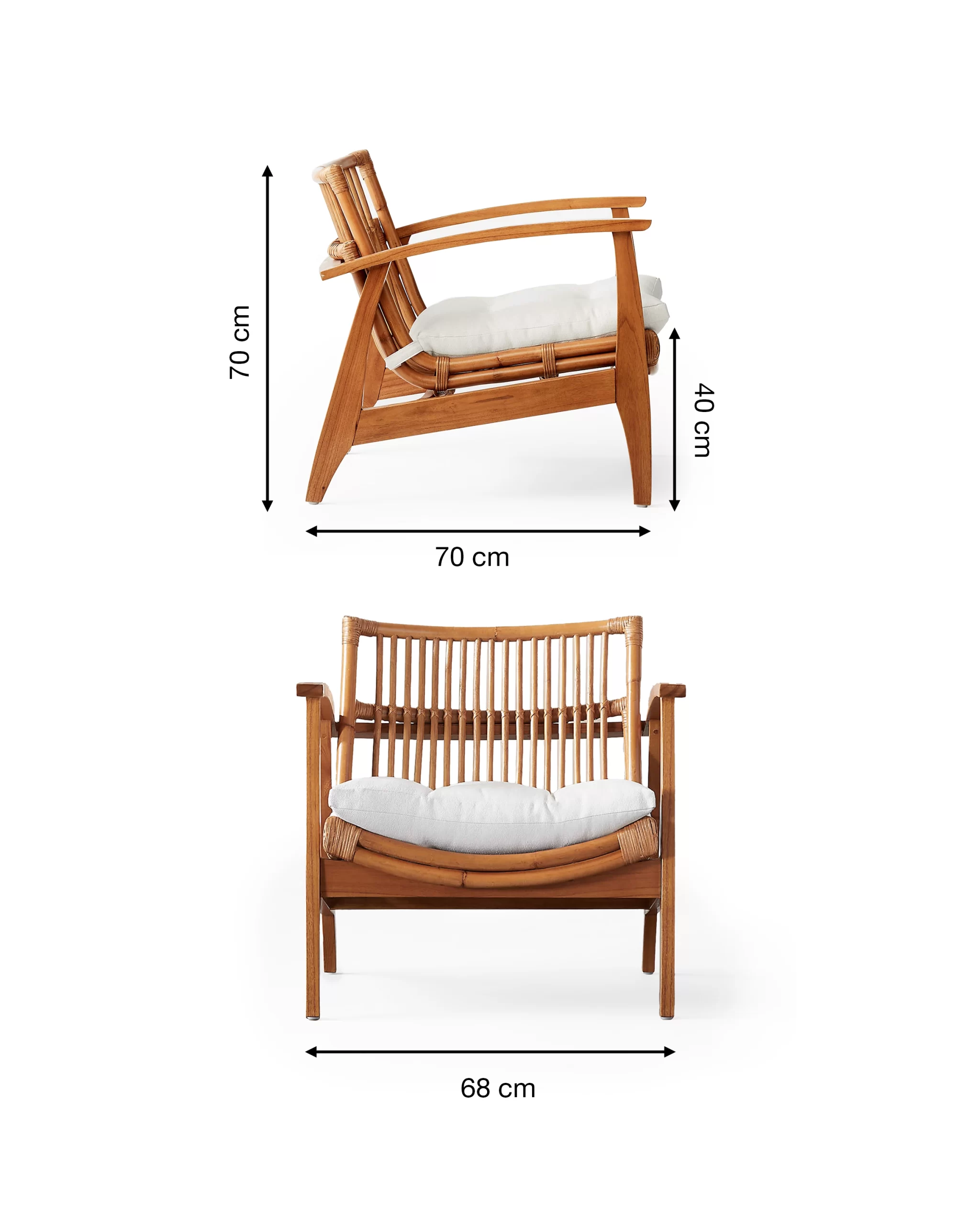 Đây là nơi sự ấm áp của gỗ gặp gỡ sự dẻo dai của mây tự nhiên. Khung gỗ tạo nên một hình bóng mạnh mẽ, vững chãi, trong khi những thanh mây được uốn cong khéo léo để tạo hình cho lưng và mặt ghế, ôm lấy cơ thể bạn một cách thoải mái và thoáng đãng.
