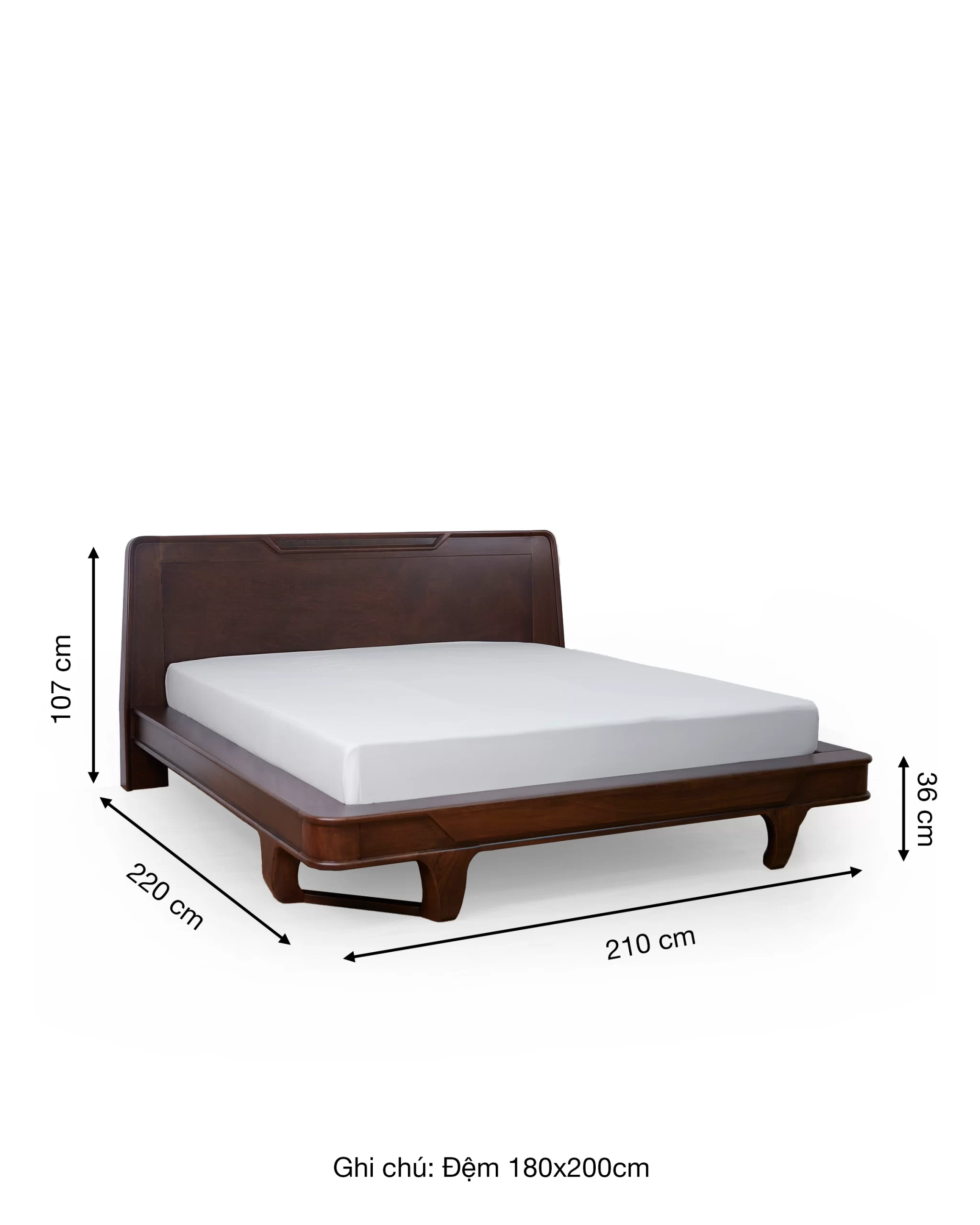 Phần vai giường được vát chéo tinh tế, kết nối xuống hệ chân gỗ đặc bên dưới. Chân giường lùi vào trong, tạo khoảng hở tối bên dưới giúp giường trông như đang lơ lửng trên sàn mà vẫn rất vững chãi. Tông màu nâu trầm của Gõ đỏ làm nổi bật vân gỗ tự nhiên, phù hợp với các không gian phòng ngủ sang trọng, tối giản.