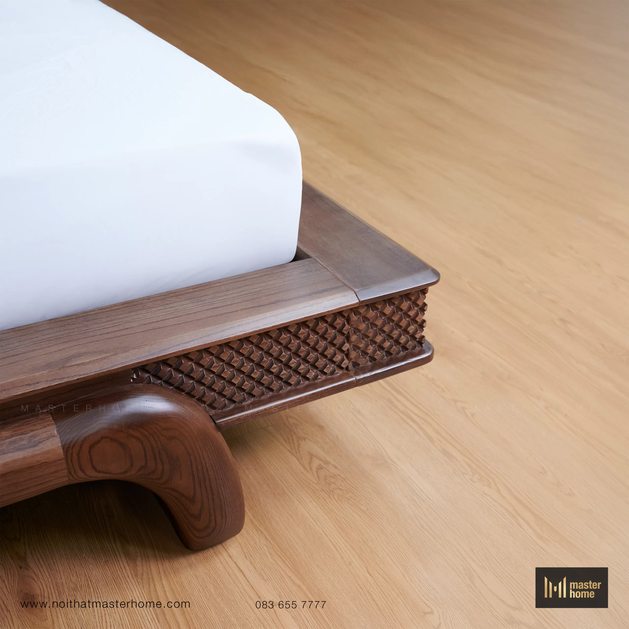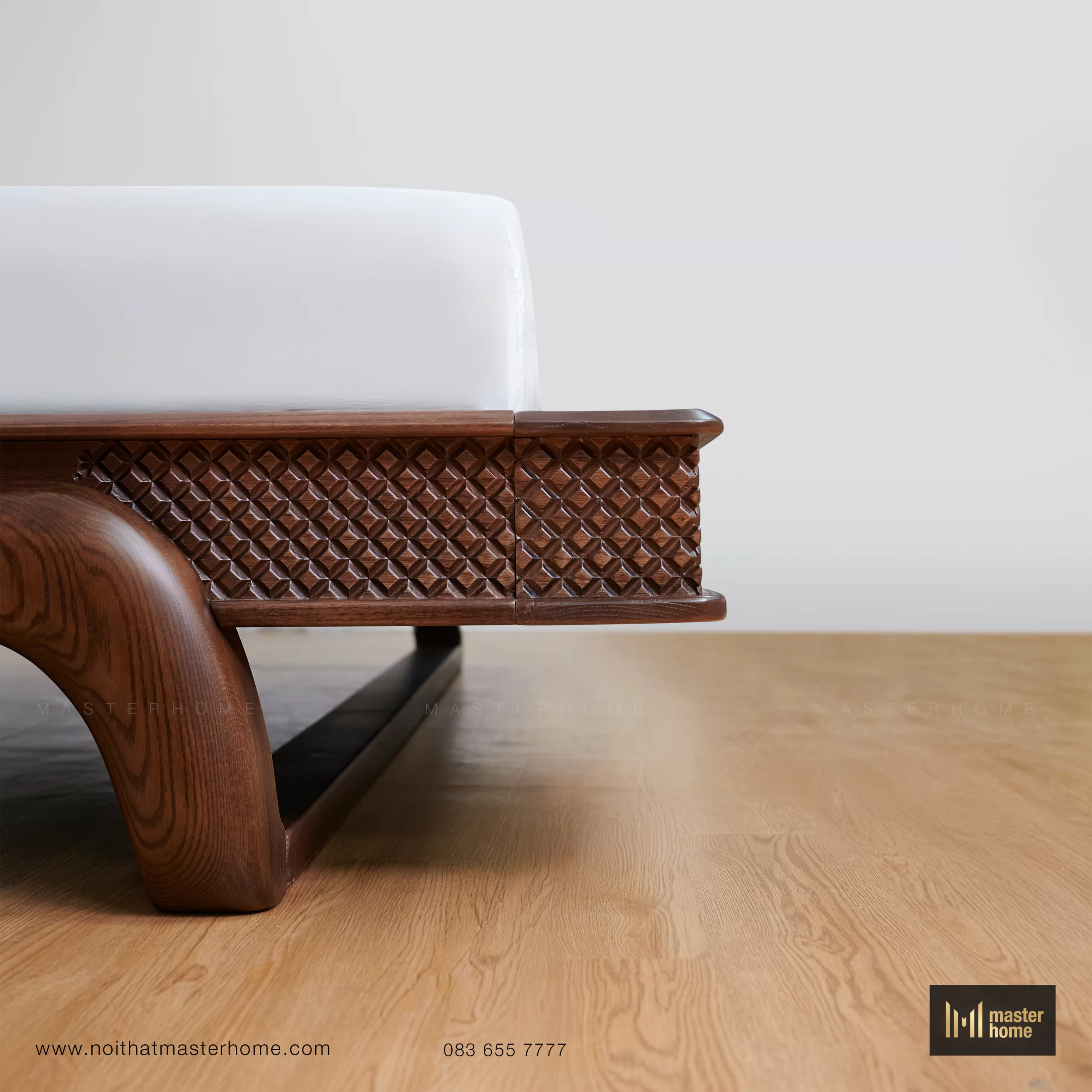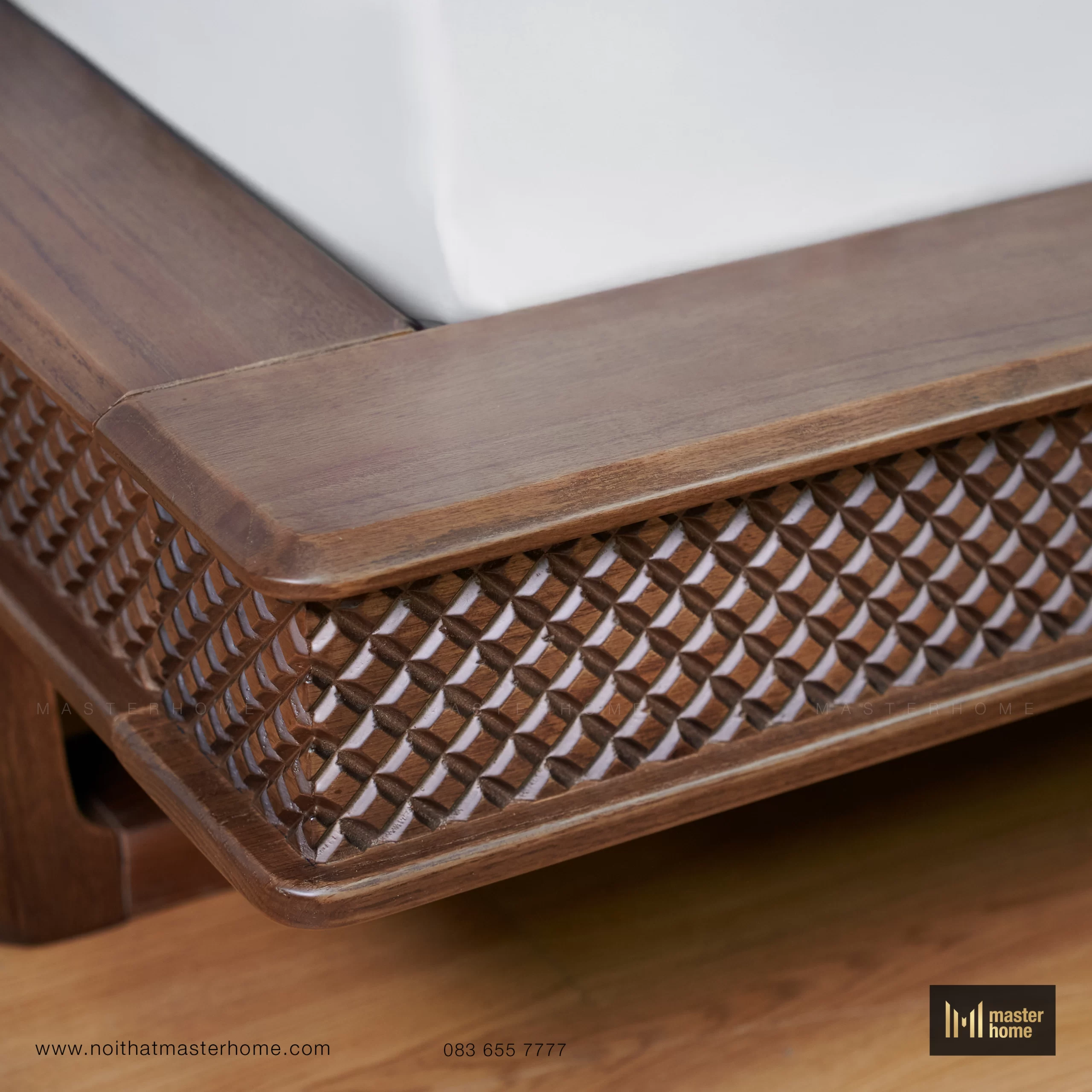 Điểm nhấn của thiết kế nằm ở diềm giường được chạm hoa văn caro nổi chạy dọc hai bên, tạo hiệu ứng ánh sáng – bóng đổ rất sống động, khiến tổng thể vừa mang hơi hướng Á Đông, vừa đủ hiện đại để đặt trong các không gian đương đại. Tông màu nâu trầm giúp MBM-B05 dễ phối với ga trắng, be hoặc các gam trung tính.