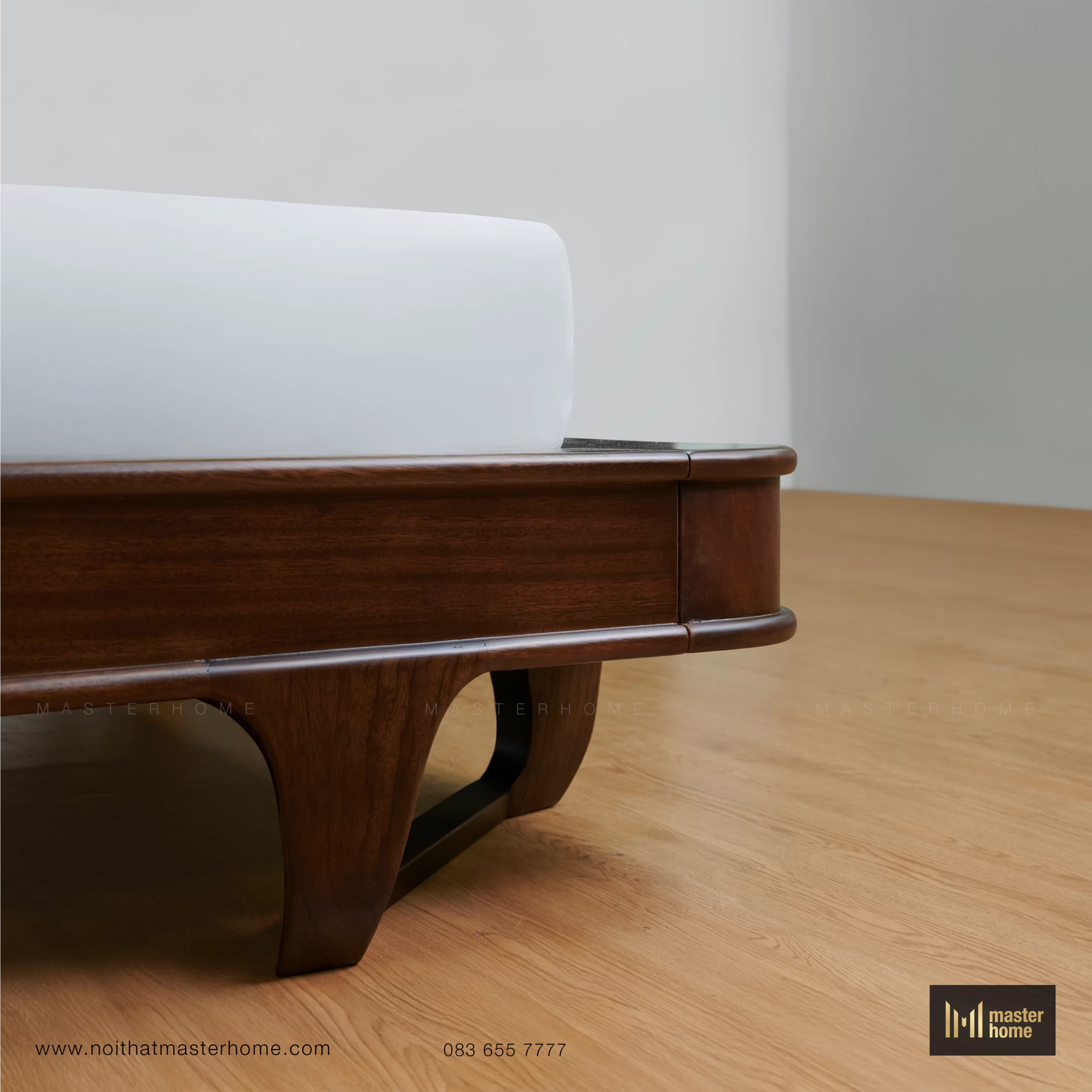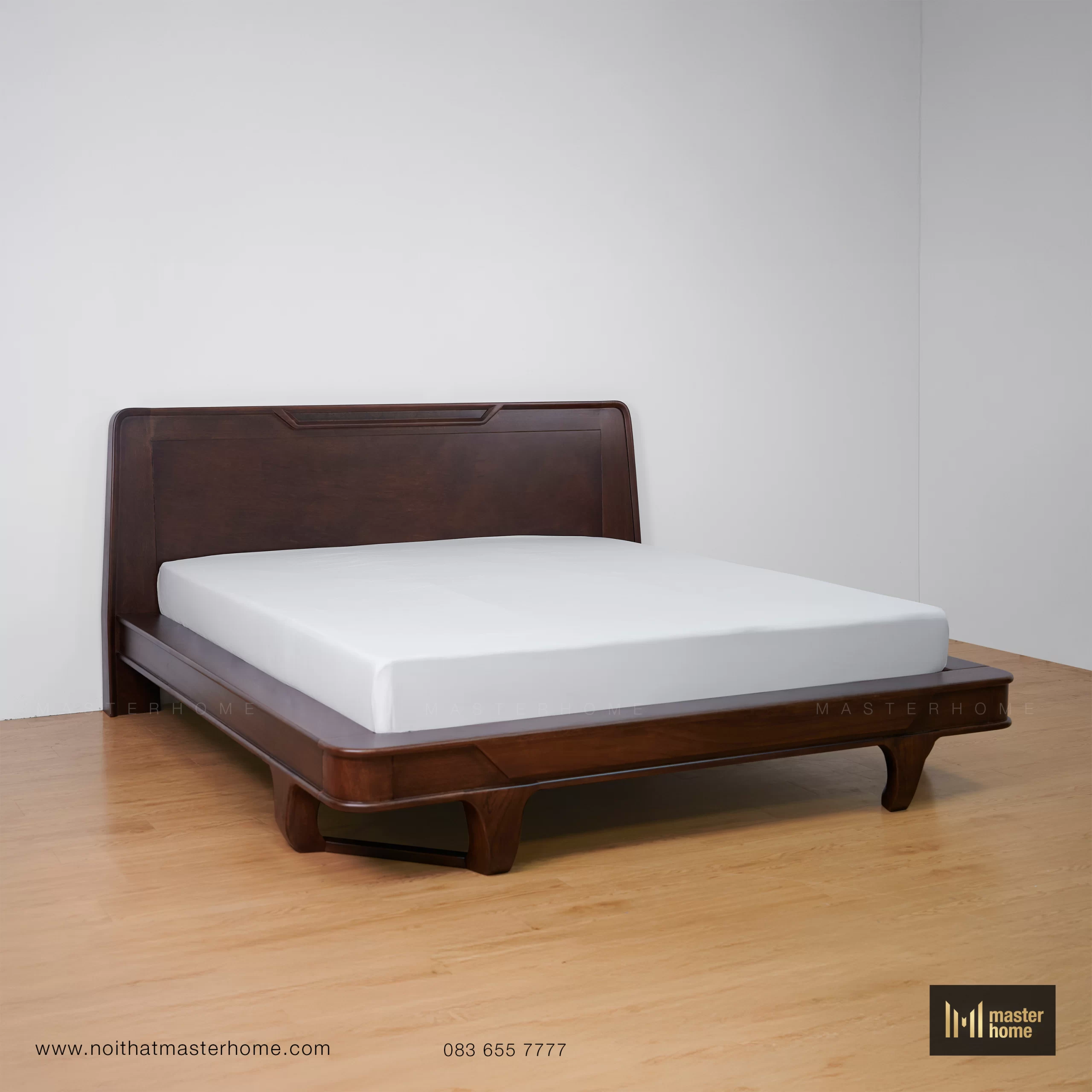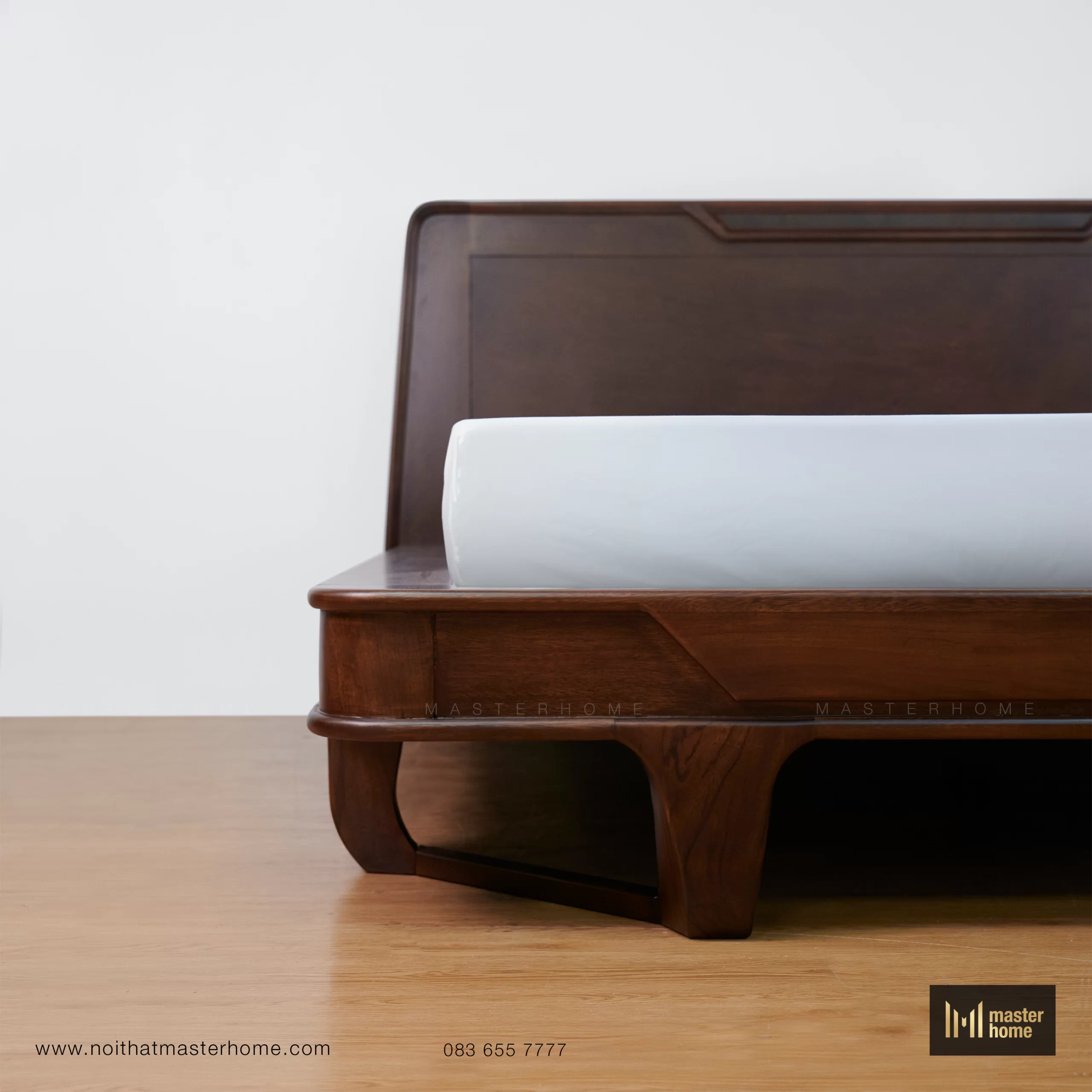 Phần vai giường được vát chéo tinh tế, kết nối xuống hệ chân gỗ đặc bên dưới. Chân giường lùi vào trong, tạo khoảng hở tối bên dưới giúp giường trông như đang lơ lửng trên sàn mà vẫn rất vững chãi. Tông màu nâu trầm của Gõ đỏ làm nổi bật vân gỗ tự nhiên, phù hợp với các không gian phòng ngủ sang trọng, tối giản.