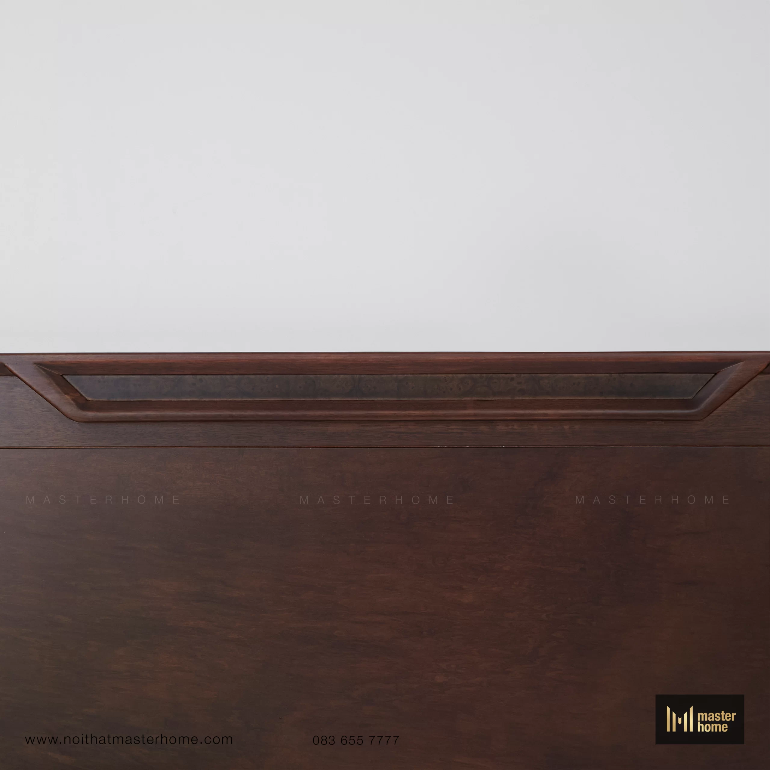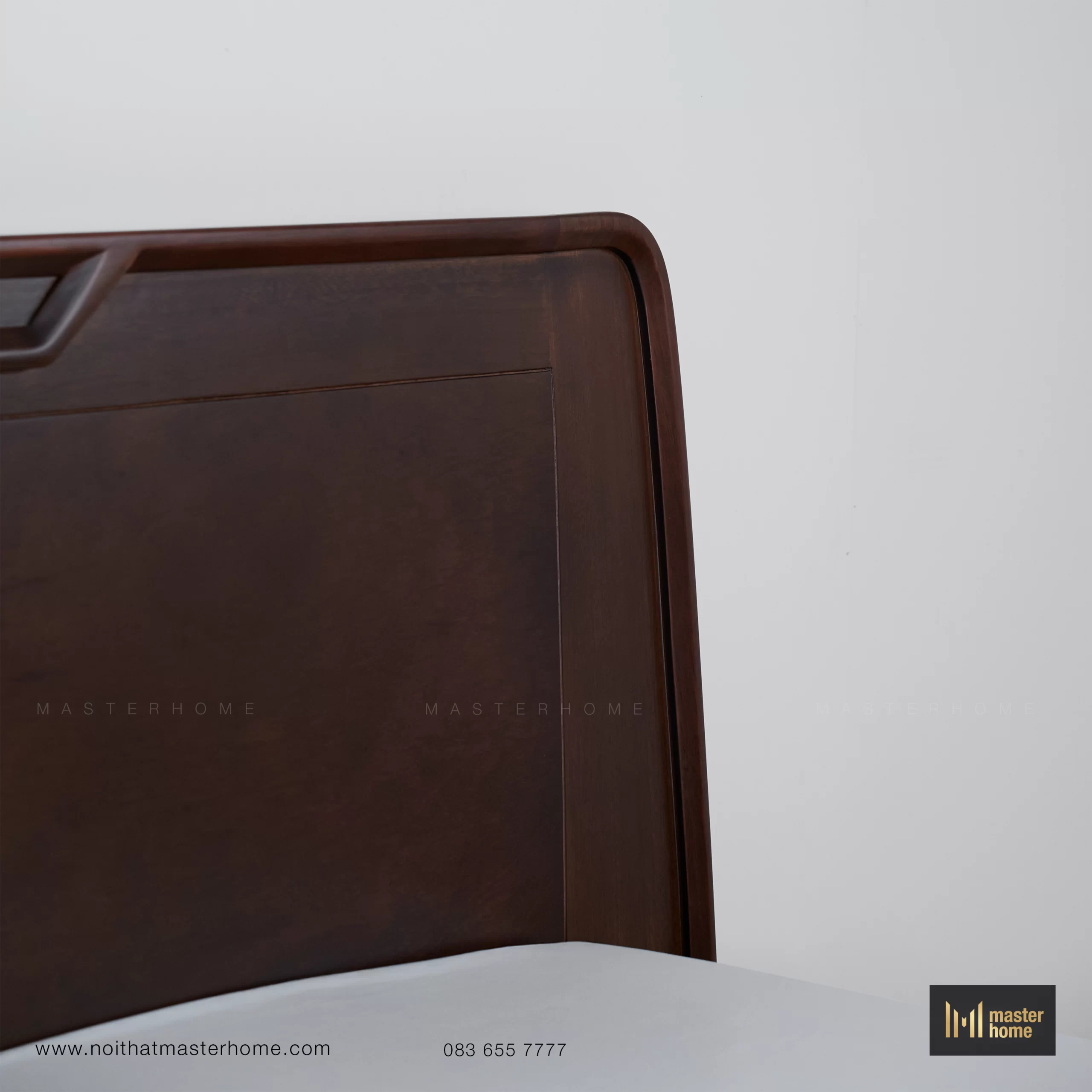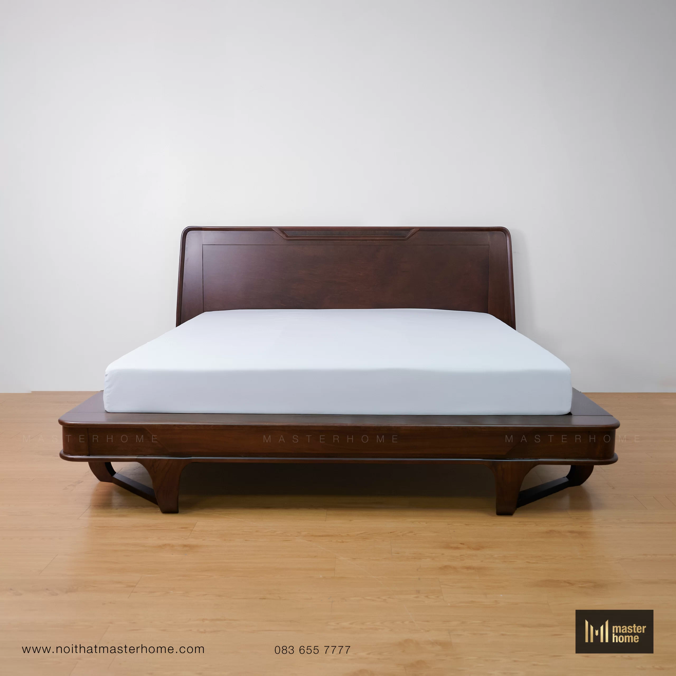 Phần vai giường được vát chéo tinh tế, kết nối xuống hệ chân gỗ đặc bên dưới. Chân giường lùi vào trong, tạo khoảng hở tối bên dưới giúp giường trông như đang lơ lửng trên sàn mà vẫn rất vững chãi. Tông màu nâu trầm của Gõ đỏ làm nổi bật vân gỗ tự nhiên, phù hợp với các không gian phòng ngủ sang trọng, tối giản.