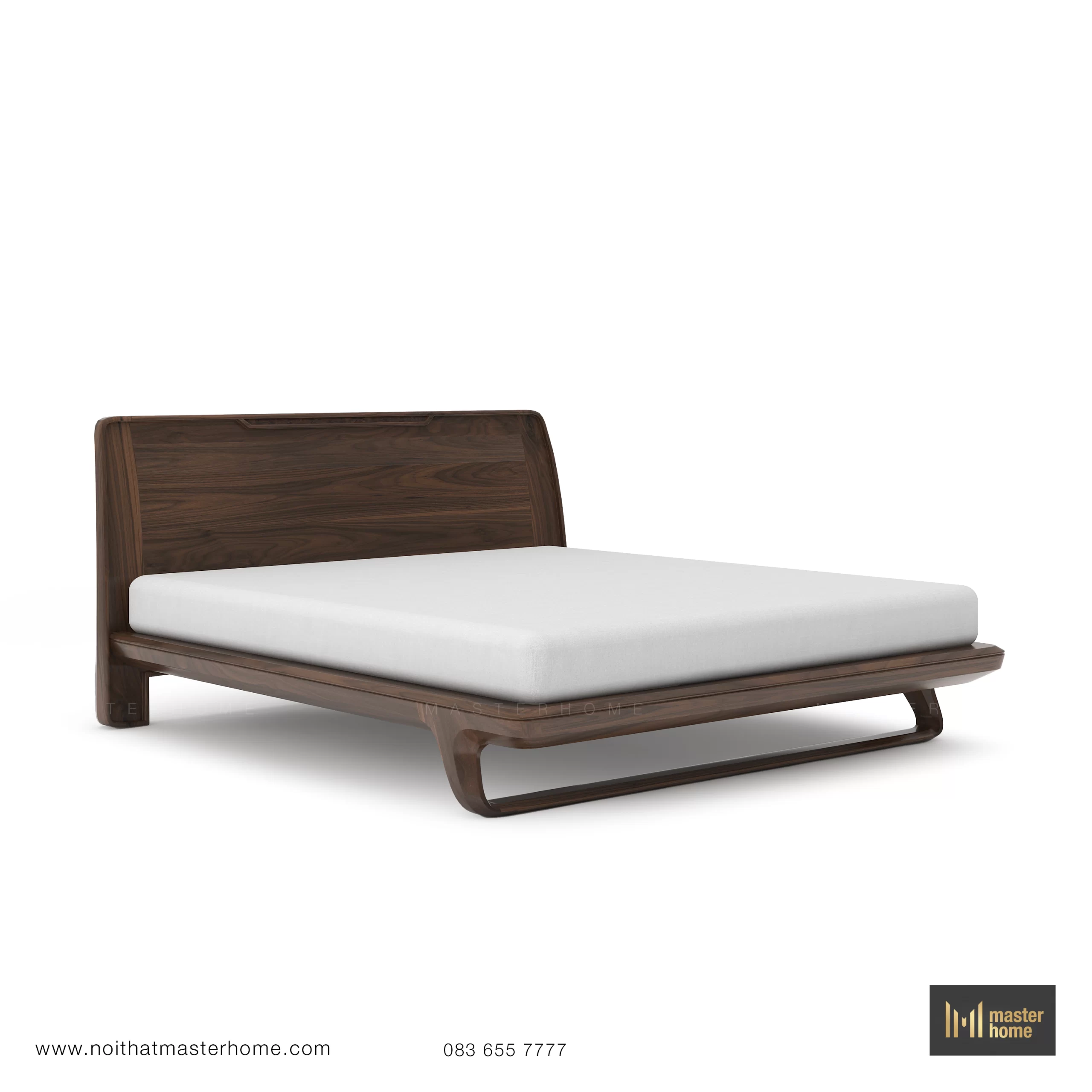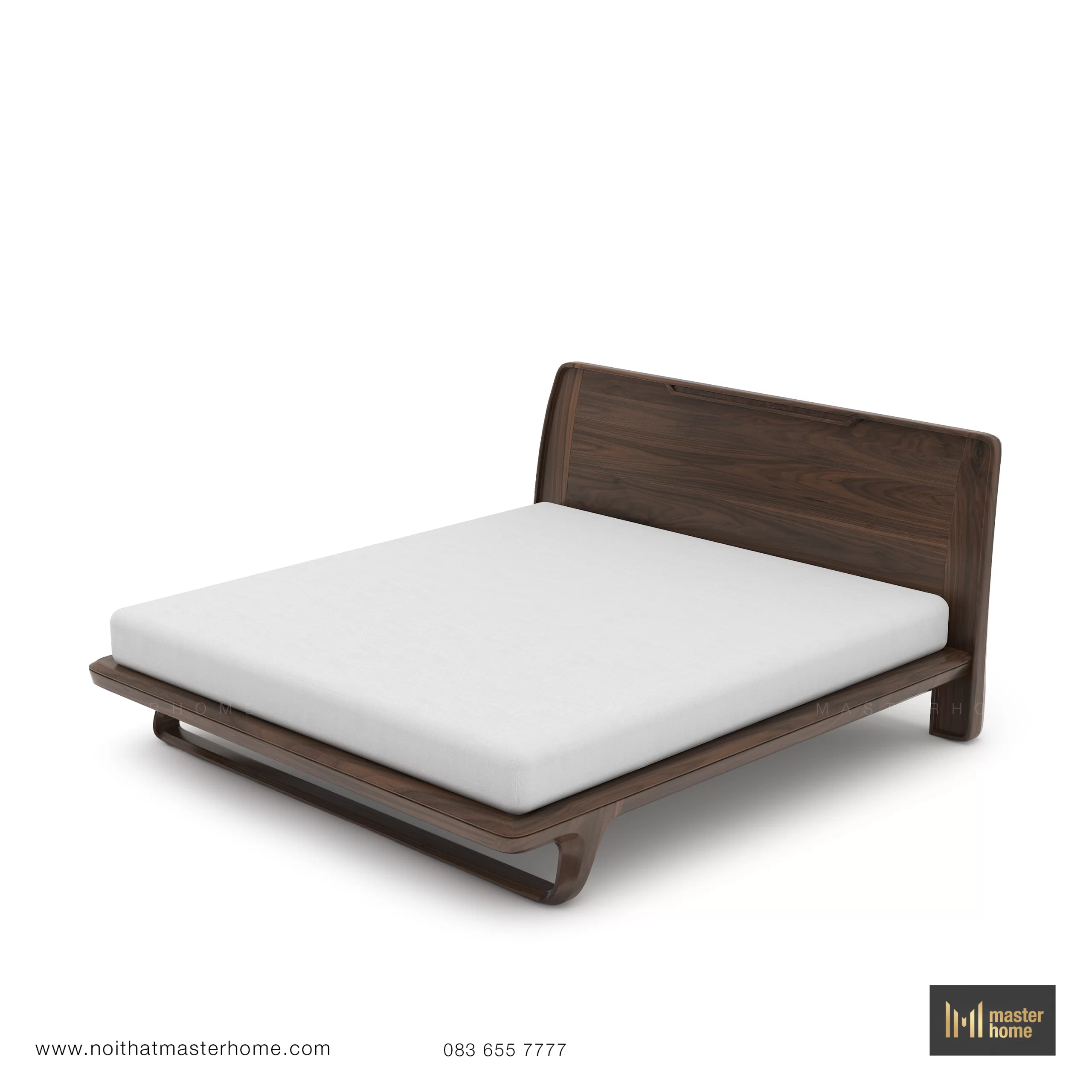 MBM-B02 là mẫu giường gỗ óc chó tối giản, nhấn mạnh vào tỉ lệ và đường cong mềm. Khung giường thấp, mặt nệm như “nổi” trên khối gỗ, giúp phòng ngủ nhìn rộng và thoáng hơn. Phần đầu giường là một tấm gỗ óc chó lớn, hơi ngả về sau, bo cong nhẹ ở mép trên, tạo cảm giác vững nhưng không nặng. Bên dưới, hệ chân sled liền khối chạy dọc thân giường tạo đường viền đặc trưng khi nhìn ngang – vừa là chi tiết thiết kế, vừa là kết cấu chịu lực chính.