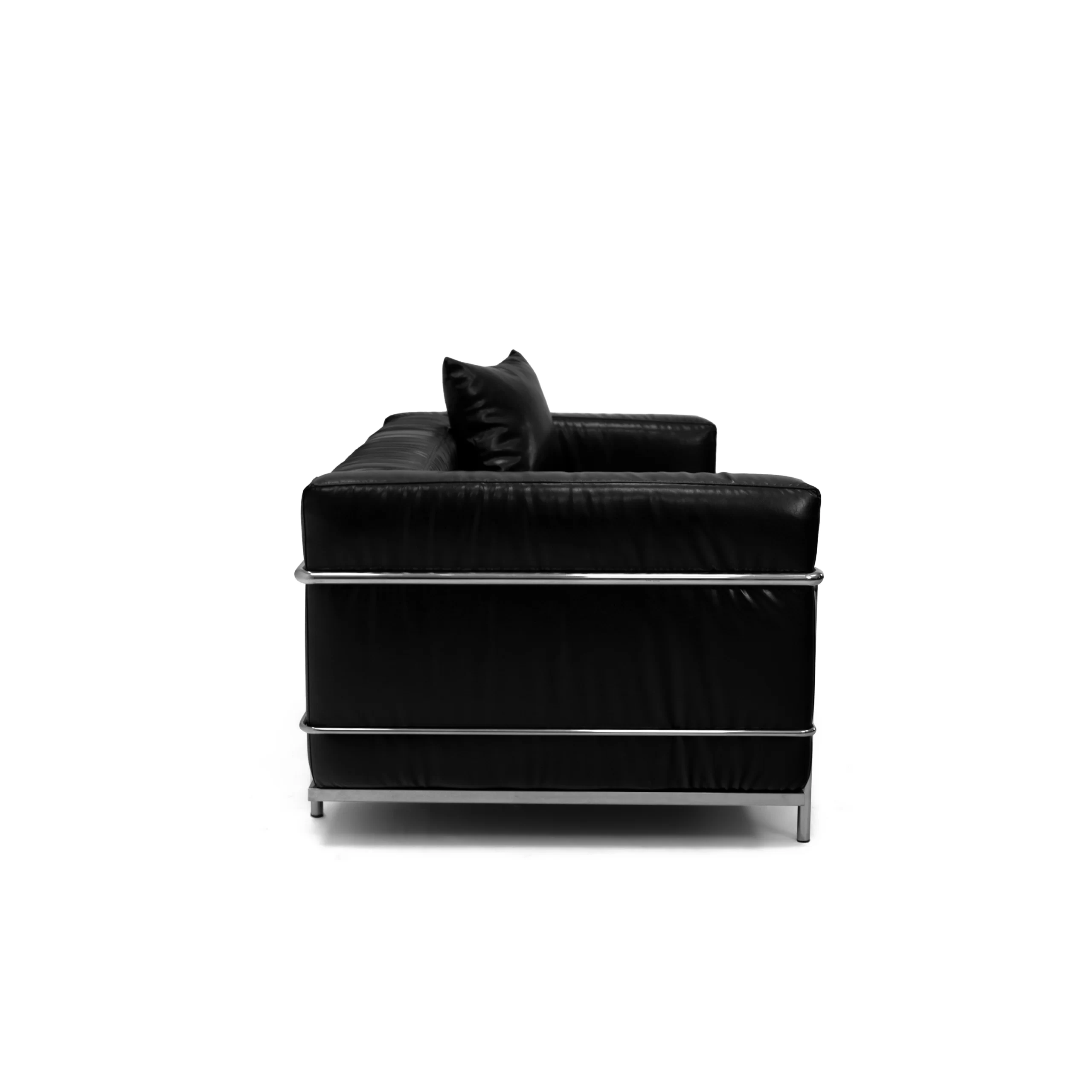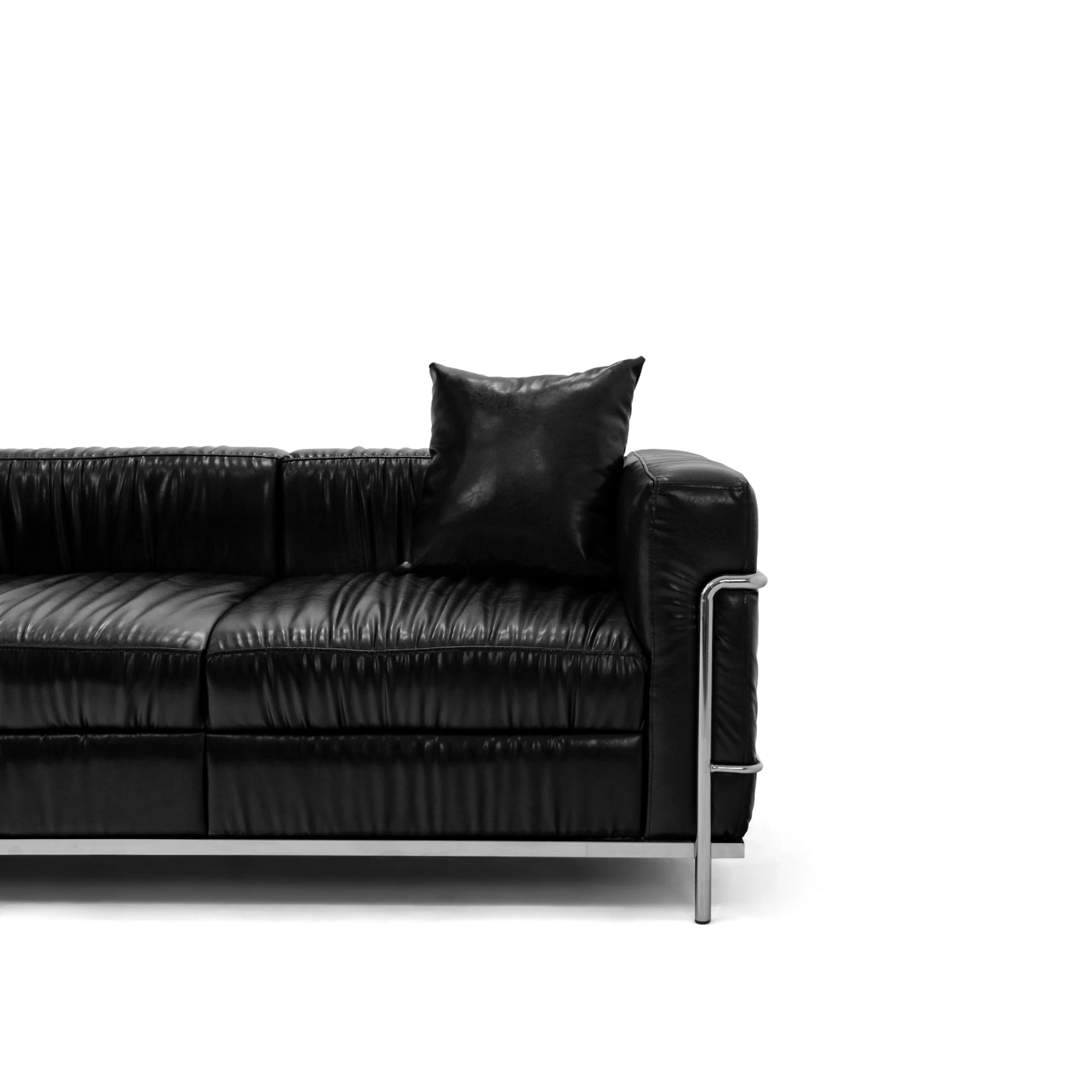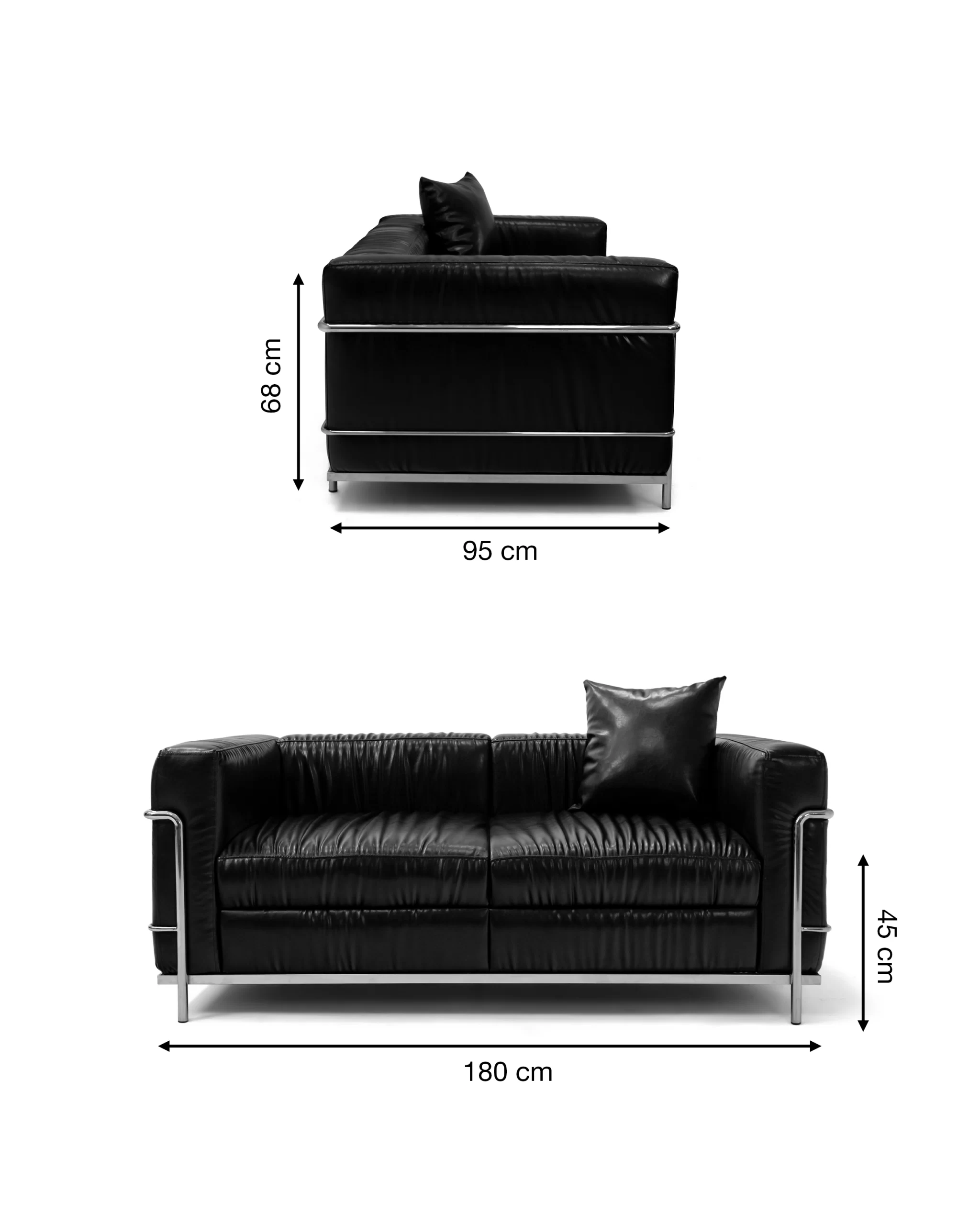 GRAND CONFORT là “dấu chấm câu” gọn ghẽ cho phòng khách kỷ luật: khối đệm da đen bóng tạo chiều sâu ánh nhìn, ôm quanh bởi khung thép mạ chrome sáng lạnh. Tỷ lệ tay–tựa ngang nhau tạo đường chân trời rõ ràng; phần ngồi êm chắc, giữ dáng tốt cho những cuộc trò chuyện dài.