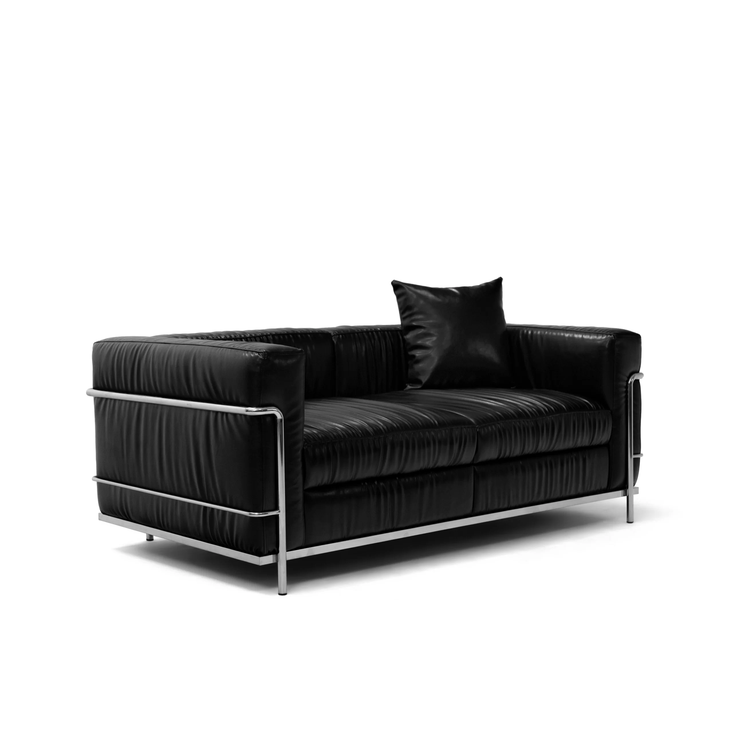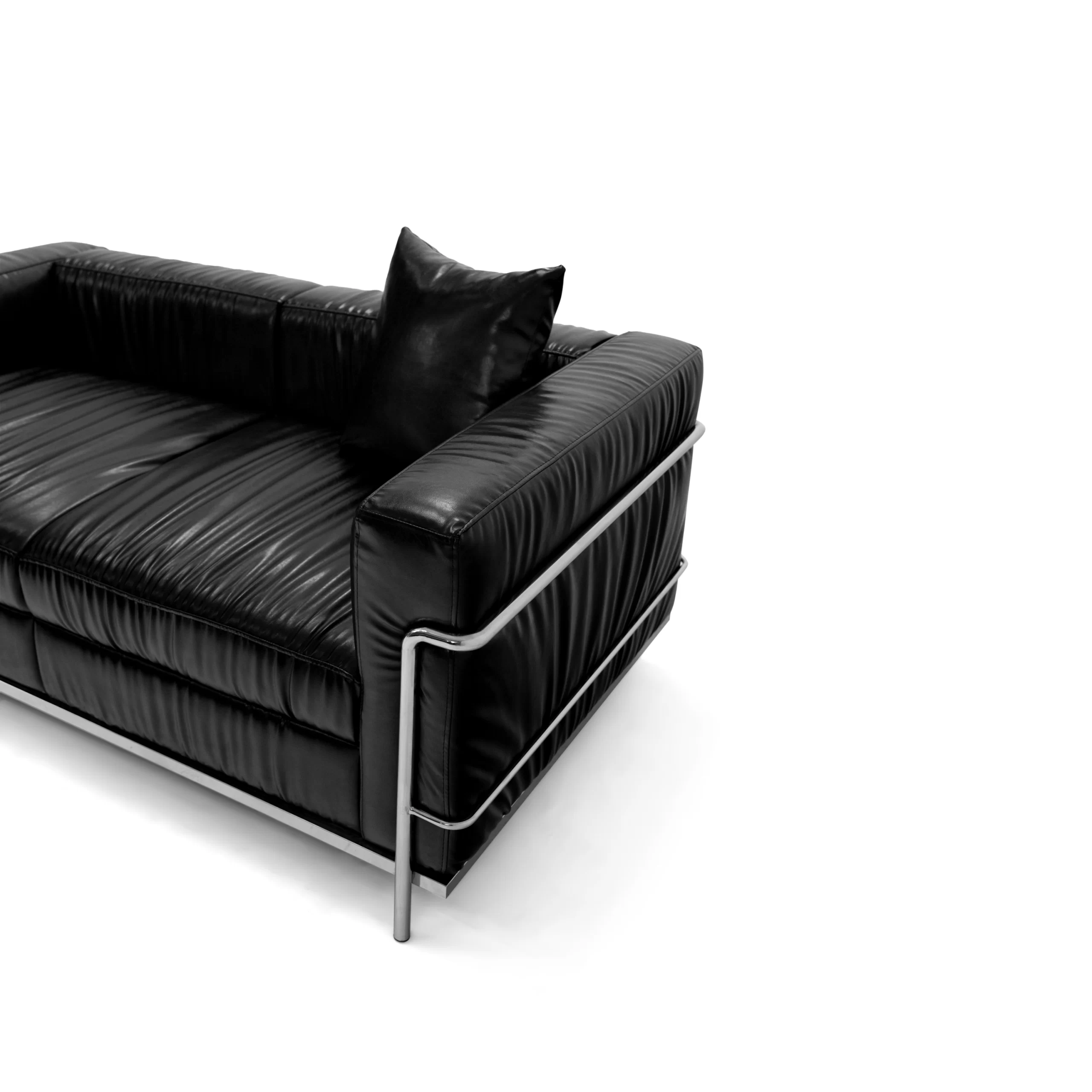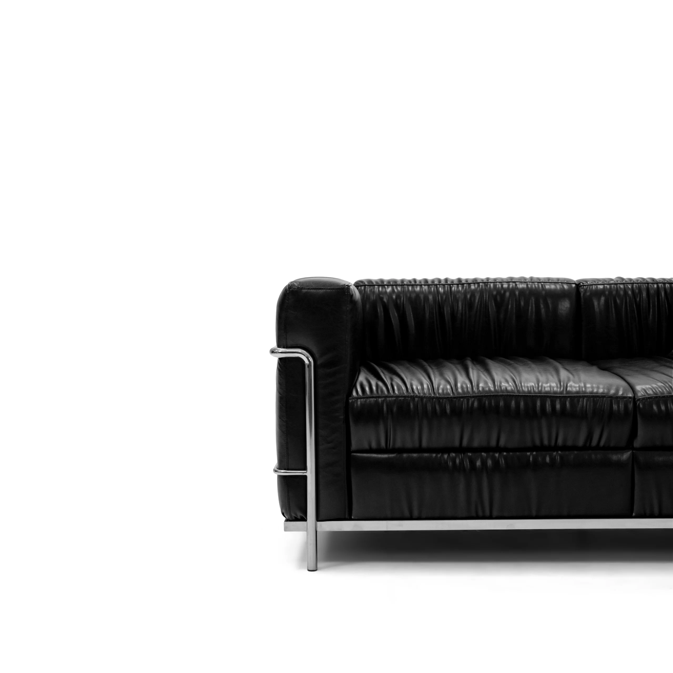 GRAND CONFORT là “dấu chấm câu” gọn ghẽ cho phòng khách kỷ luật: khối đệm da đen bóng tạo chiều sâu ánh nhìn, ôm quanh bởi khung thép mạ chrome sáng lạnh. Tỷ lệ tay–tựa ngang nhau tạo đường chân trời rõ ràng; phần ngồi êm chắc, giữ dáng tốt cho những cuộc trò chuyện dài.
