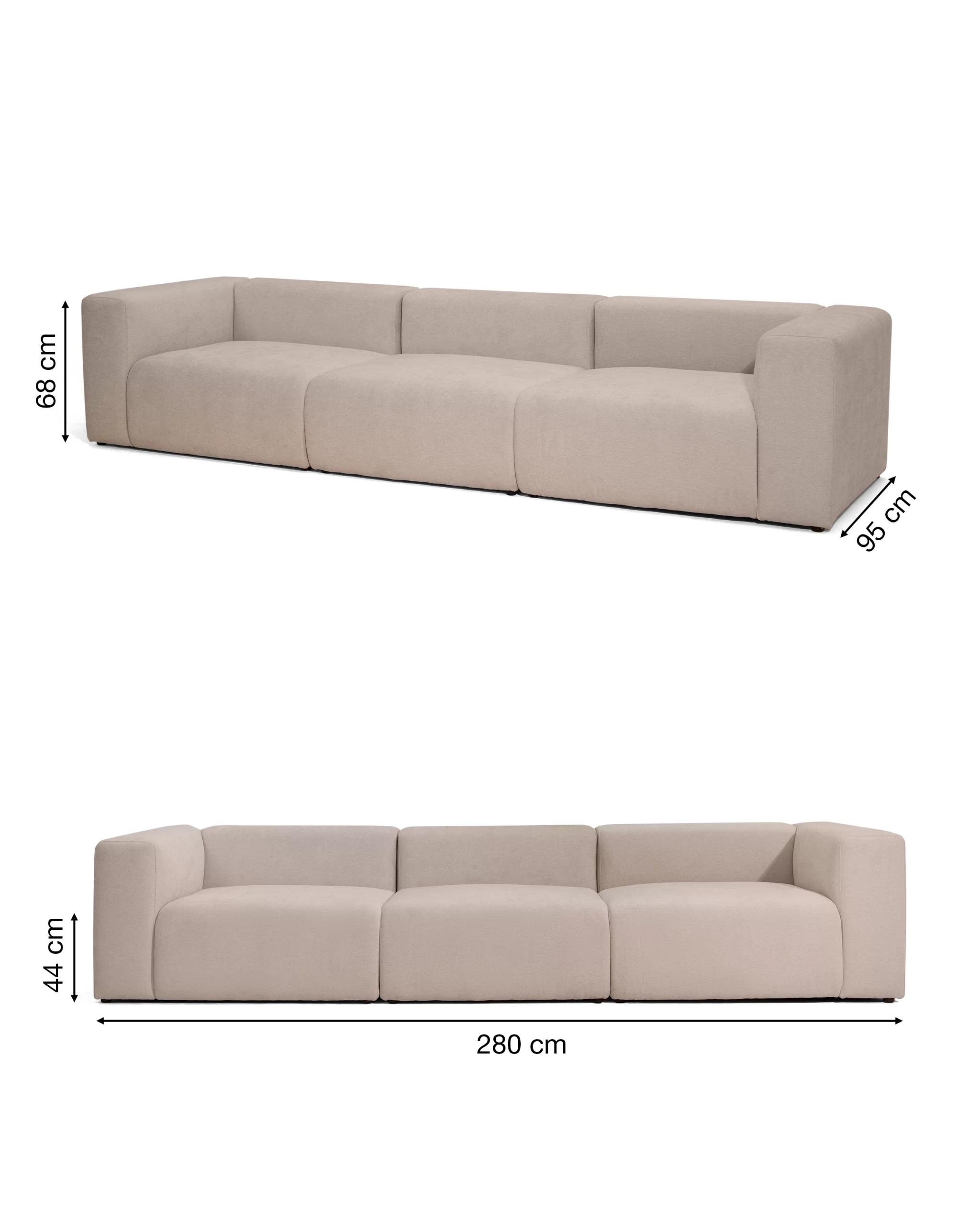 Sofa module LENA được thiết kế với form khối mềm, chiều cao lưng thấp, tay – lưng liền, bo tròn các cạnh, tạo cảm giác khối mây êm và nhẹ mắt. Cấu trúc module (từng khối ghép với nhau) cho phép linh hoạt thay đổi bố cục theo mặt bằng: ghép thẳng 3 chỗ, kết hợp thêm đôn/ghế đơn để tạo layout chữ L hoặc góc lounge dài. Chiều dài khoảng 280cm, chiều sâu ~95cm, cao ~68cm, mặt ngồi cao khoảng 44cm – tỷ lệ dễ sử dụng hàng ngày nhưng vẫn đủ “ngồi sâu” để thư giãn. Lớp vải dệt hiệu ứng màu be ghi nhạt có bề mặt hơi gợn (hiệu ứng dệt: texture nhẹ), vừa che khuyết điểm tốt, vừa giữ cảm giác tinh tế, phù hợp với các không gian minimal nhưng vẫn cần sự ấm áp.