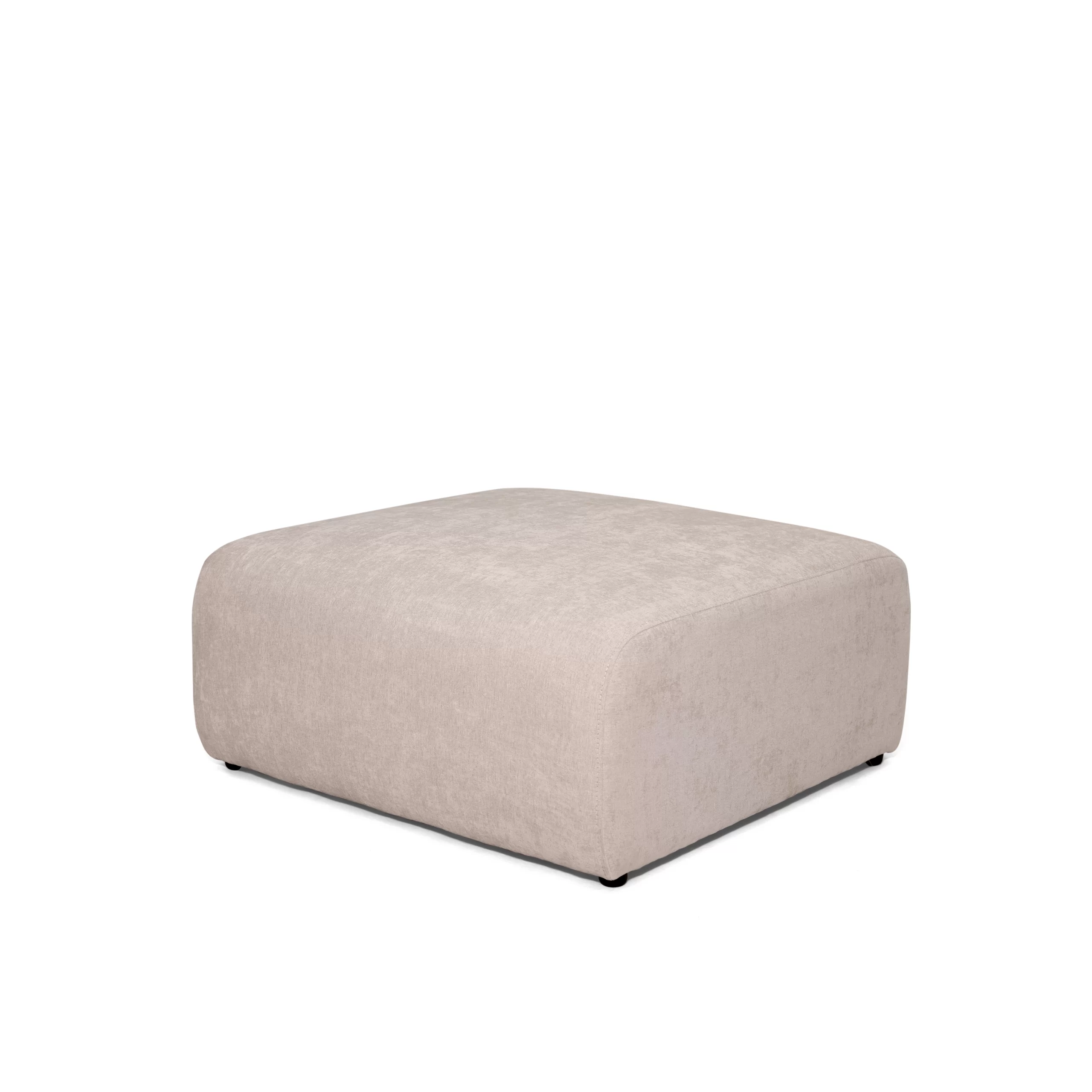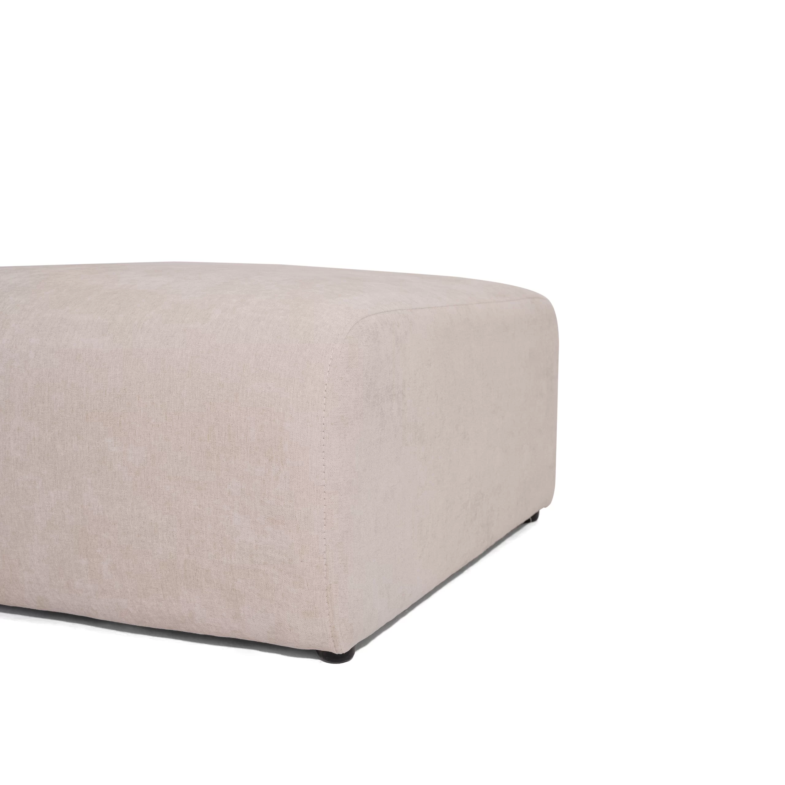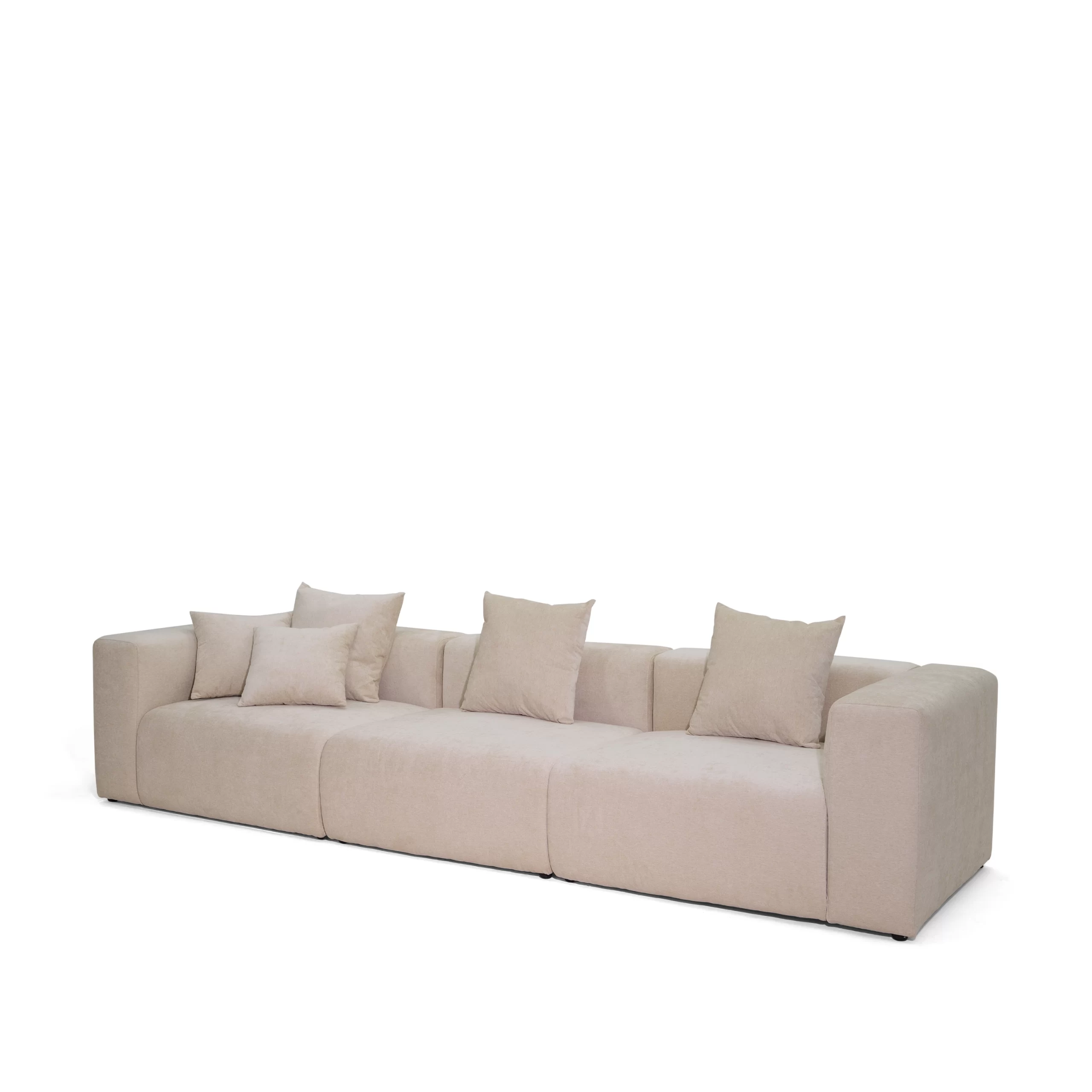 Sofa module LENA được thiết kế với form khối mềm, chiều cao lưng thấp, tay – lưng liền, bo tròn các cạnh, tạo cảm giác khối mây êm và nhẹ mắt. Cấu trúc module (từng khối ghép với nhau) cho phép linh hoạt thay đổi bố cục theo mặt bằng: ghép thẳng 3 chỗ, kết hợp thêm đôn/ghế đơn để tạo layout chữ L hoặc góc lounge dài. Chiều dài khoảng 280cm, chiều sâu ~95cm, cao ~68cm, mặt ngồi cao khoảng 44cm – tỷ lệ dễ sử dụng hàng ngày nhưng vẫn đủ “ngồi sâu” để thư giãn. Lớp vải dệt hiệu ứng màu be ghi nhạt có bề mặt hơi gợn (hiệu ứng dệt: texture nhẹ), vừa che khuyết điểm tốt, vừa giữ cảm giác tinh tế, phù hợp với các không gian minimal nhưng vẫn cần sự ấm áp.