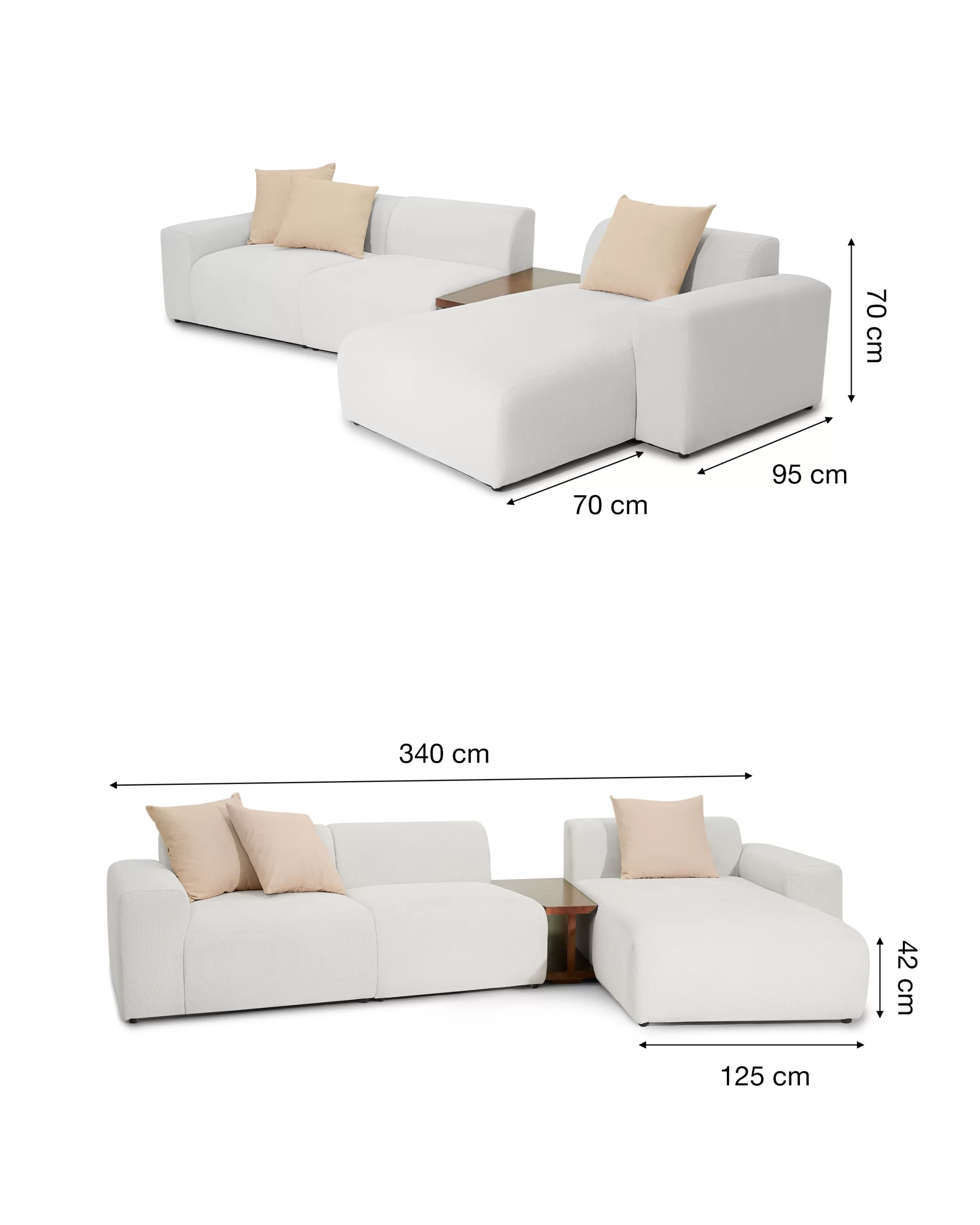 Form thấp bo tròn, vải dệt ghi sáng, module ghép cực dễ.