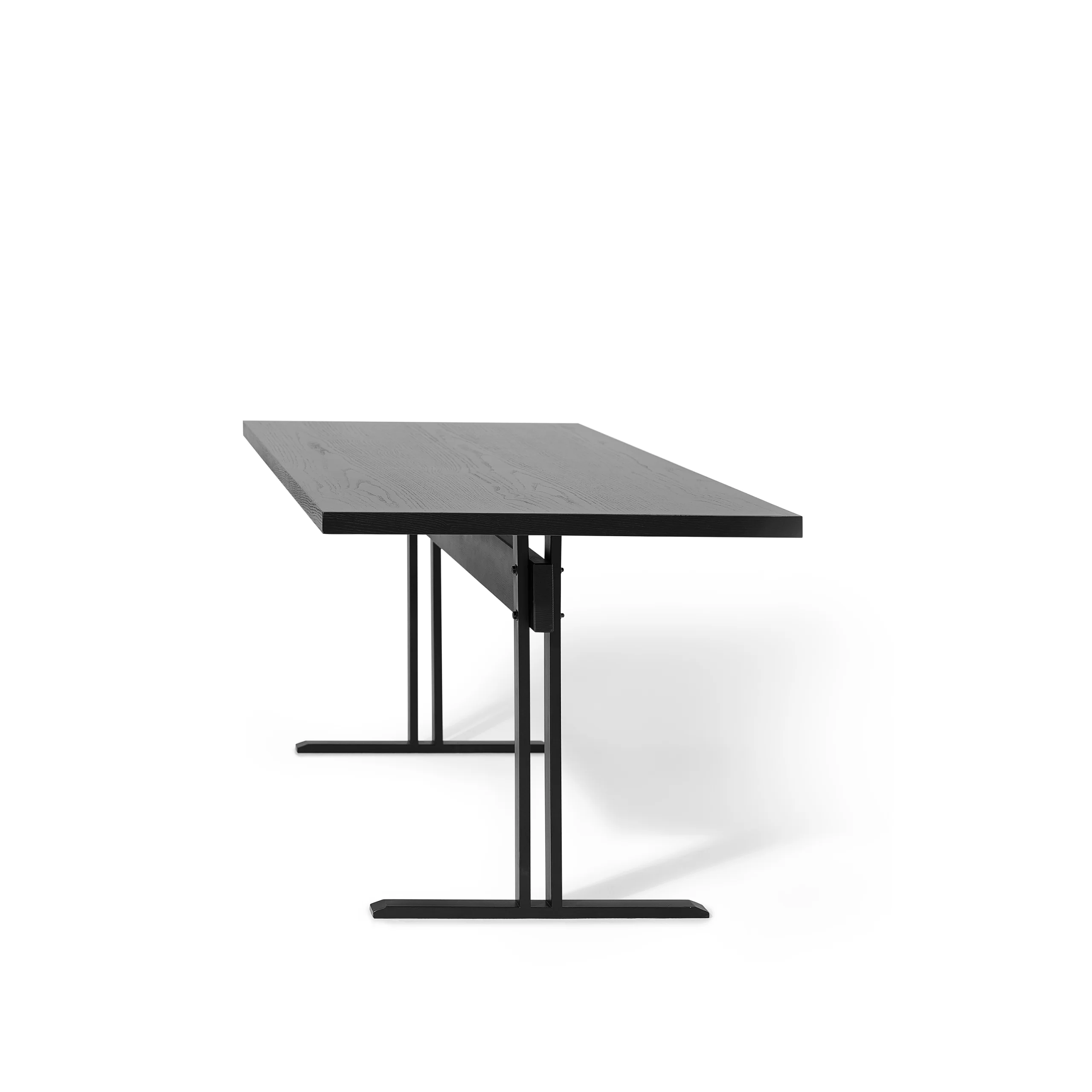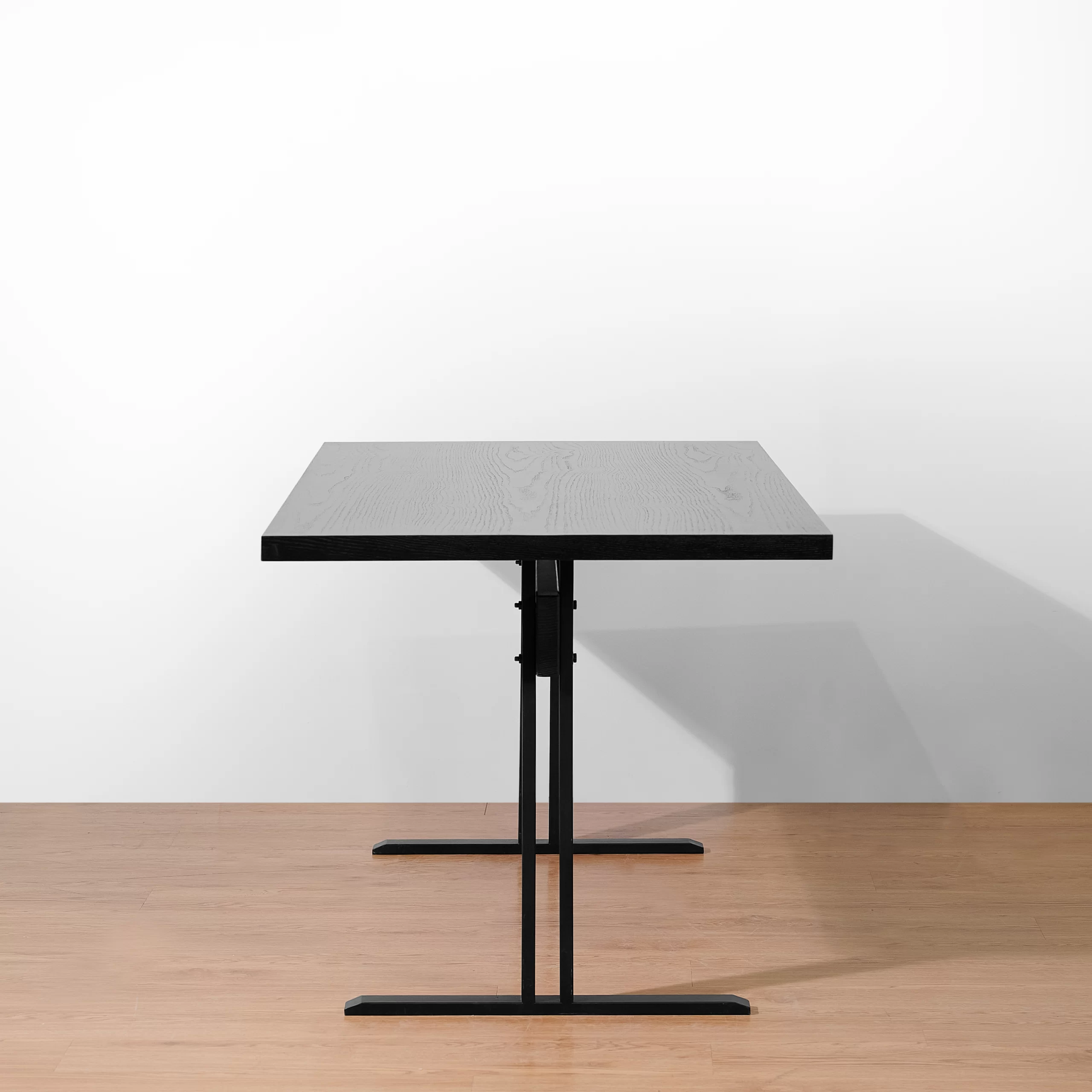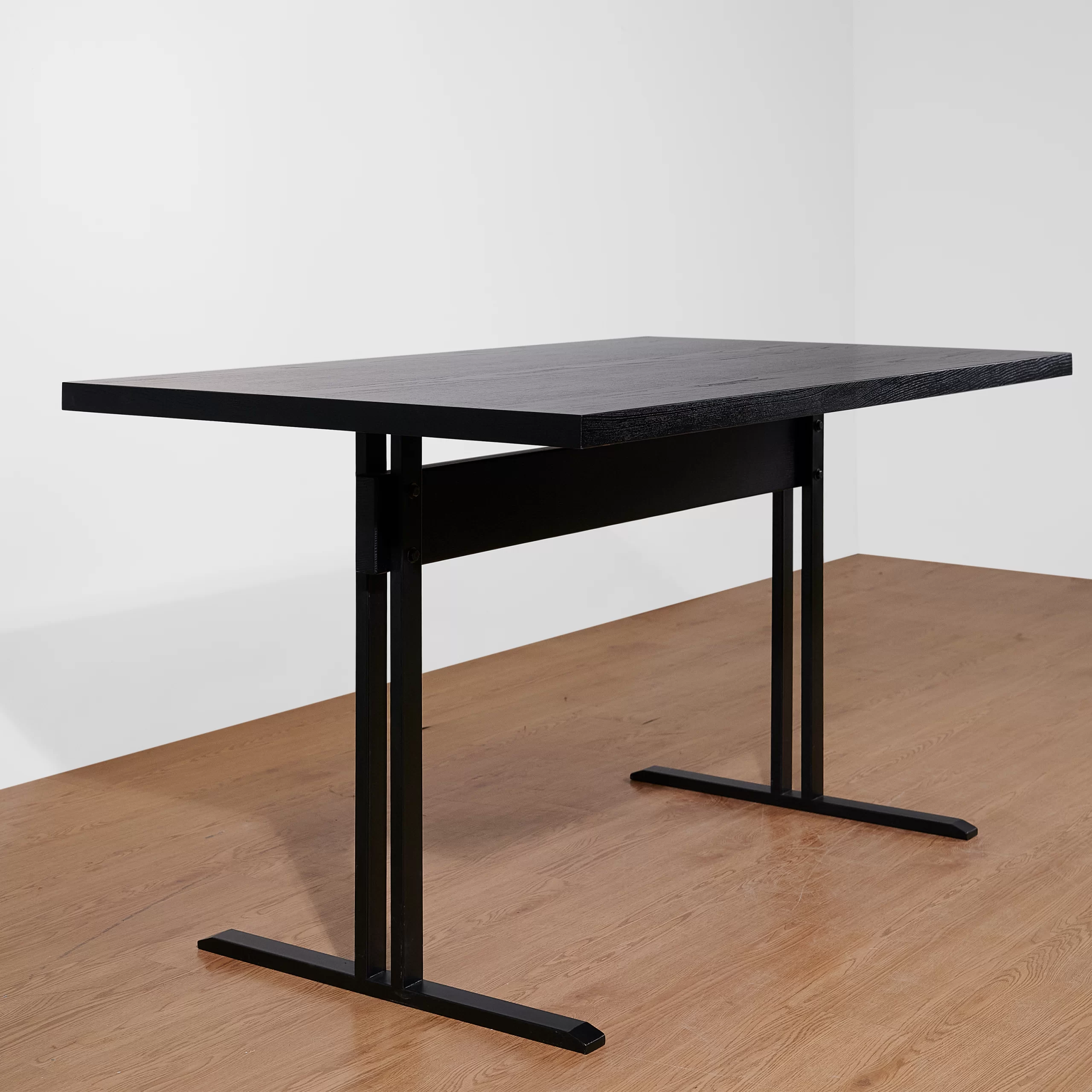 Bàn AXIS là mẫu bàn chữ nhật tối giản với mặt gỗ phẳng, mỏng vừa phải và hai chân thép dạng chữ T đặt lệch về hai đầu. Kết cấu này tạo nhiều khoảng trống cho chân, ngồi hai bên hay ngồi đầu bàn đều thoải mái, không bị “vướng” chân trụ giữa. Tỷ lệ mặt dài – chân mảnh cho cảm giác bàn nhẹ, hiện đại nhưng vẫn rất vững nhờ hệ chân thép và thanh giằng giữa. Tông đen đồng bộ giữa mặt gỗ và chân sắt giúp AXIS dễ phối trong nhiều không gian: bàn làm việc tại nhà, bàn họp nhỏ, bàn ăn 4–6 người hay bàn dài sát tường dùng như console/bàn trưng bày.