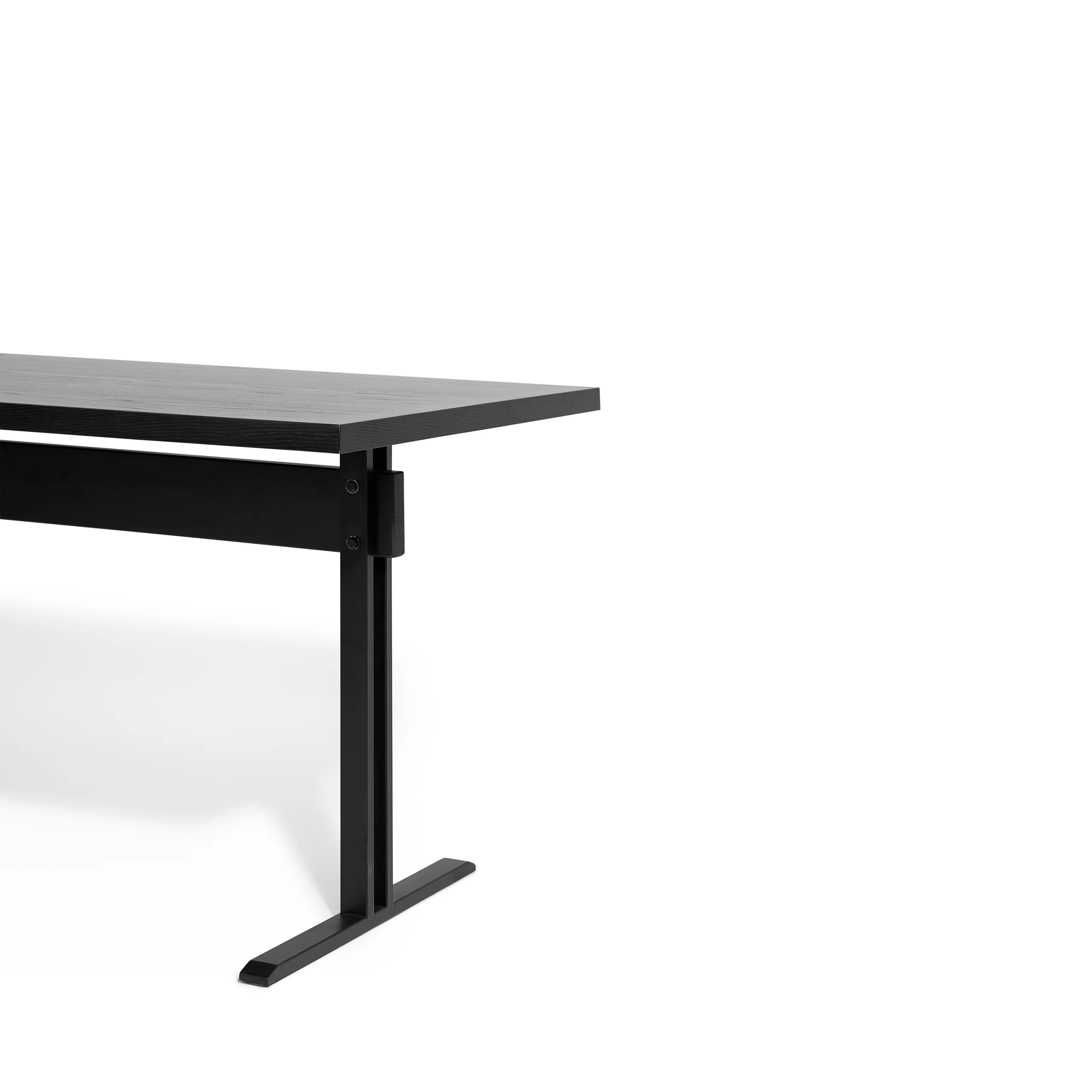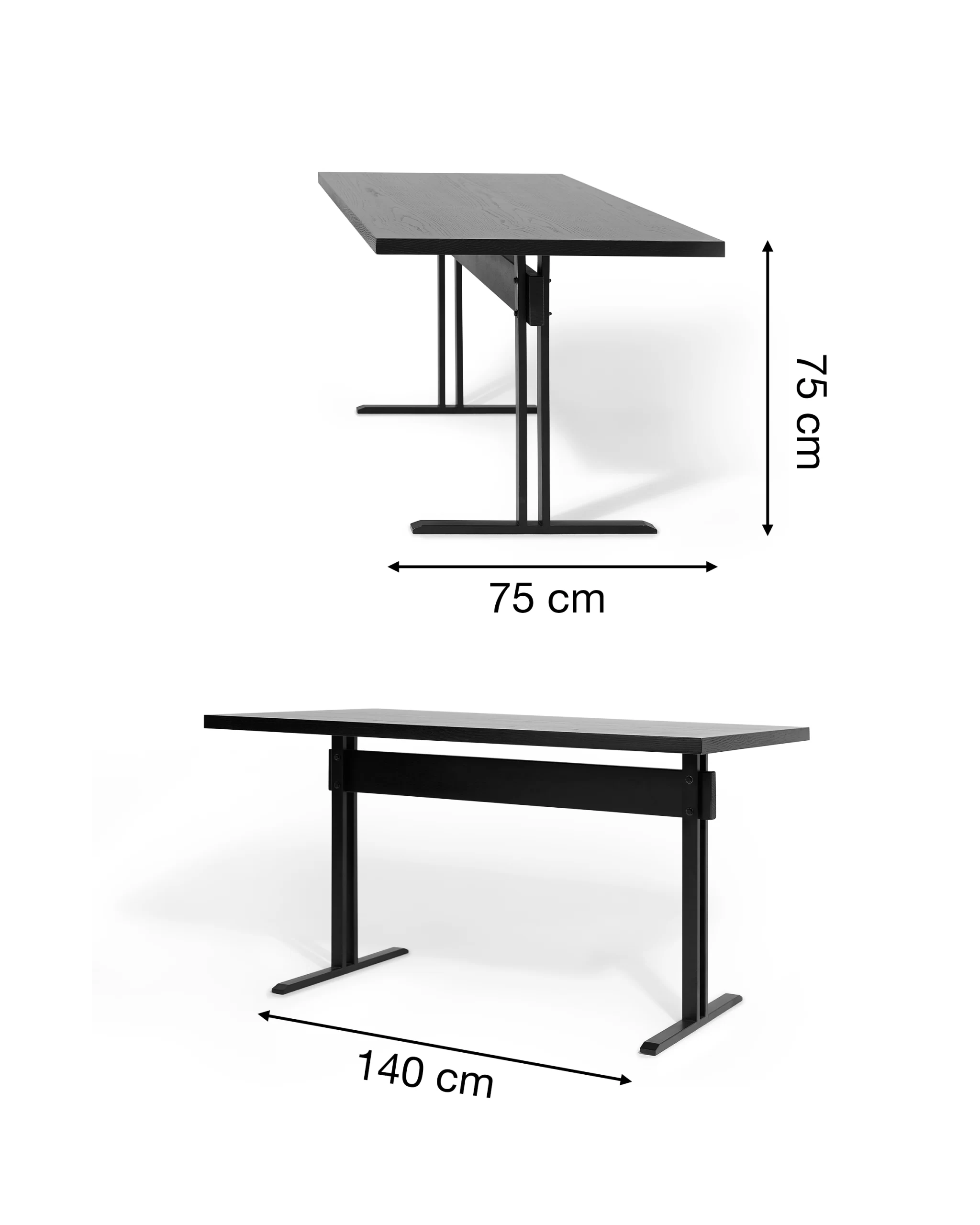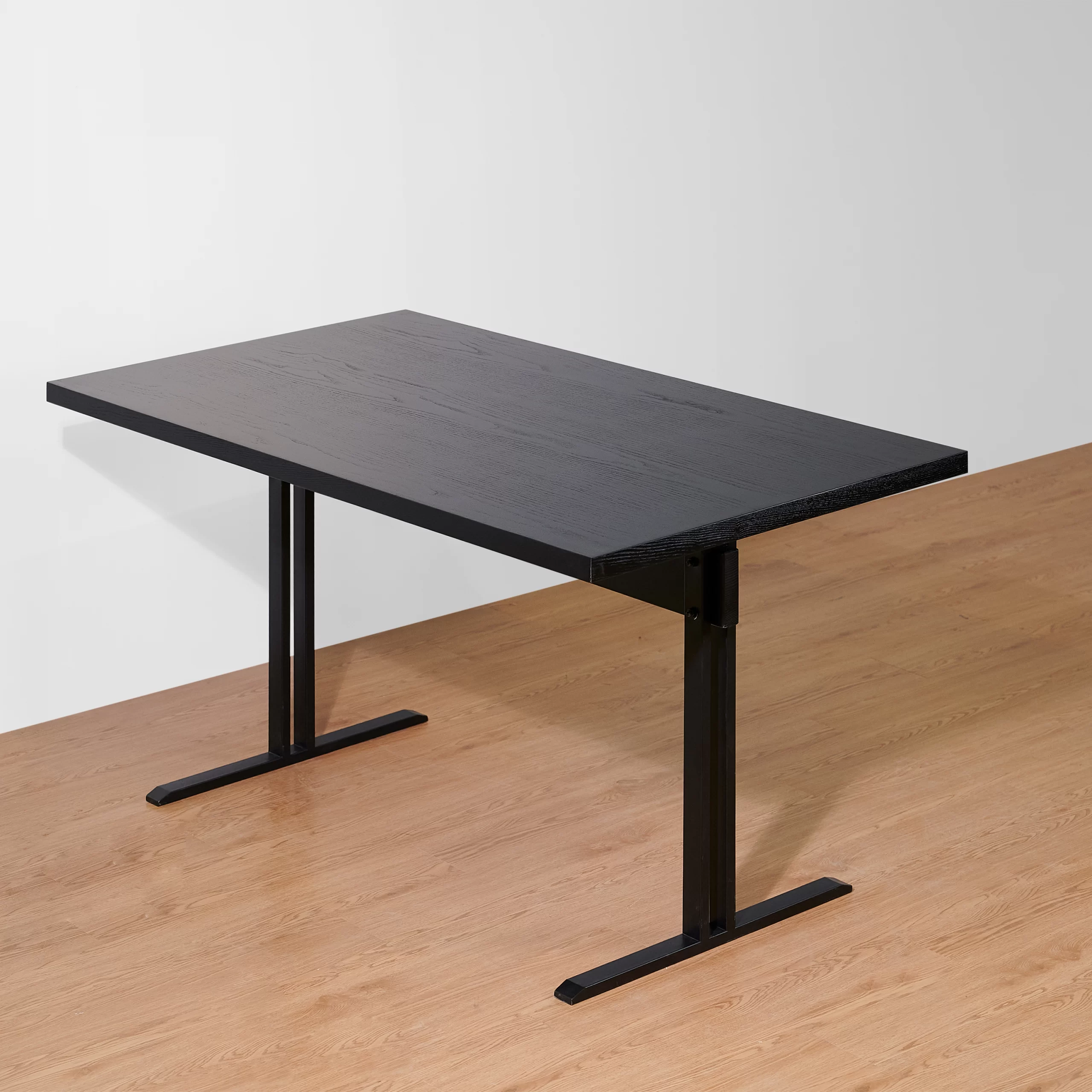 Bàn AXIS là mẫu bàn chữ nhật tối giản với mặt gỗ phẳng, mỏng vừa phải và hai chân thép dạng chữ T đặt lệch về hai đầu. Kết cấu này tạo nhiều khoảng trống cho chân, ngồi hai bên hay ngồi đầu bàn đều thoải mái, không bị “vướng” chân trụ giữa. Tỷ lệ mặt dài – chân mảnh cho cảm giác bàn nhẹ, hiện đại nhưng vẫn rất vững nhờ hệ chân thép và thanh giằng giữa. Tông đen đồng bộ giữa mặt gỗ và chân sắt giúp AXIS dễ phối trong nhiều không gian: bàn làm việc tại nhà, bàn họp nhỏ, bàn ăn 4–6 người hay bàn dài sát tường dùng như console/bàn trưng bày.