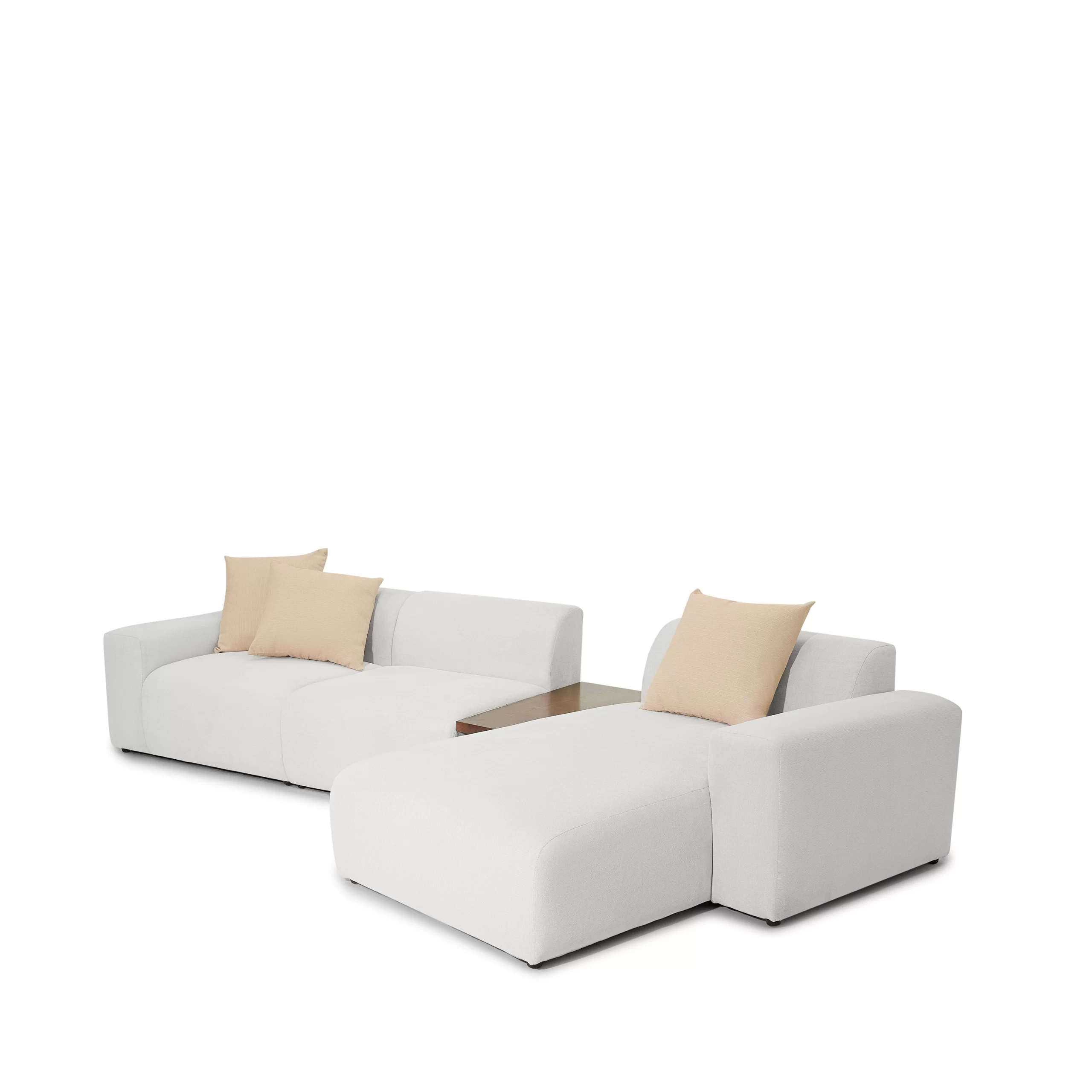 Form thấp bo tròn, vải dệt ghi sáng, module ghép cực dễ.