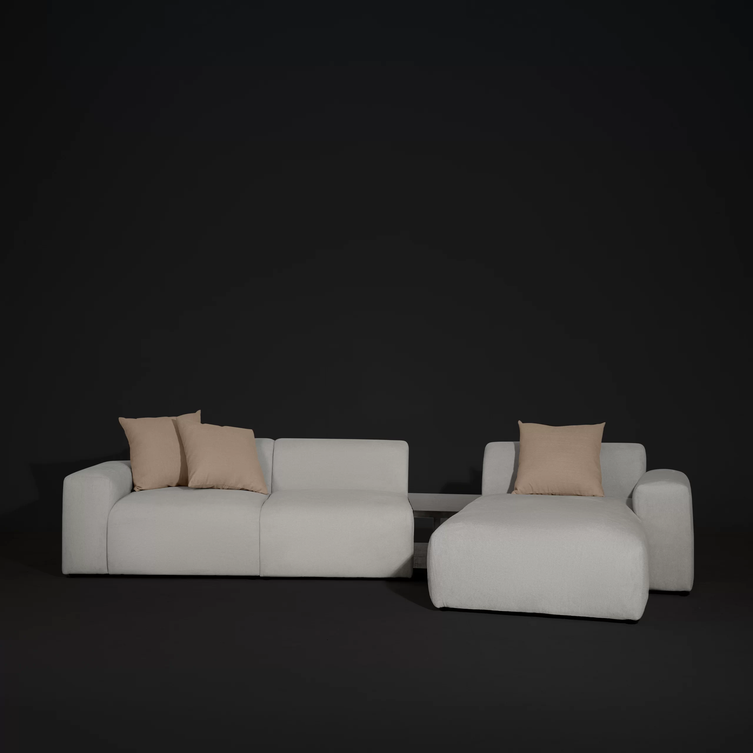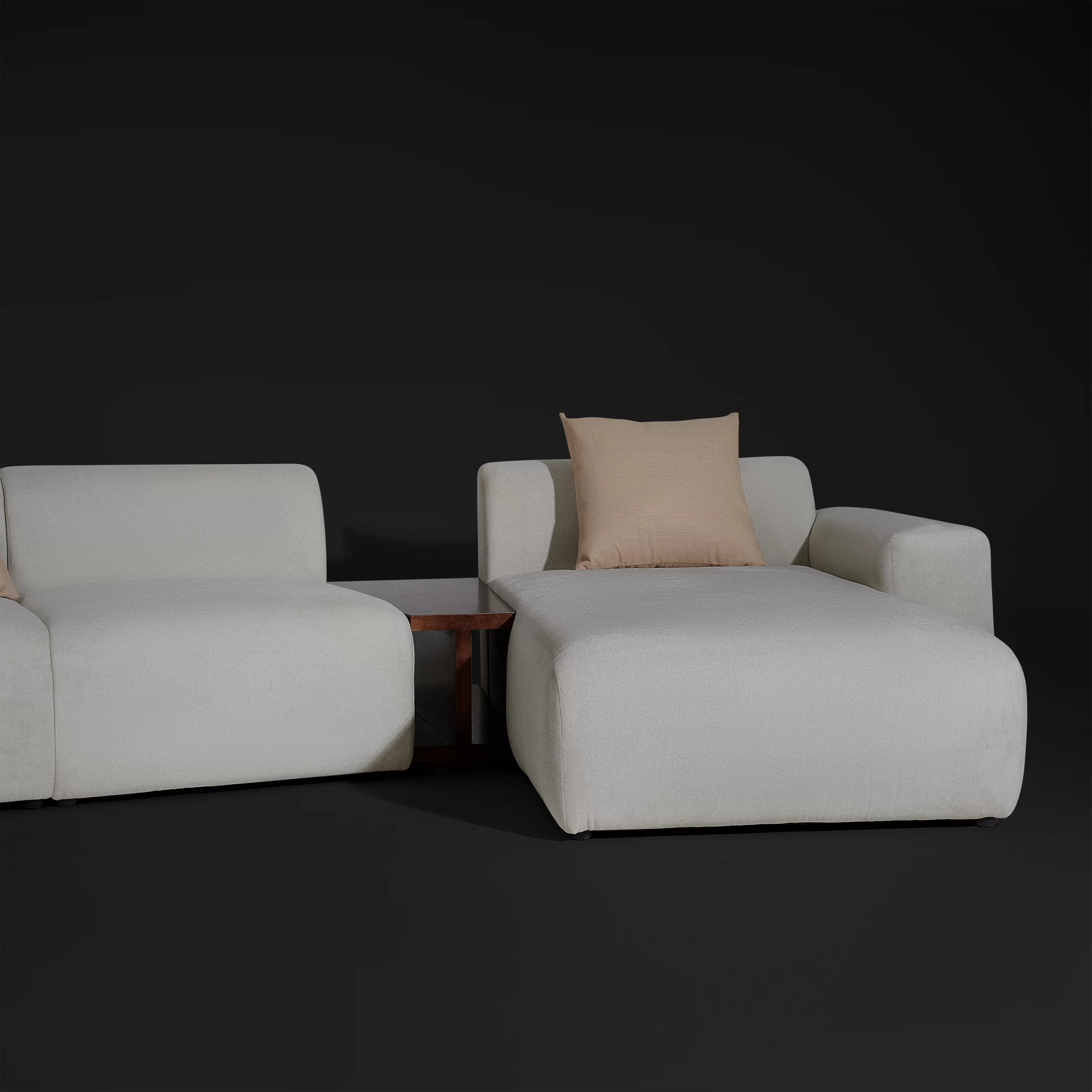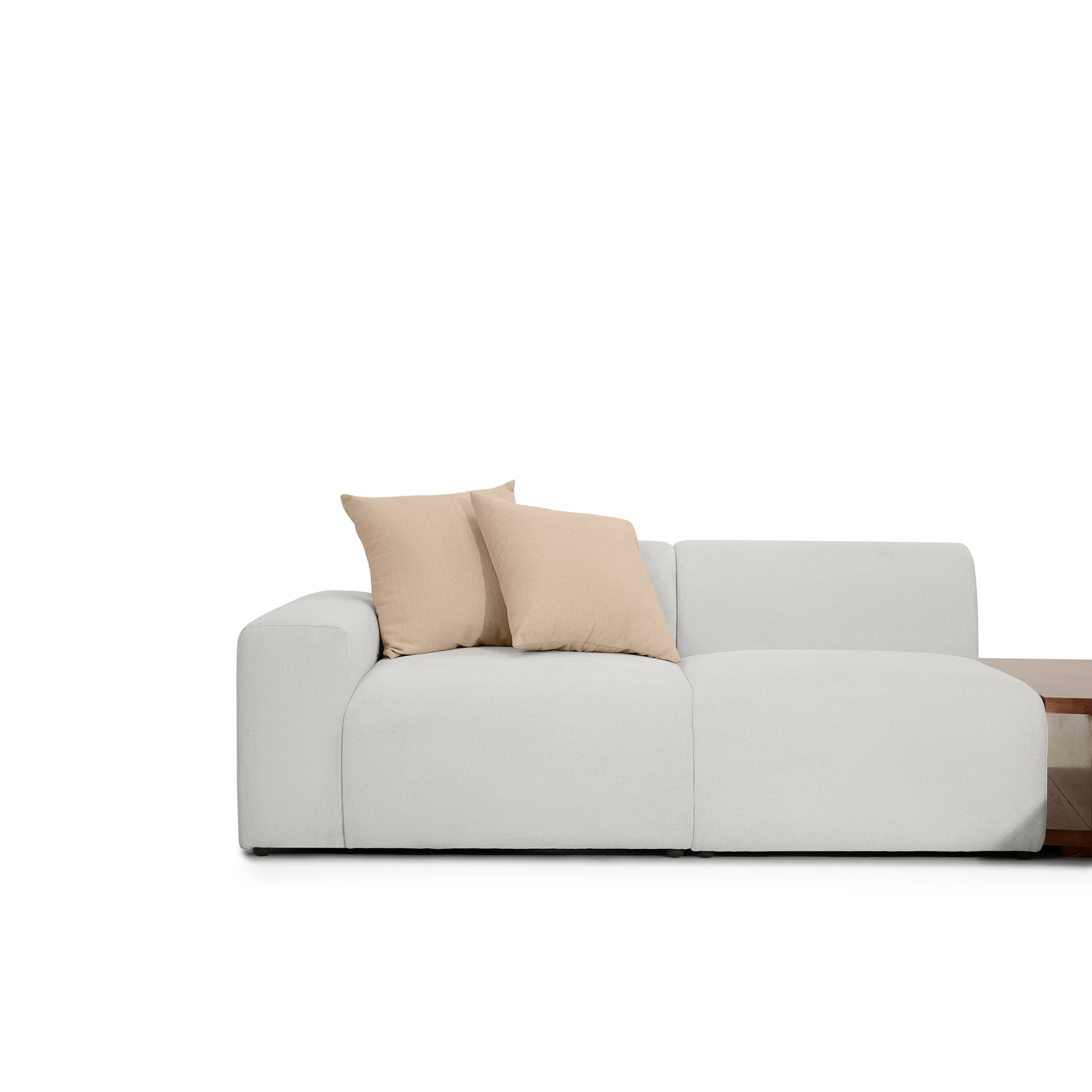 Sofa module PONTE bọc vải dệt màu ghi sáng được thiết kế theo dạng module (từng khối rời có thể ghép linh hoạt): ghế đơn, ghế đôi, ottoman, có thể kết hợp với bàn cạnh để tạo thành nhiều layout khác nhau – từ sofa thẳng, chữ L cho đến bộ lounge rộng rãi. Form sofa thấp, ngồi sâu, tay và lưng bo tròn mềm, tạo cảm giác “khối mây” vững nhưng rất dễ gần. Vải ghi sáng, bề mặt có texture dệt nhẹ, giúp sofa trông dày dặn mà vẫn tinh giản, phù hợp với không gian phòng khách tối giản, căn hộ trẻ, homestay hoặc khu lounge trong văn phòng sáng tạo.