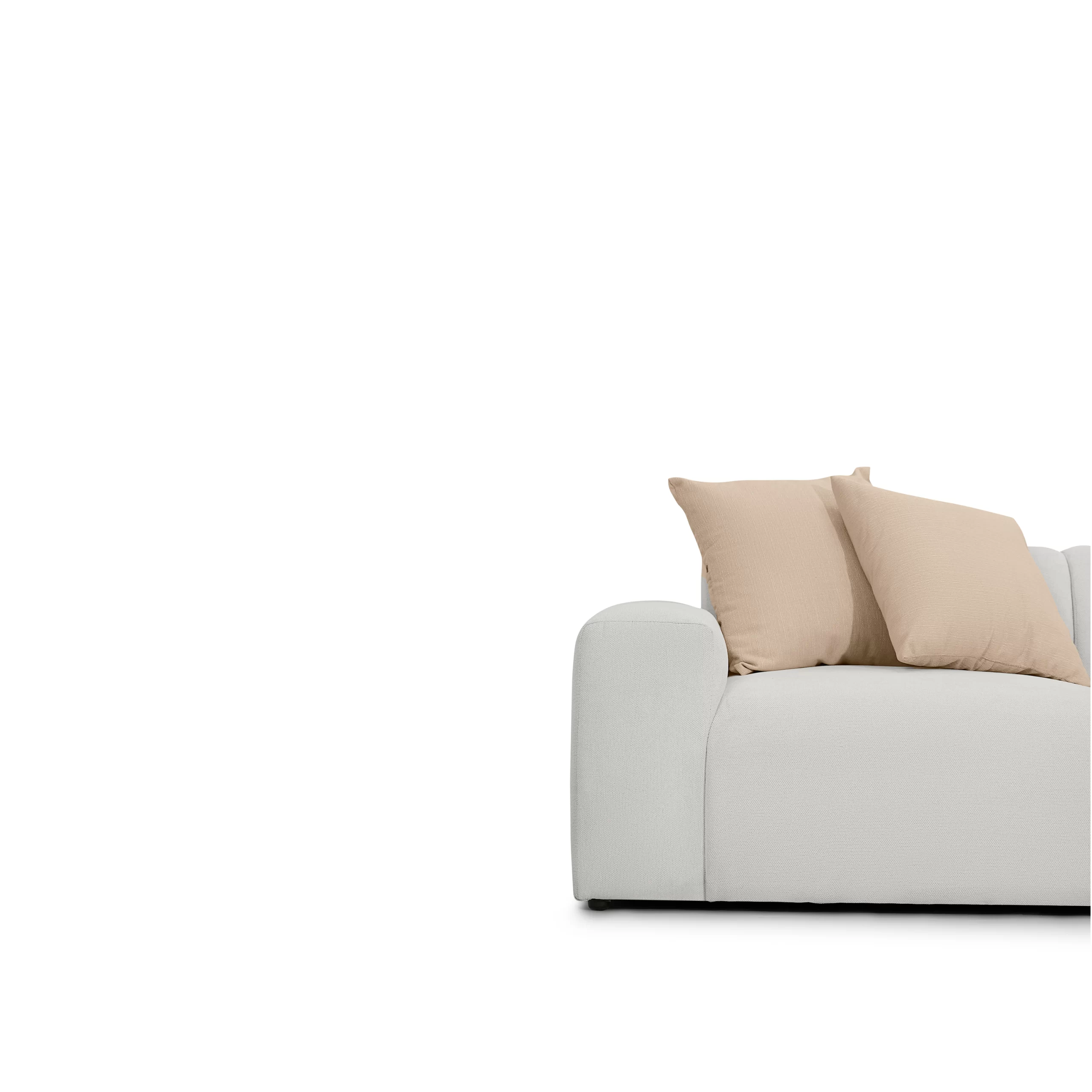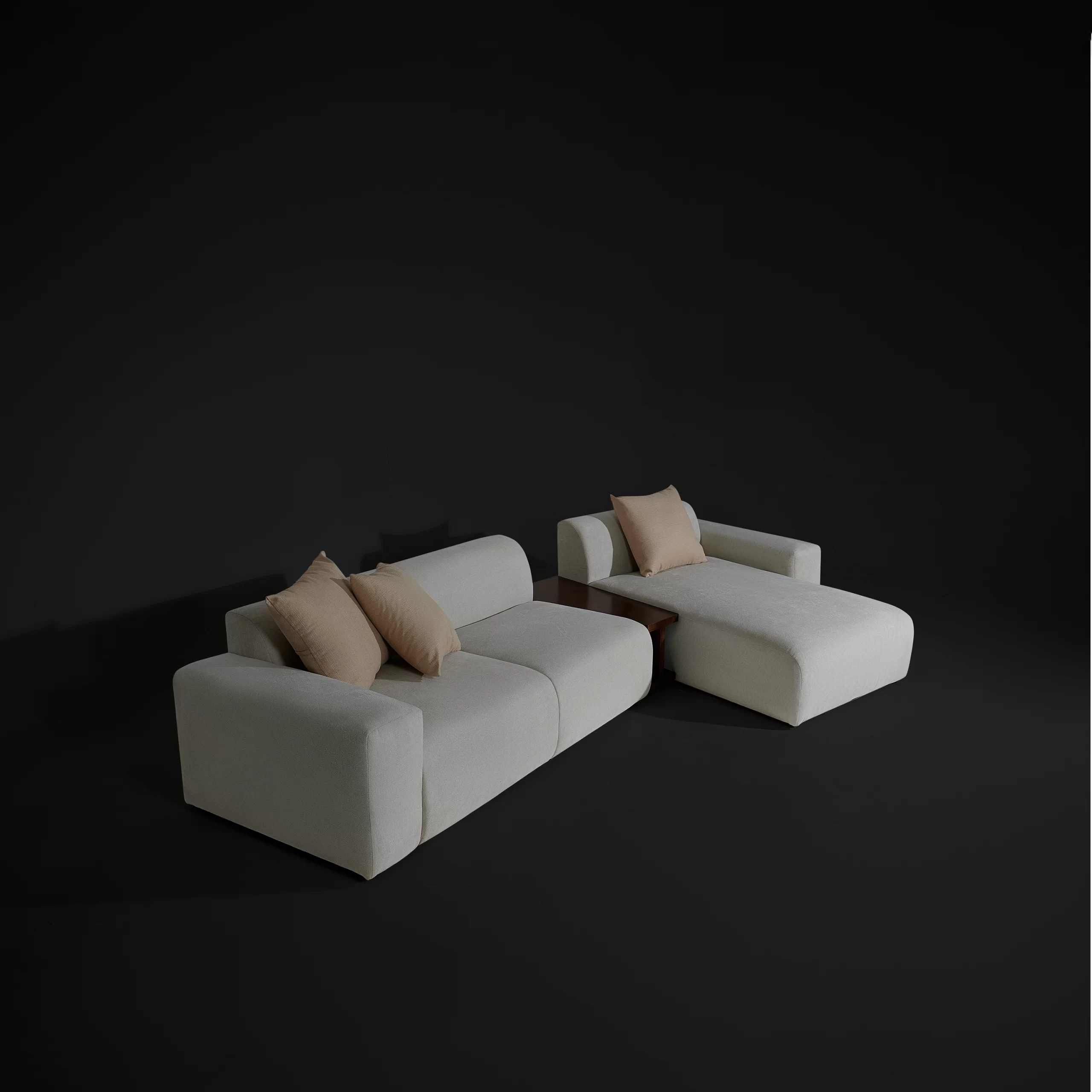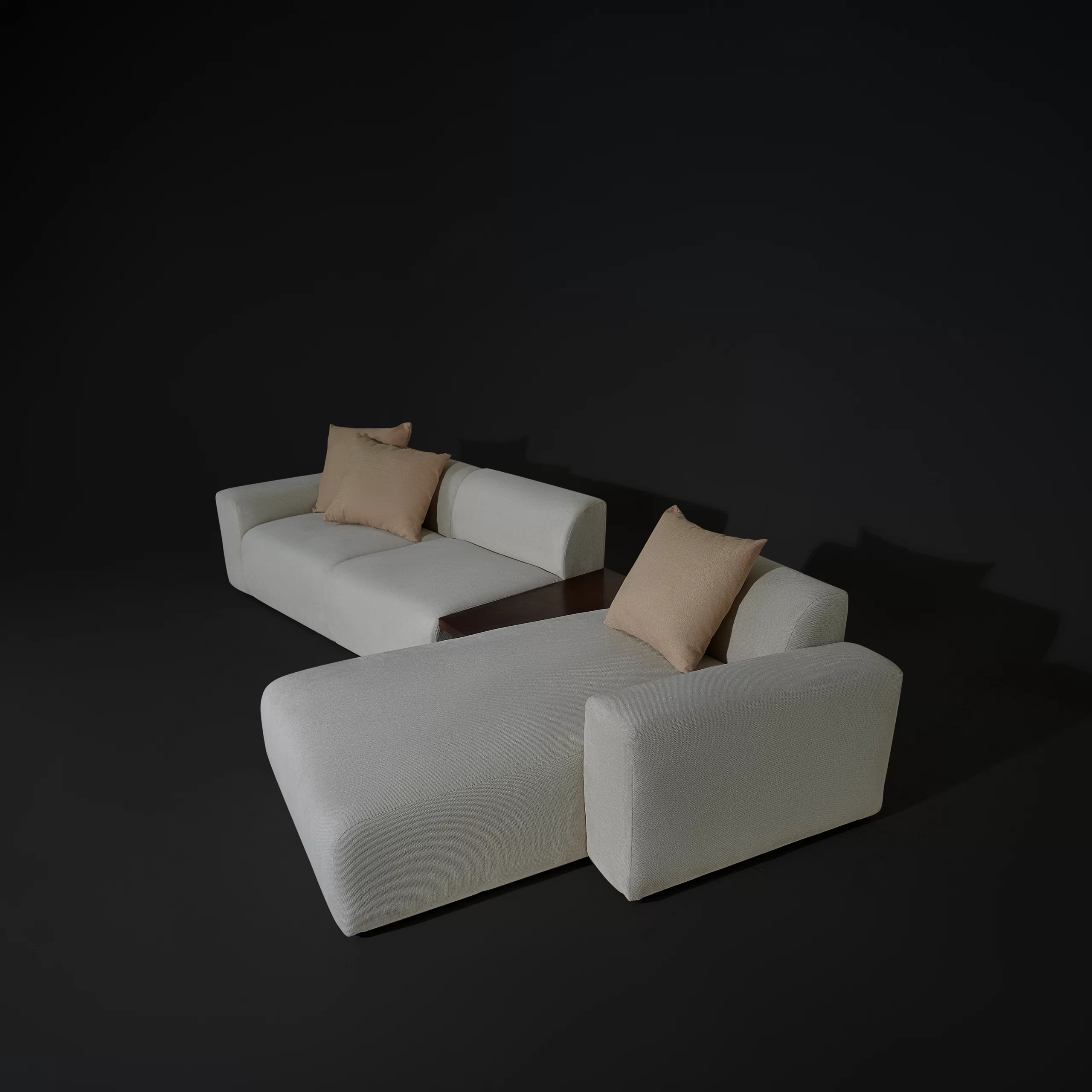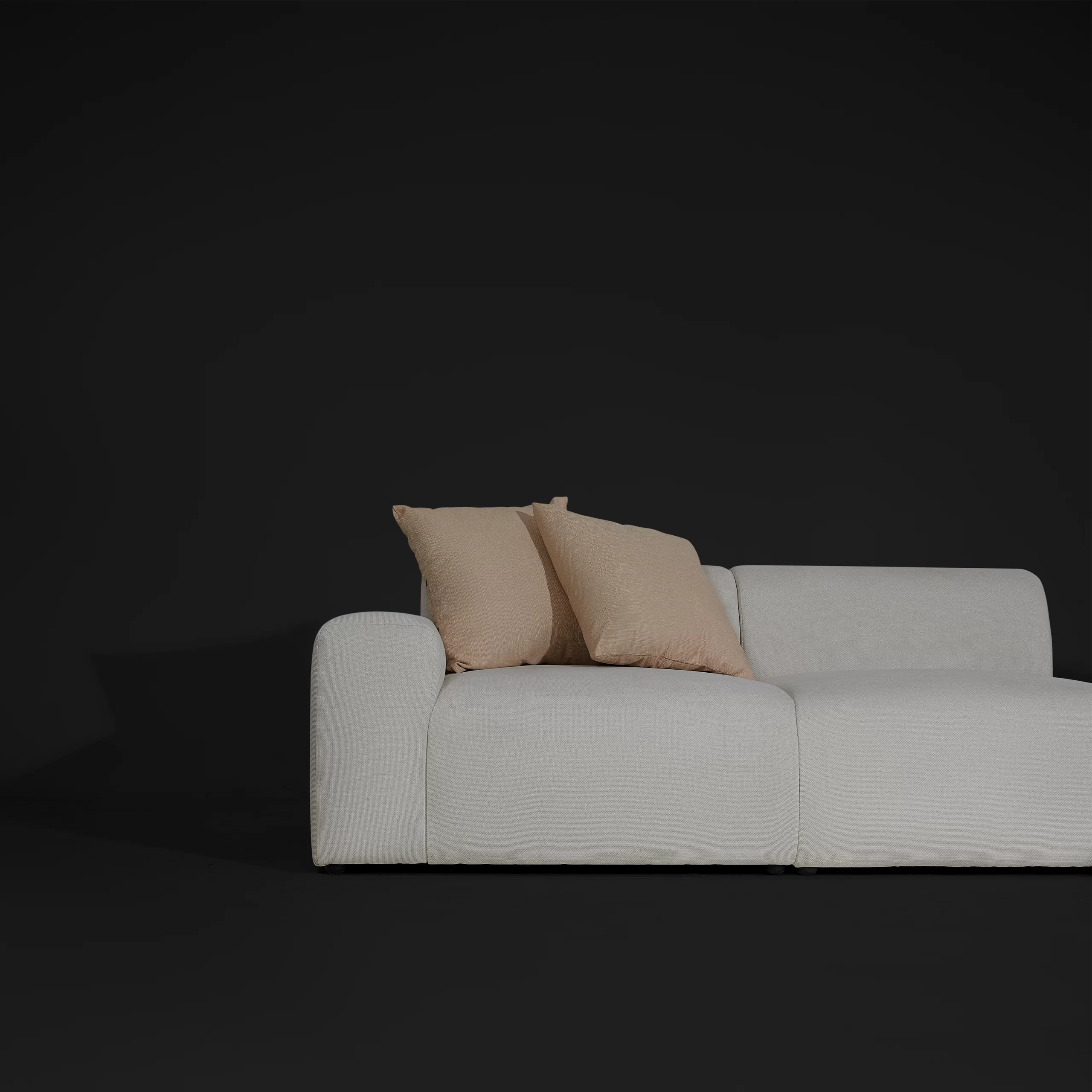 Sofa module PONTE bọc vải dệt màu ghi sáng được thiết kế theo dạng module (từng khối rời có thể ghép linh hoạt): ghế đơn, ghế đôi, ottoman, có thể kết hợp với bàn cạnh để tạo thành nhiều layout khác nhau – từ sofa thẳng, chữ L cho đến bộ lounge rộng rãi. Form sofa thấp, ngồi sâu, tay và lưng bo tròn mềm, tạo cảm giác “khối mây” vững nhưng rất dễ gần. Vải ghi sáng, bề mặt có texture dệt nhẹ, giúp sofa trông dày dặn mà vẫn tinh giản, phù hợp với không gian phòng khách tối giản, căn hộ trẻ, homestay hoặc khu lounge trong văn phòng sáng tạo.