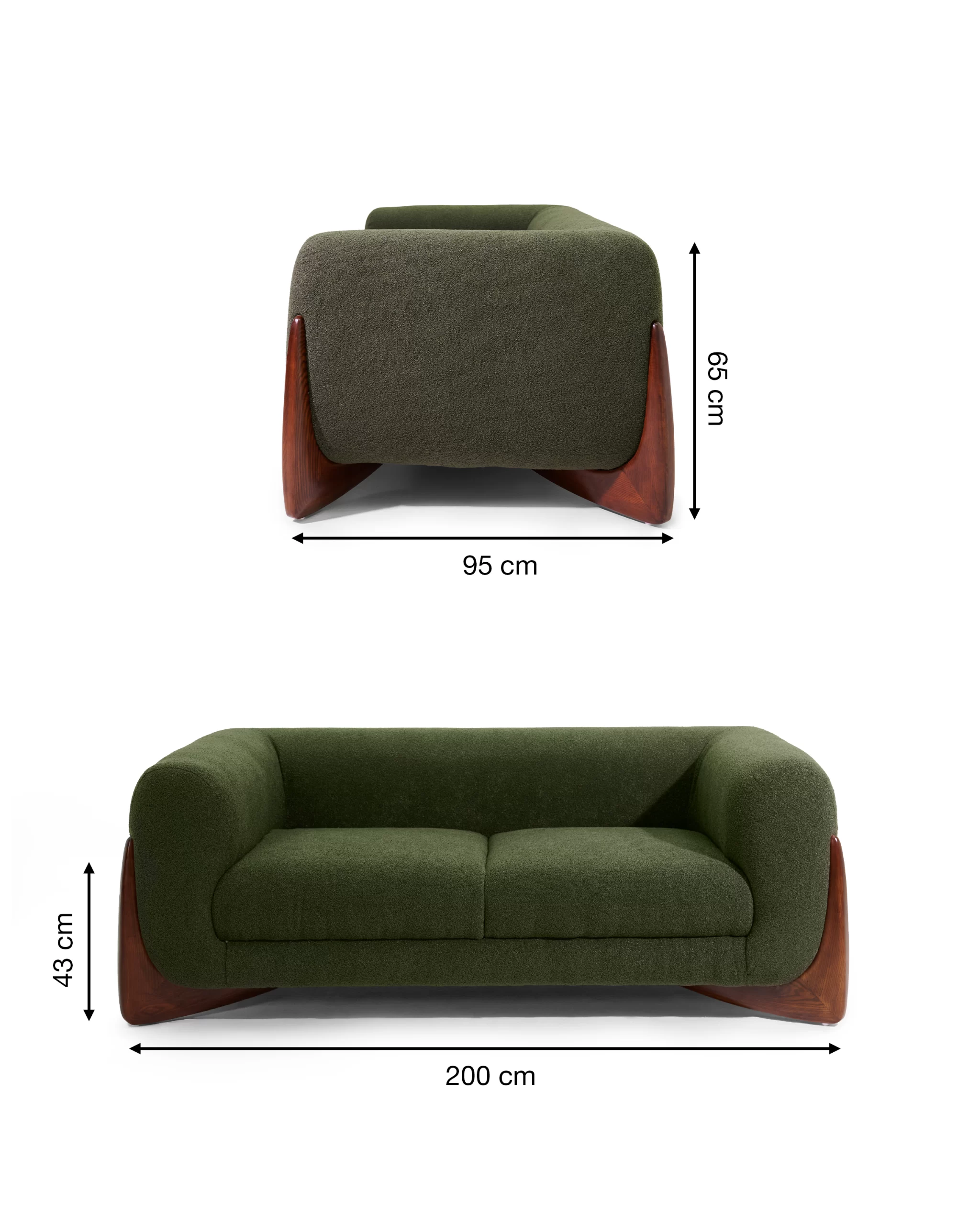 - Vải bọc: vải Bouclé dệt vòng nhỏ, bề mặt có “hạt” nhẹ, sờ ấm tay, độ bền màu và độ bền sợi tốt, phù hợp cho sofa sử dụng hàng ngày. Tông xanh rêu giúp che vết bẩn nhẹ tốt hơn so với màu sáng hoàn toàn.