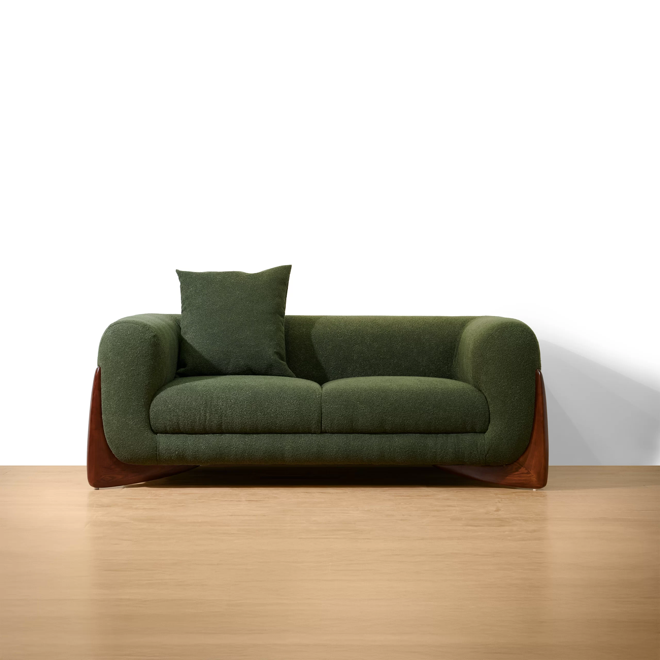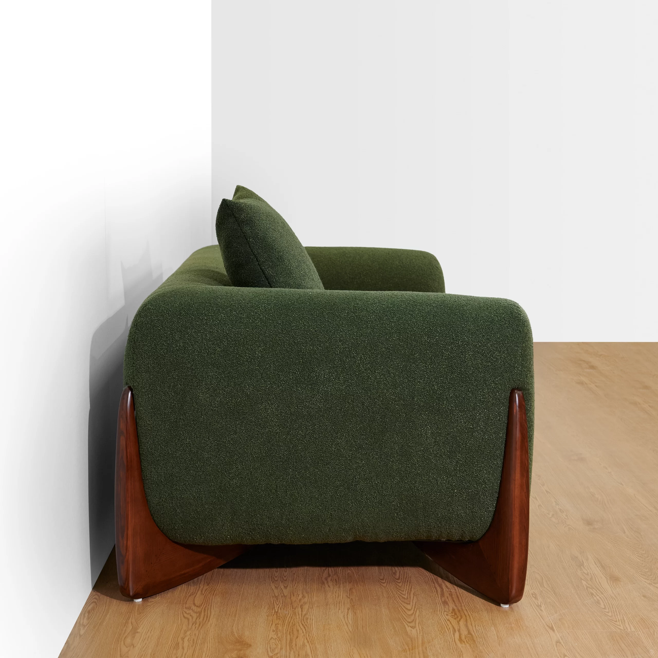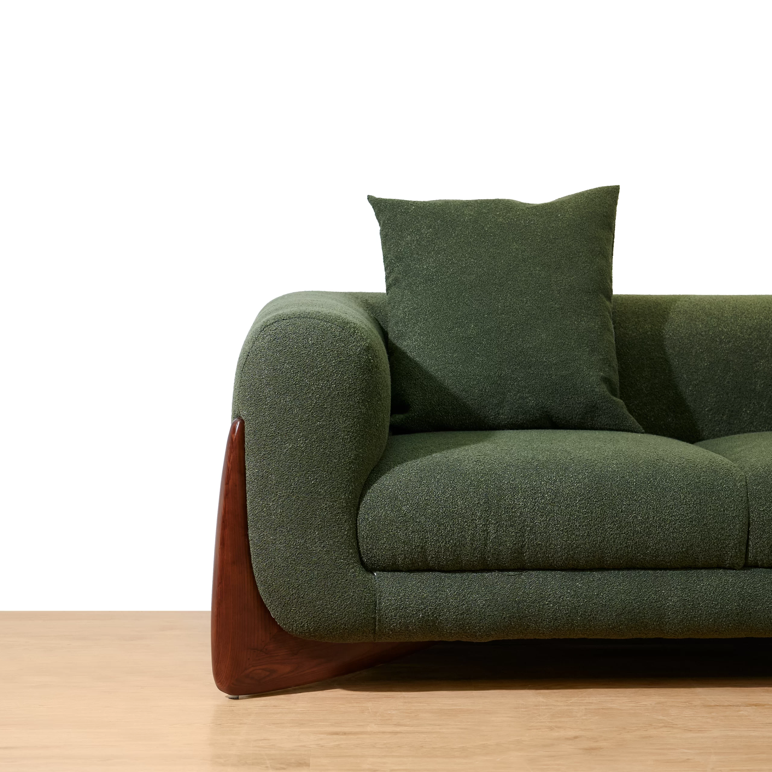 SOFTBAY là mẫu sofa “ôm trọn” người ngồi với phần tay – lưng liền khối, bo tròn dày dặn và chiều cao vừa phải. Phiên bản màu xanh rêu trên nền vải Bouclé đem lại cảm giác rất êm mắt, mềm nhưng không “bánh bèo”, phù hợp cả không gian hiện đại lẫn pha chút retro. Điểm nhận diện của SOFTBAY nằm ở ốp gỗ hai bên hông: các mảng gỗ tự nhiên được tiện bo cong, ôm lấy phần đệm như một khung đỡ điêu khắc, nhìn ngang rất ấn tượng. Tổng thể sofa thấp, sâu, mời gọi bạn ngả lưng đọc sách, xem phim hoặc trò chuyện thư giãn.