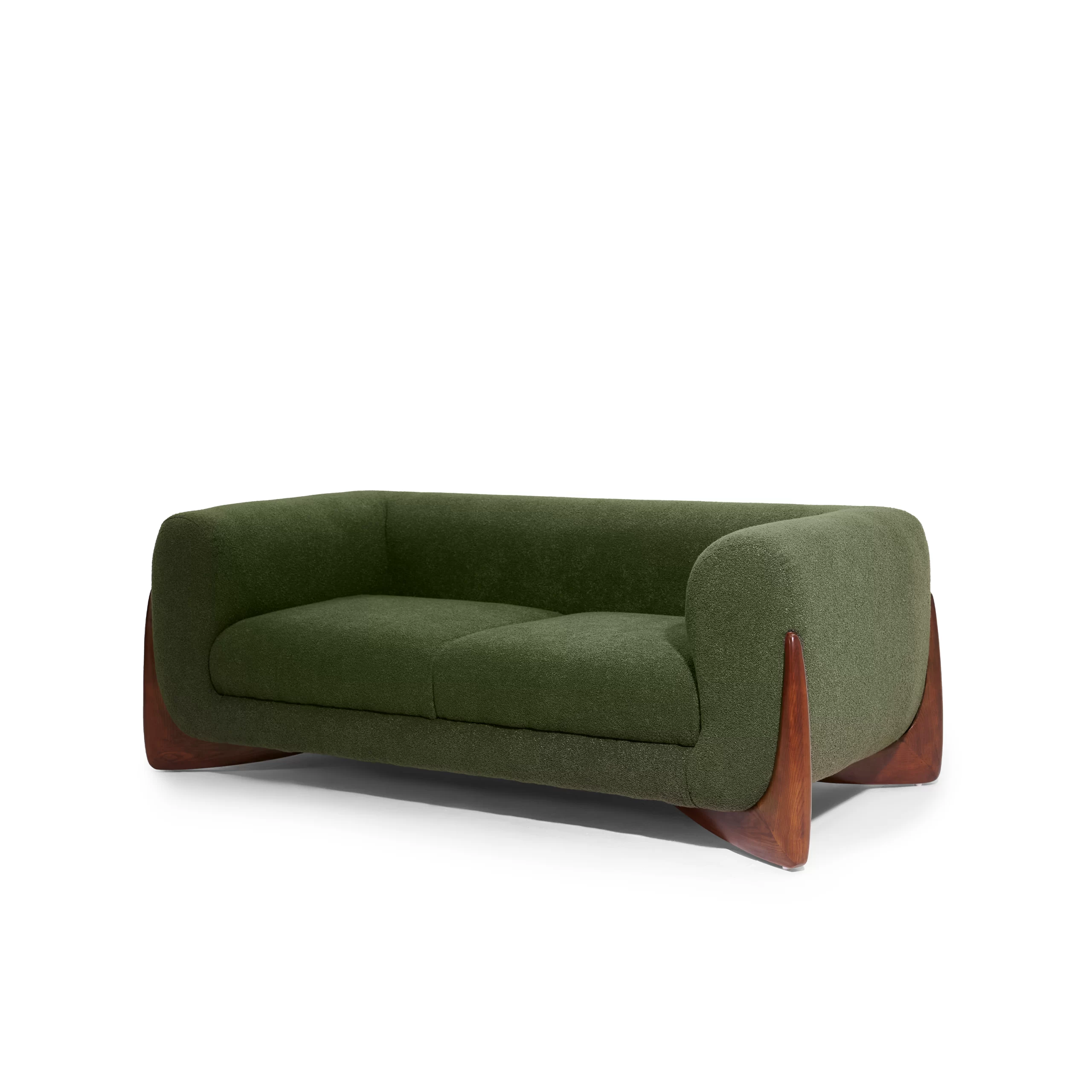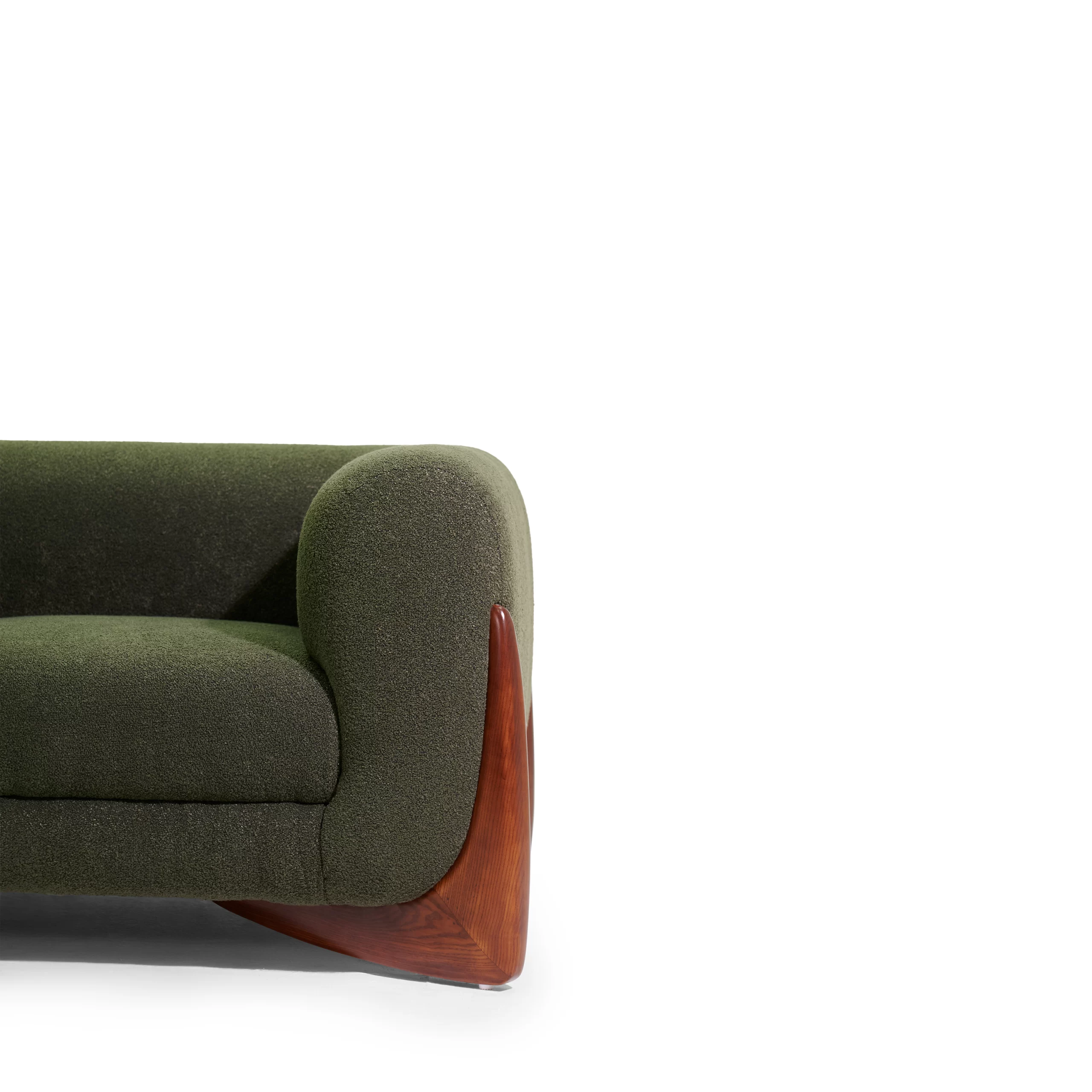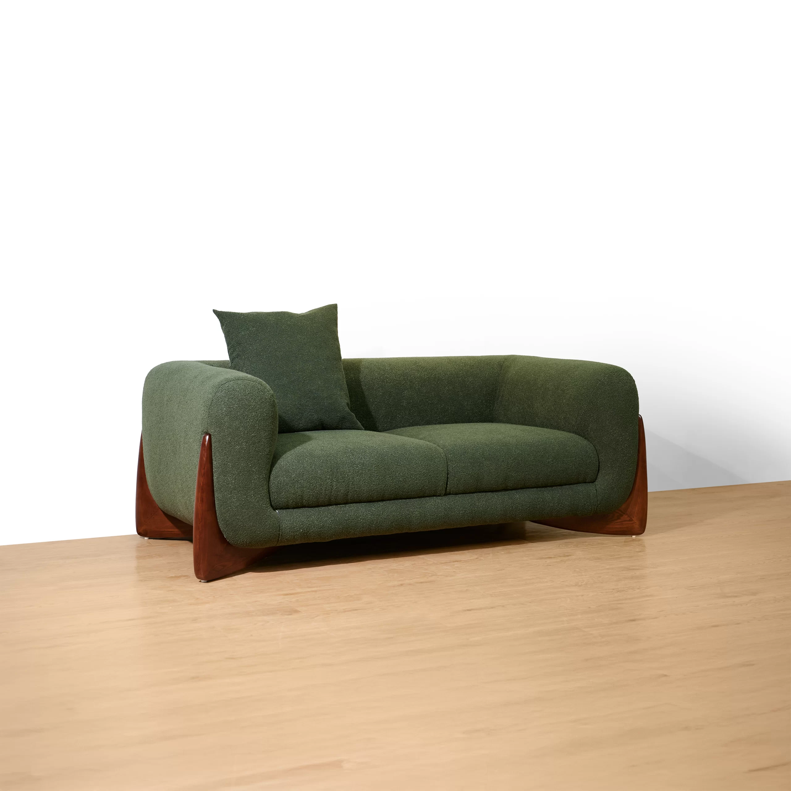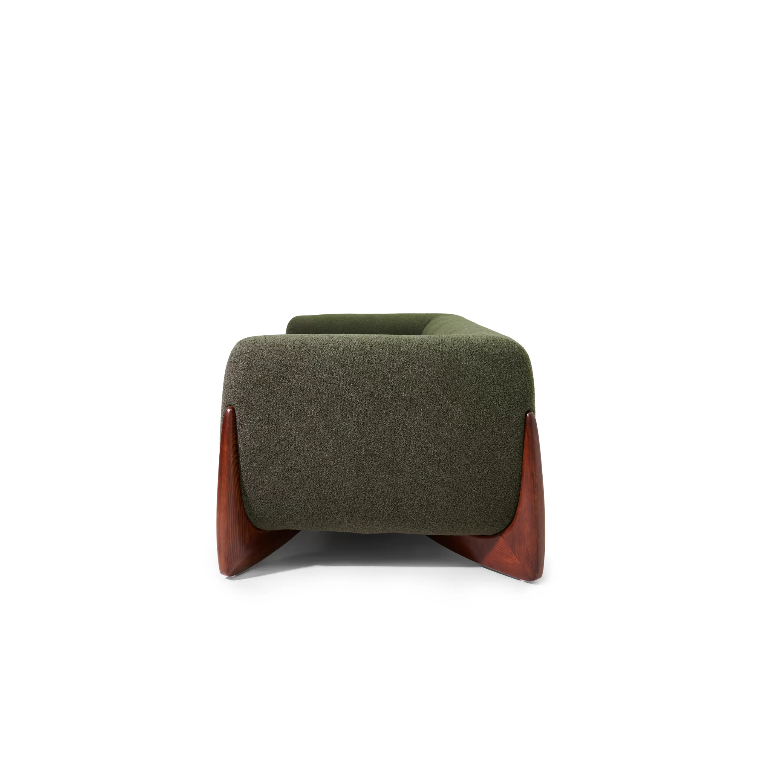 SOFTBAY là mẫu sofa “ôm trọn” người ngồi với phần tay – lưng liền khối, bo tròn dày dặn và chiều cao vừa phải. Phiên bản màu xanh rêu trên nền vải Bouclé đem lại cảm giác rất êm mắt, mềm nhưng không “bánh bèo”, phù hợp cả không gian hiện đại lẫn pha chút retro. Điểm nhận diện của SOFTBAY nằm ở ốp gỗ hai bên hông: các mảng gỗ tự nhiên được tiện bo cong, ôm lấy phần đệm như một khung đỡ điêu khắc, nhìn ngang rất ấn tượng. Tổng thể sofa thấp, sâu, mời gọi bạn ngả lưng đọc sách, xem phim hoặc trò chuyện thư giãn.