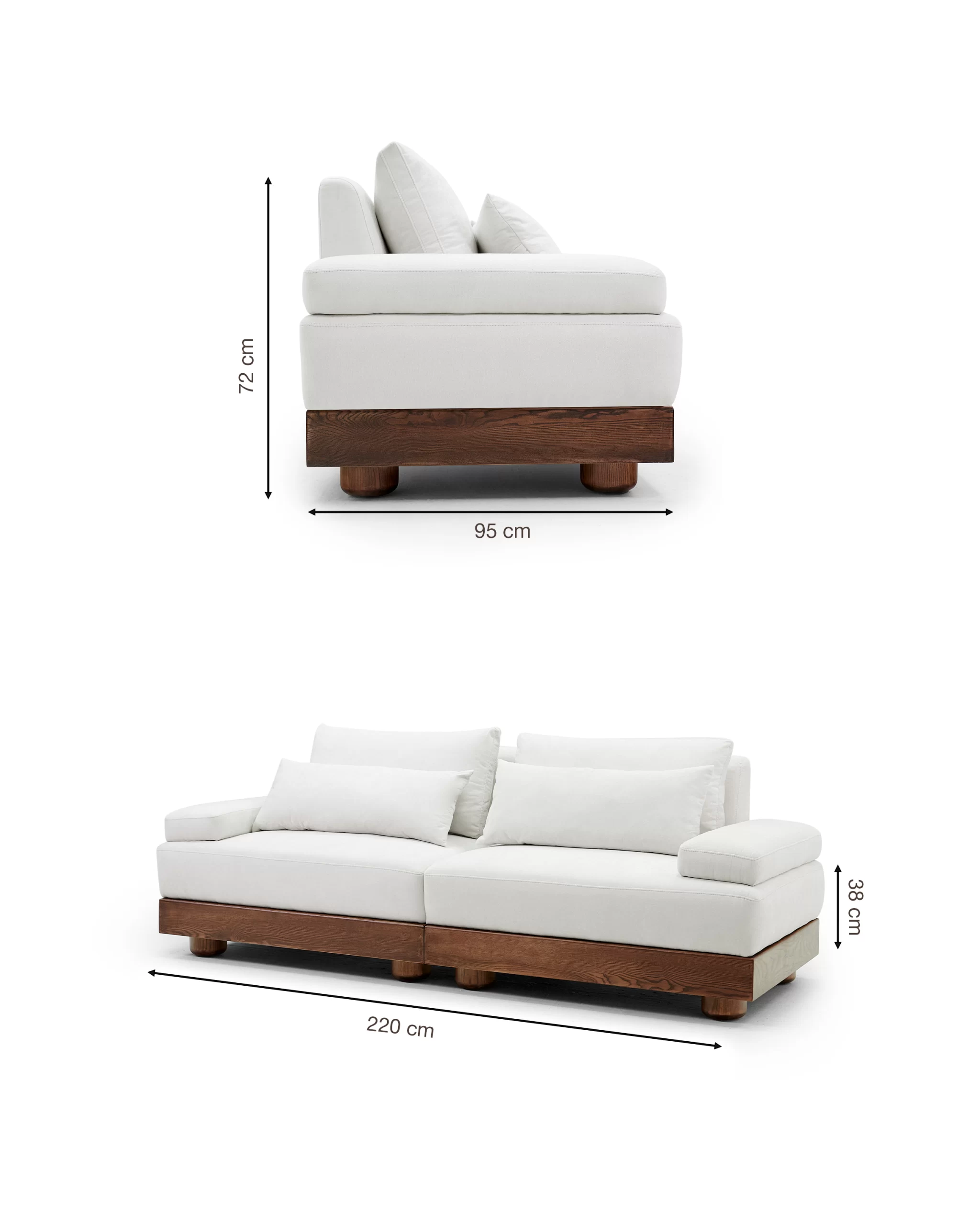 Bệ gỗ Tần bì tự nhiên với tông nâu óc chó ấm áp tạo điểm nhấn thị giác độc đáo. Bên trong, khung gỗ Sồi sấy khô kết hợp plywood đạt chuẩn nội thất bền vững đảm bảo độ vững chắc theo thời gian. Hệ thống đệm K43 kết hợp lò xo cối mang lại độ nâng đỡ tối ưu và cảm giác êm ái lâu dài. Đệm tựa lưng và tay vịn thiết kế rời giúp bạn tùy chỉnh độ êm theo sở thích cá nhân.