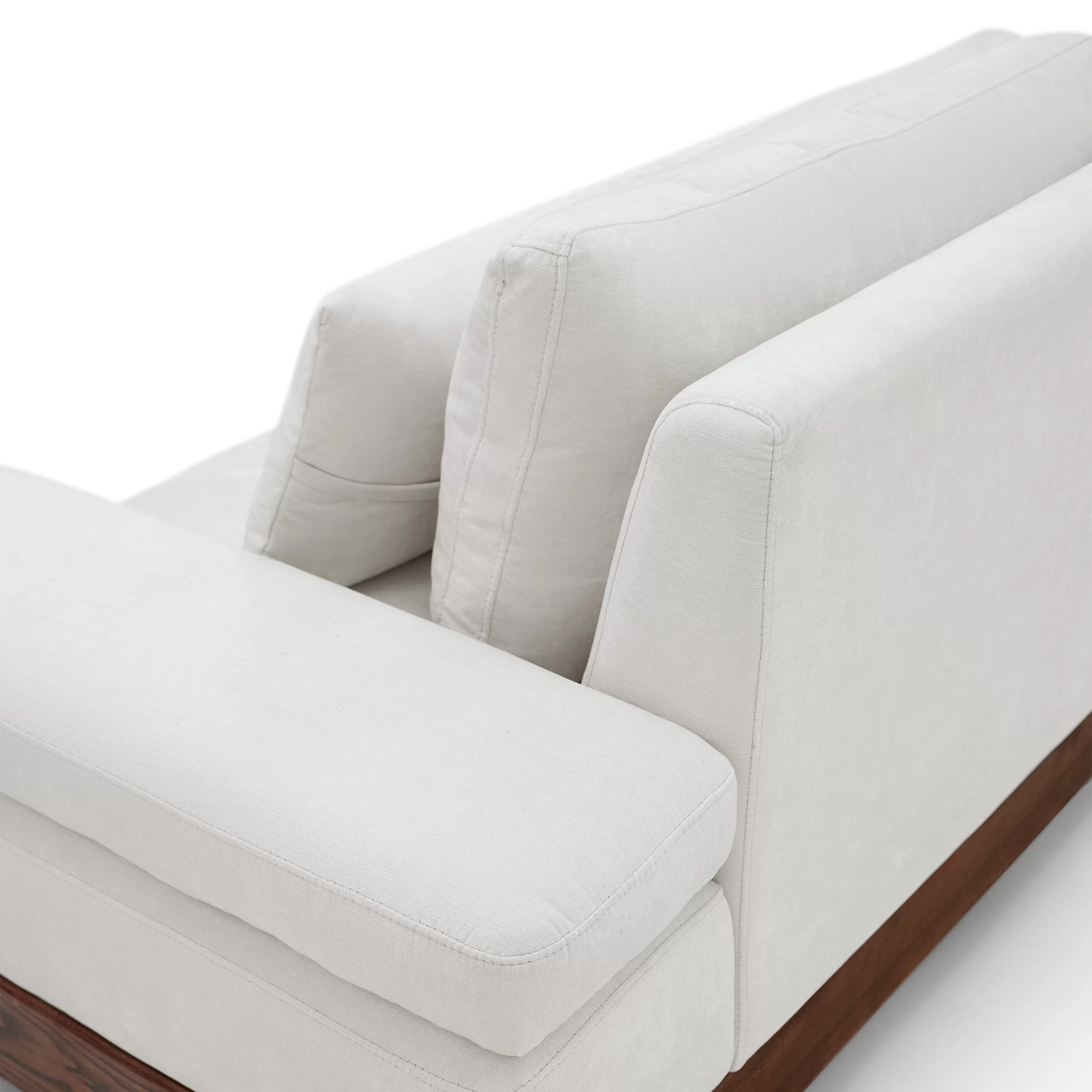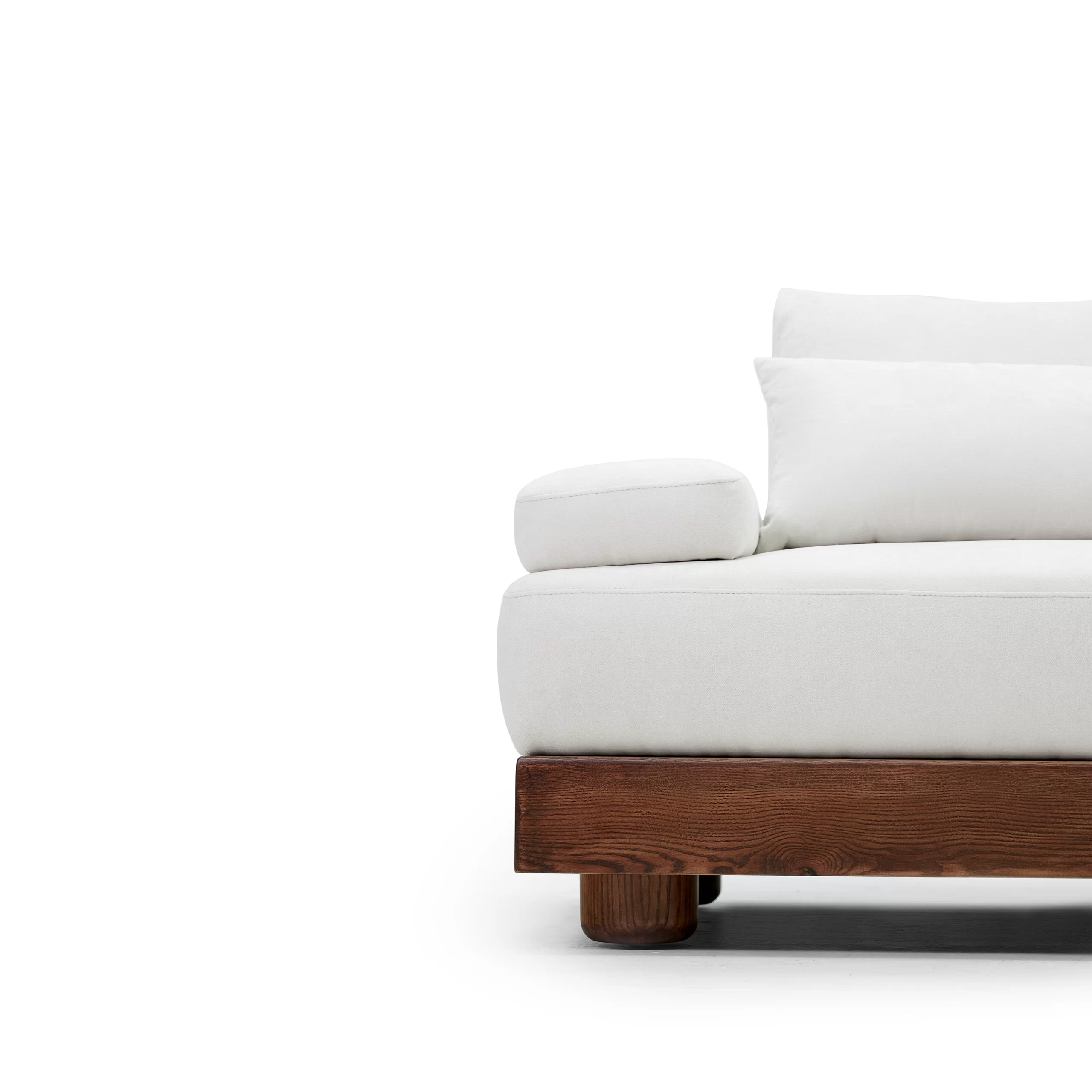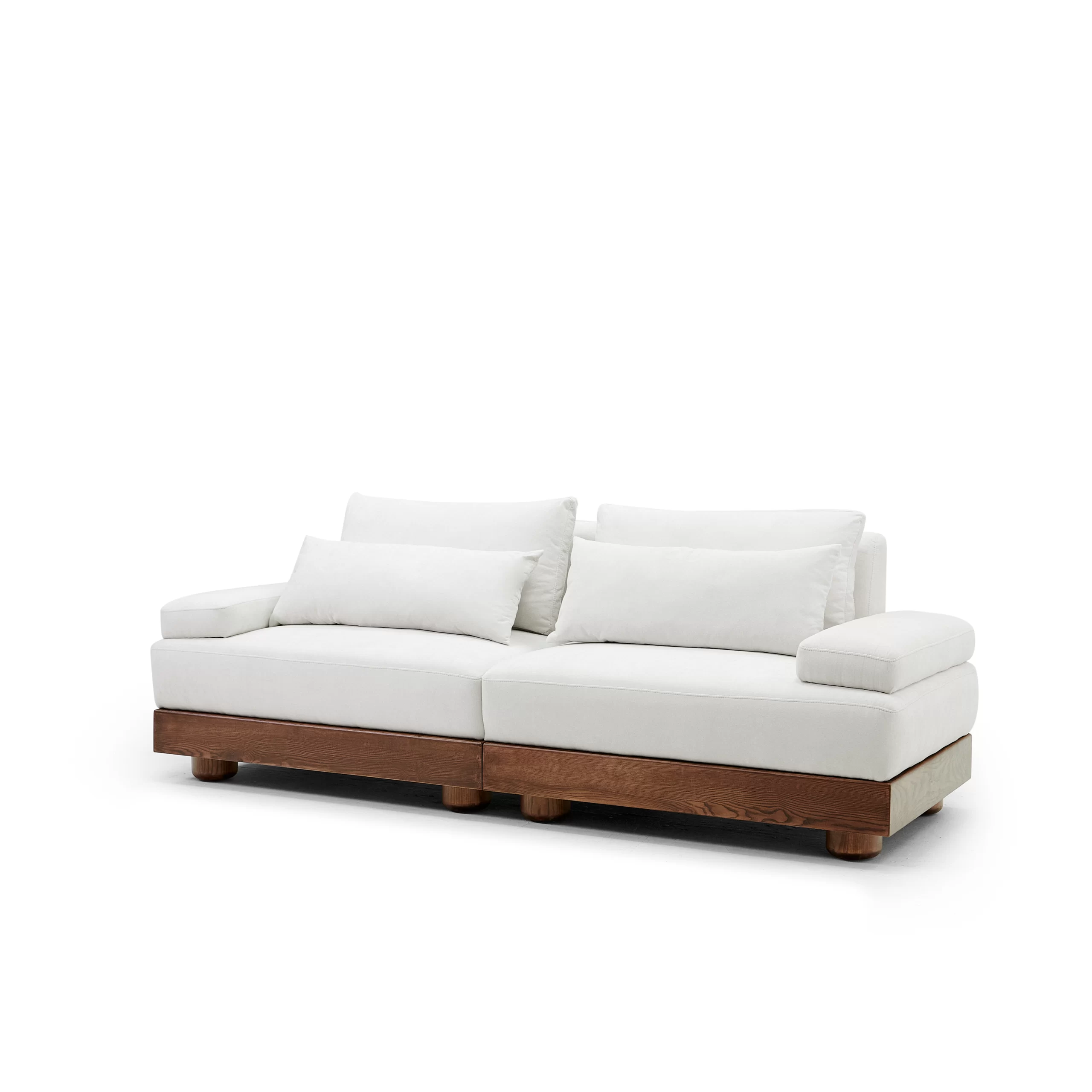 Bệ gỗ Tần bì tự nhiên với tông nâu óc chó ấm áp tạo điểm nhấn thị giác độc đáo. Bên trong, khung gỗ Sồi sấy khô kết hợp plywood đạt chuẩn nội thất bền vững đảm bảo độ vững chắc theo thời gian. Hệ thống đệm K43 kết hợp lò xo cối mang lại độ nâng đỡ tối ưu và cảm giác êm ái lâu dài. Đệm tựa lưng và tay vịn thiết kế rời giúp bạn tùy chỉnh độ êm theo sở thích cá nhân.